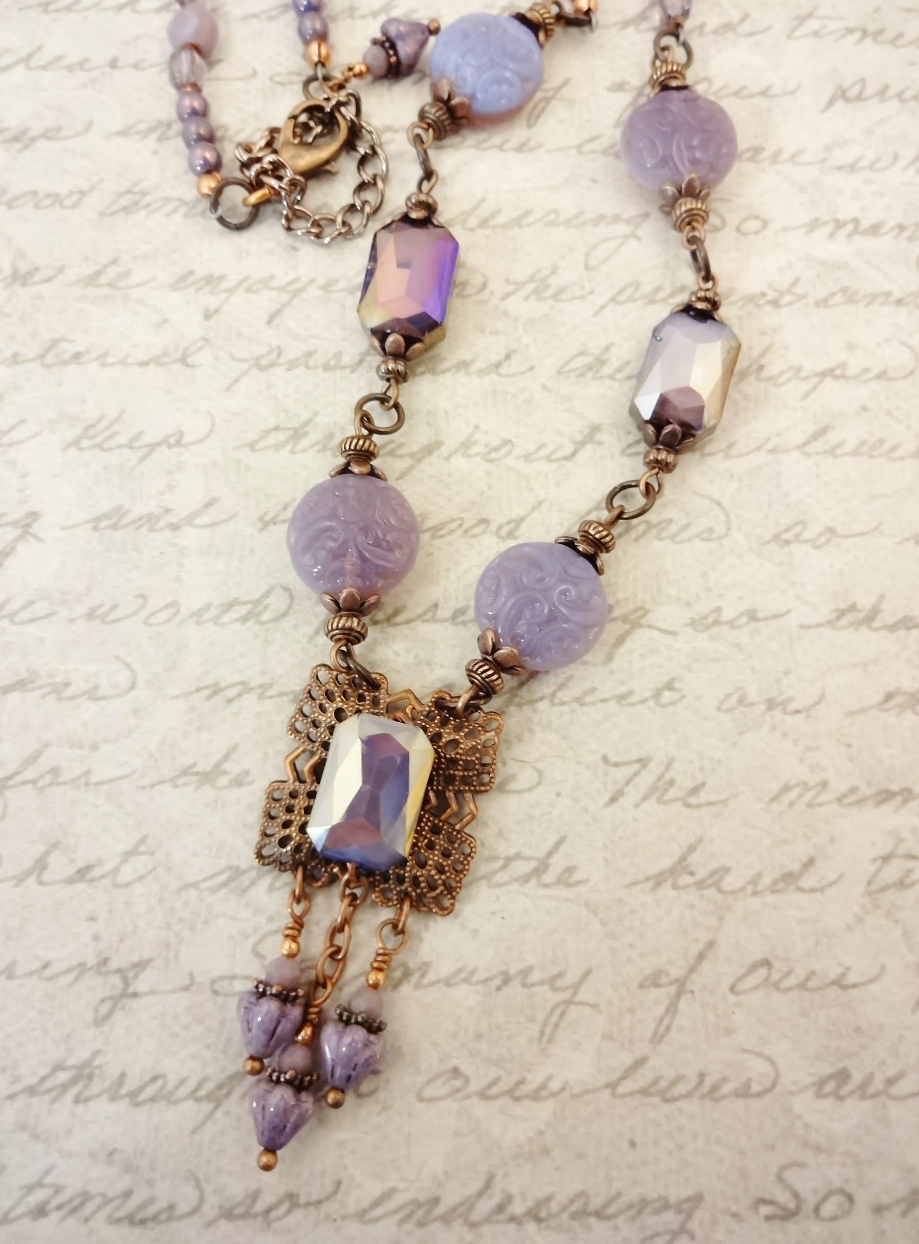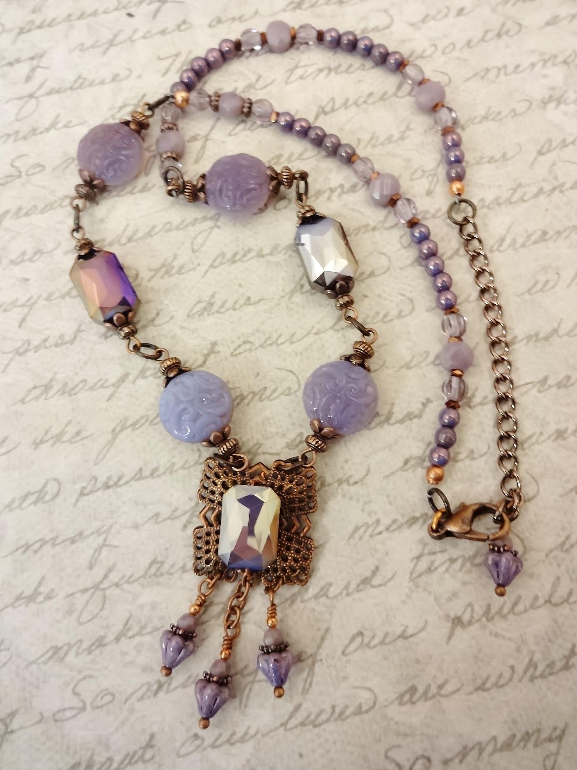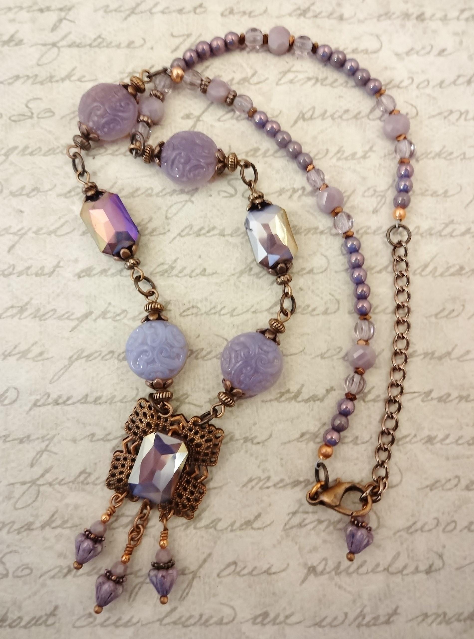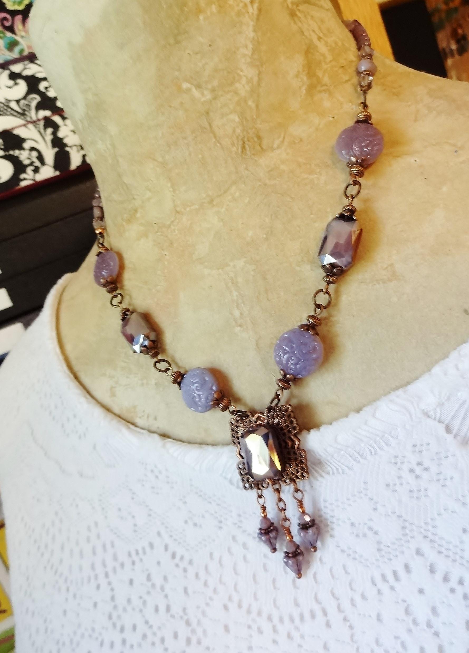 This necklace is a gorgeous combination of high-quality glass in shades of lavender that I paired with an antique copper filigree square, flower bead caps, ribbed rondelles, wire and chain. With links of embossed coins and shiny rectangles, to tiny flower dangles to strands of melons, small coins and little rounds, this necklace has a variety of components that combine into a beautiful whole.