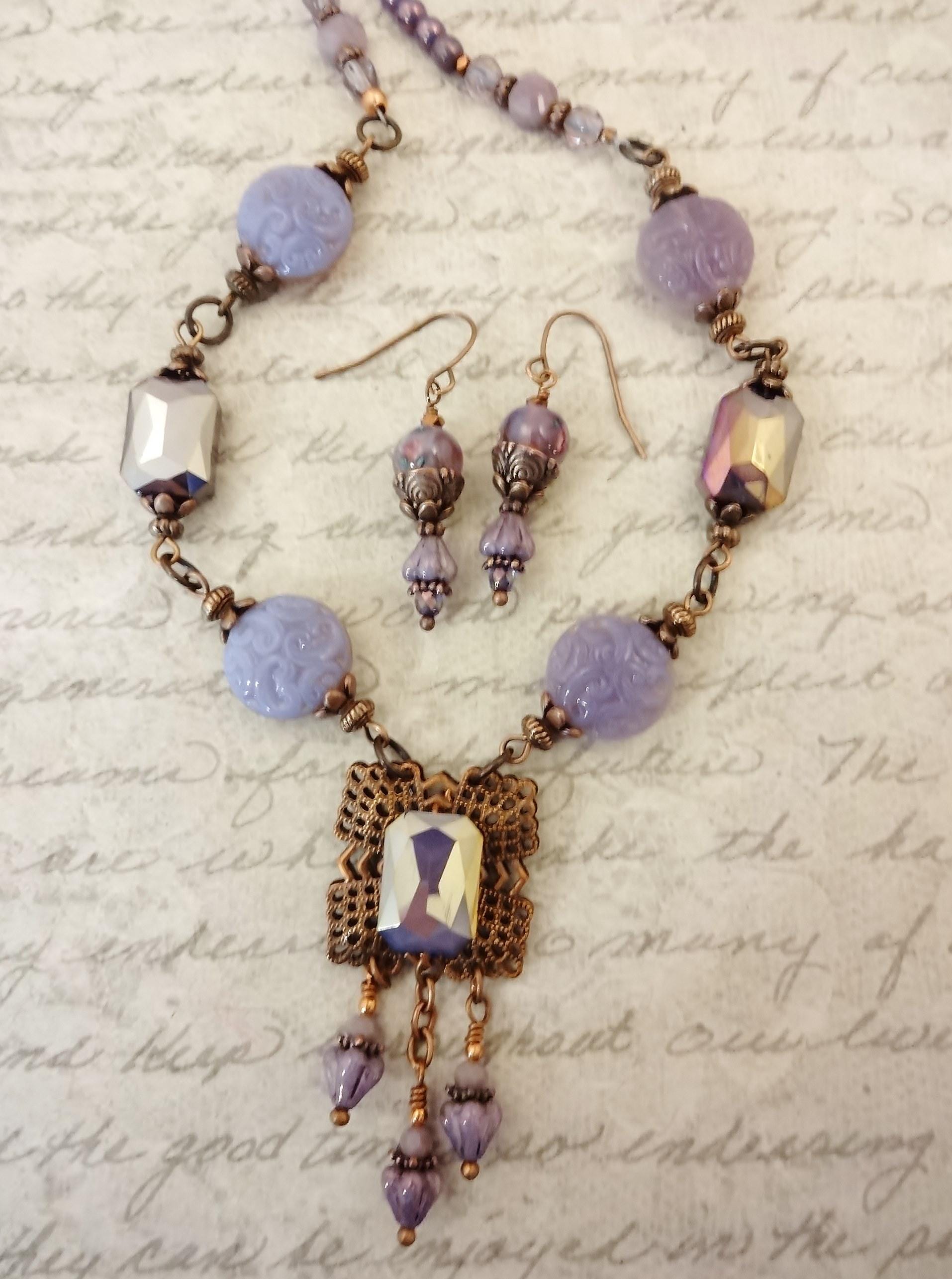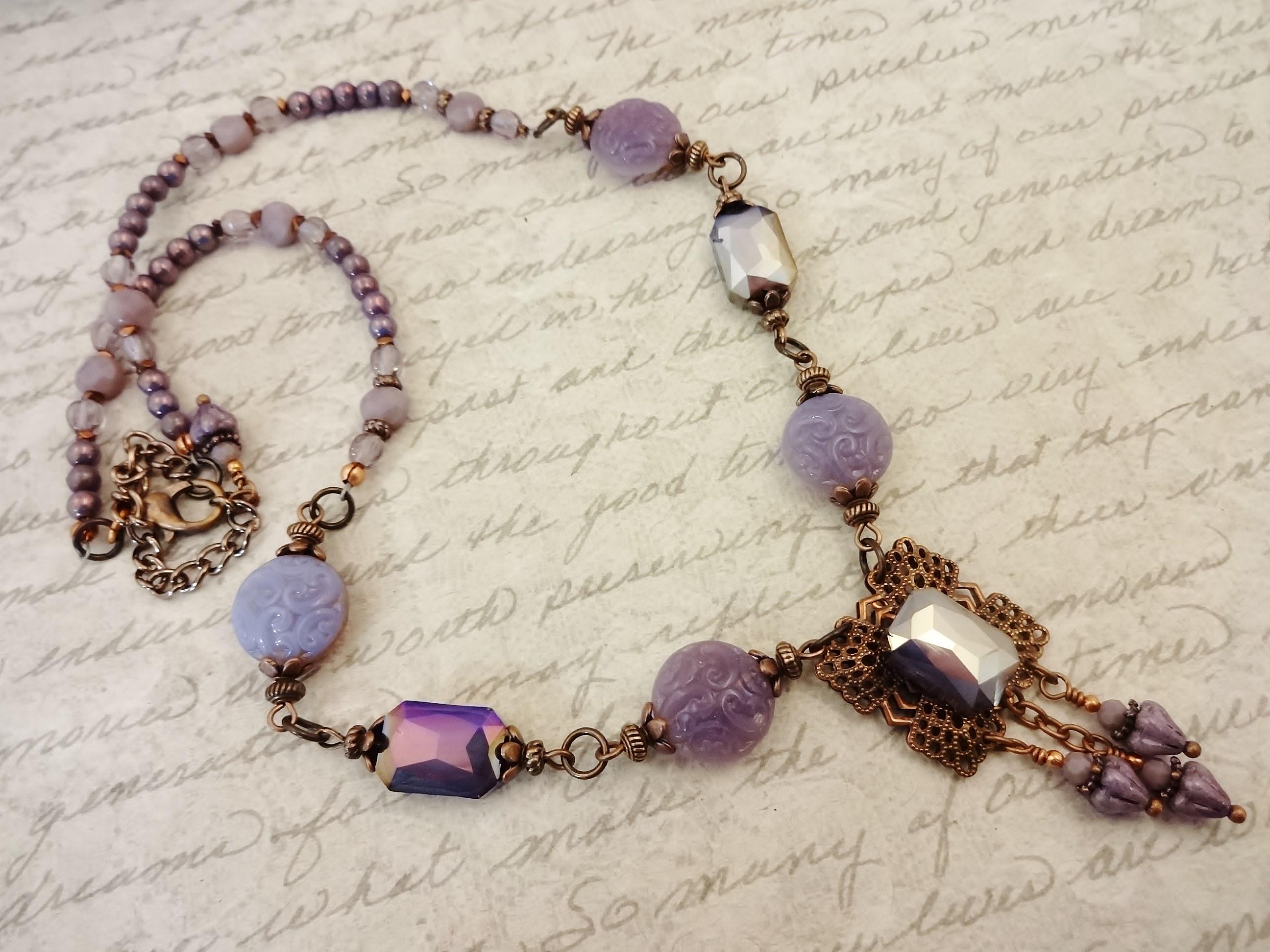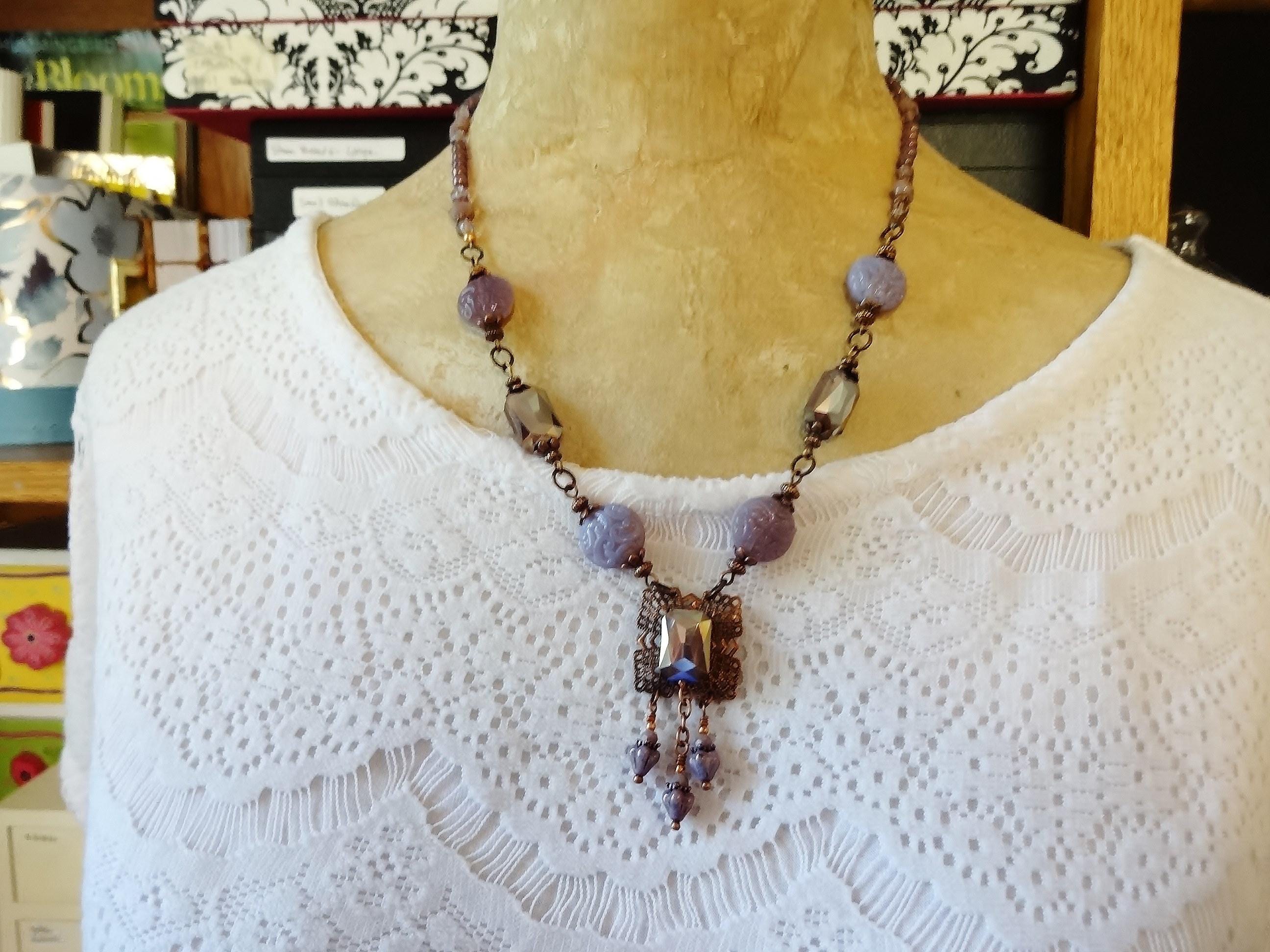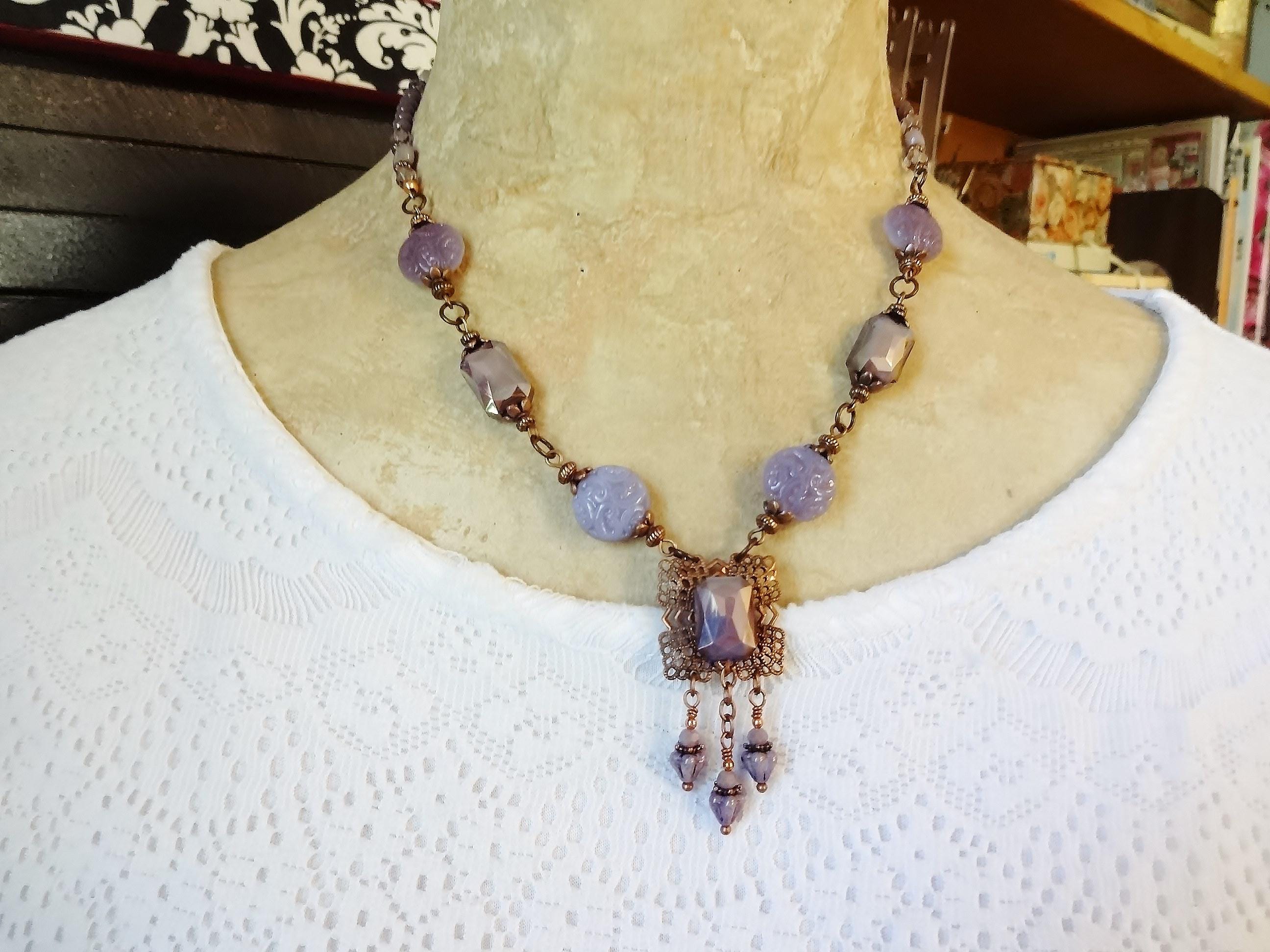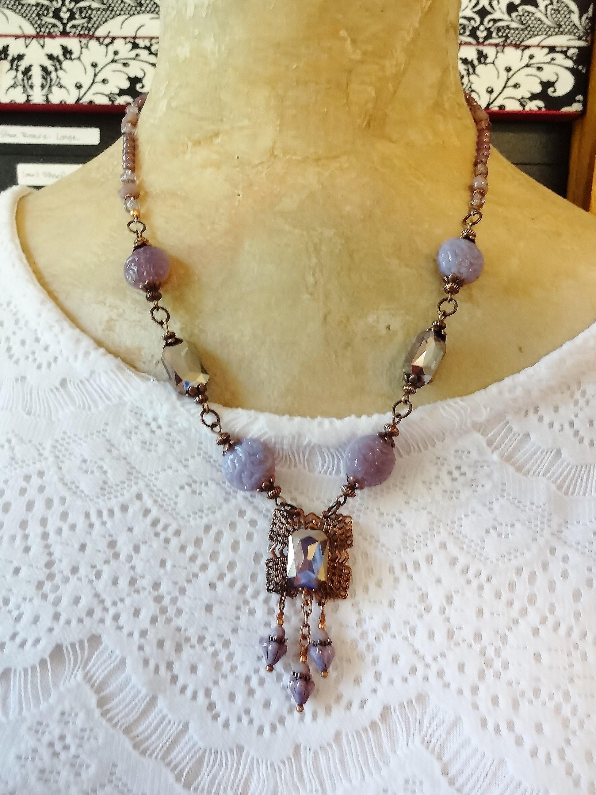 This necklace is a gorgeous combination of high-quality glass in shades of lavender that I paired with an antique copper filigree square, flower bead caps, ribbed rondelles, wire and chain. With links of embossed coins and shiny rectangles, to tiny flower dangles to strands of melons, small coins and little rounds, this necklace has a variety of components that combine into a beautiful whole.