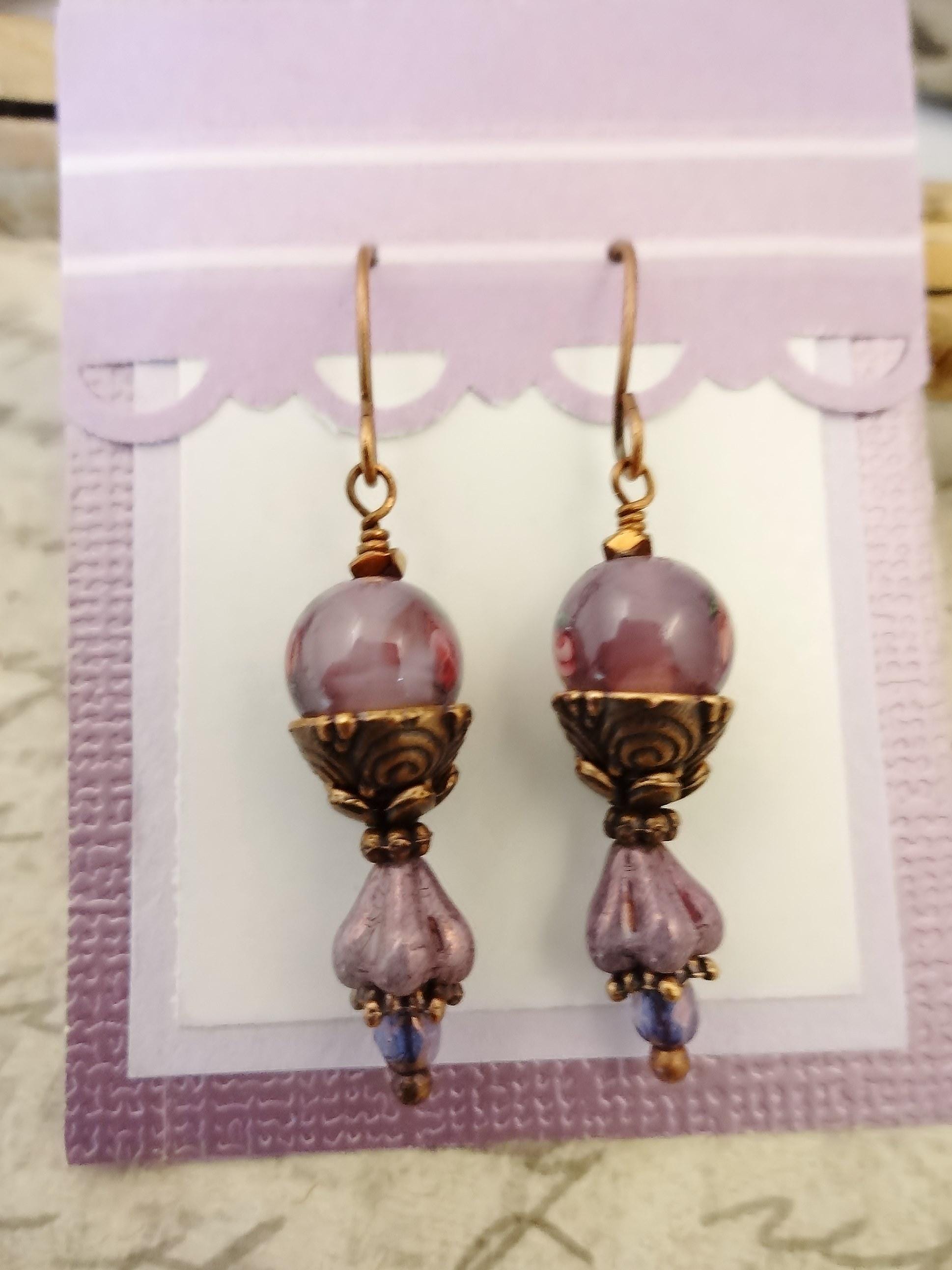 The earrings include Czech Glass flowers, antique copper bead caps and spacers plus 8mm Lampwork flower beads in lavender. Shown with antique copper plated steel ear wires. I do have lever back ear wires, just message me if you prefer that style. I also have 14k Gold Fill posts or lever back styles in the Add On Section.
