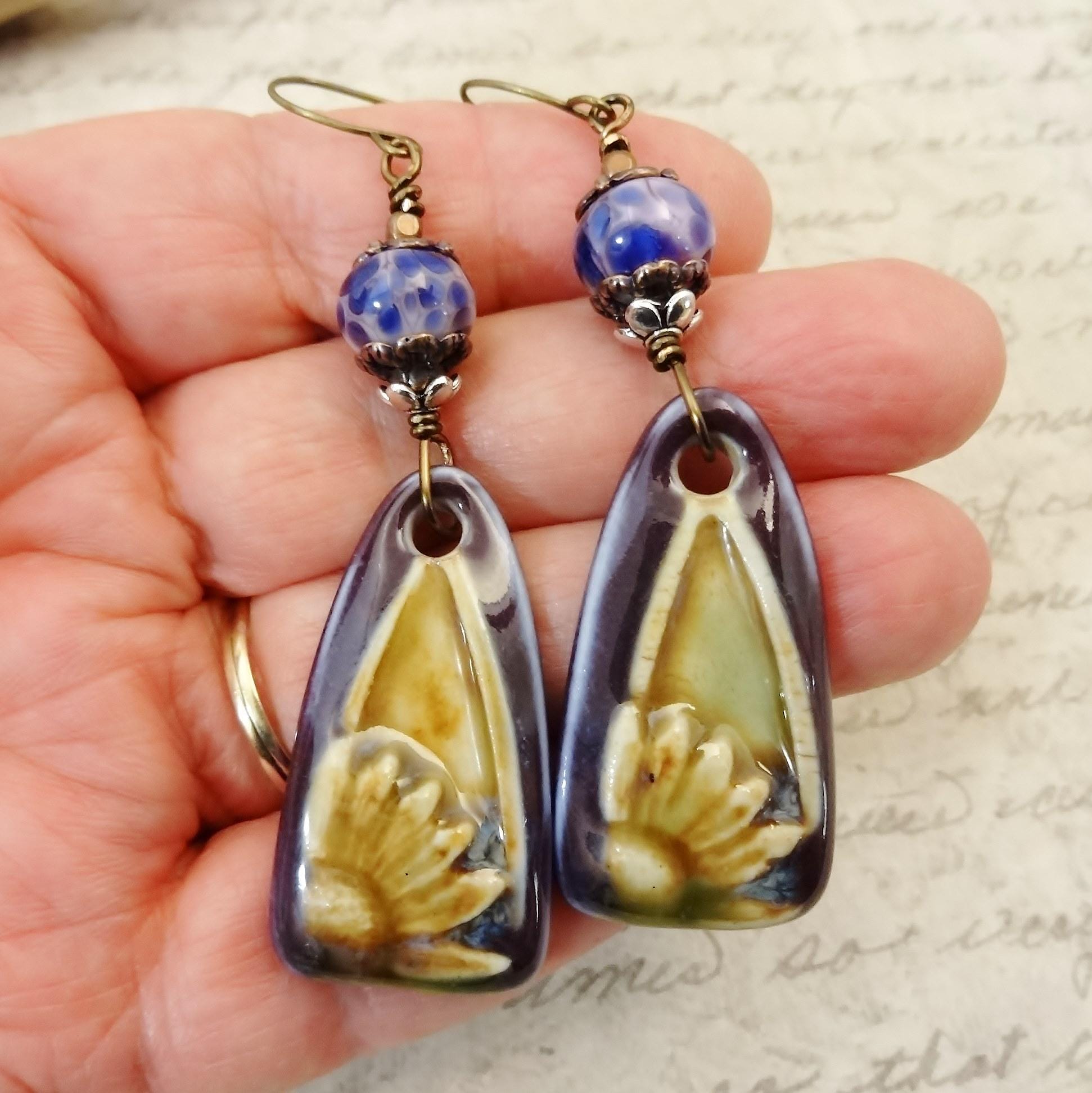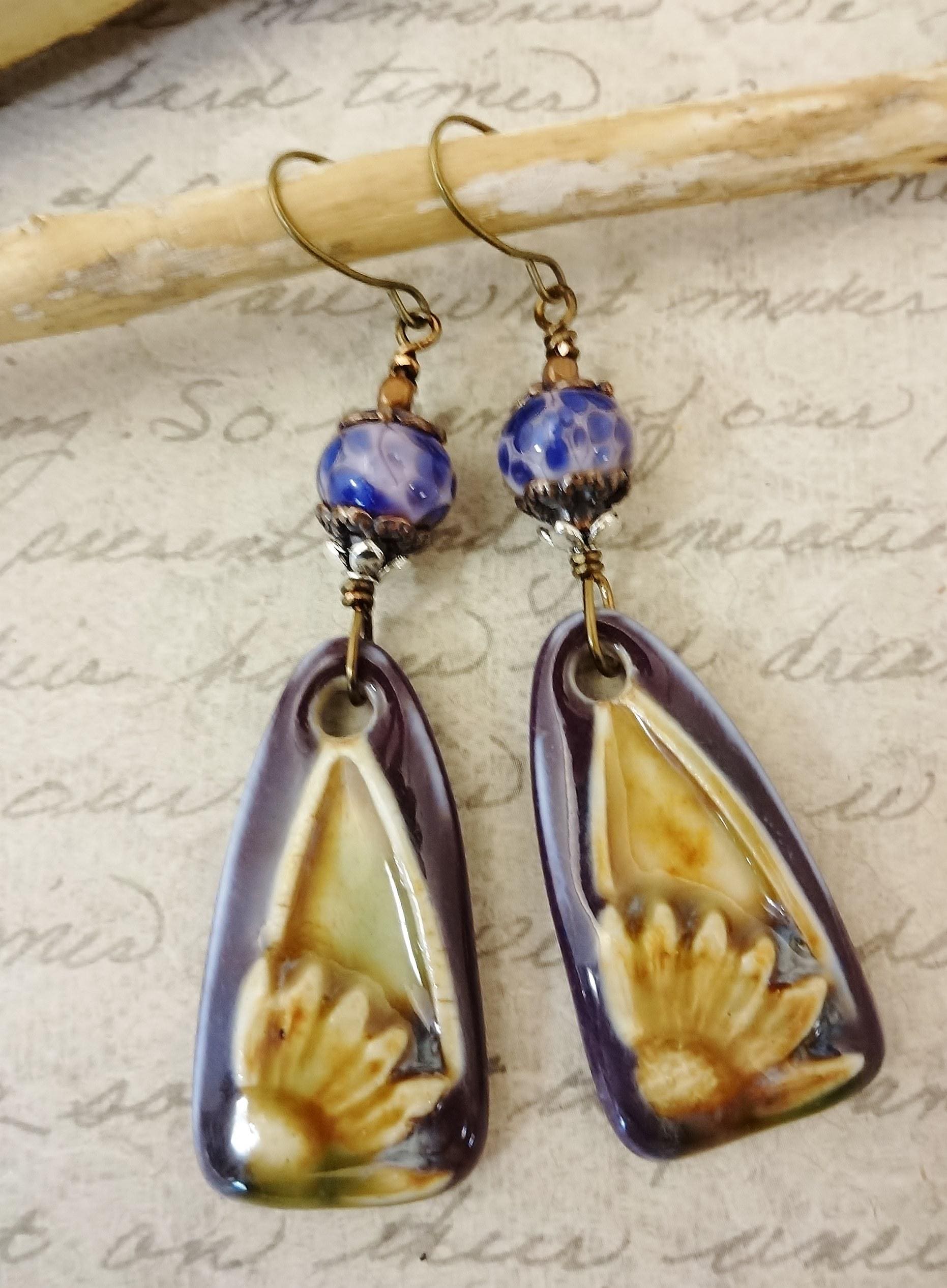 Bohemian Purple and Beige Ceramic Flower Earrings: Lampwork Glass