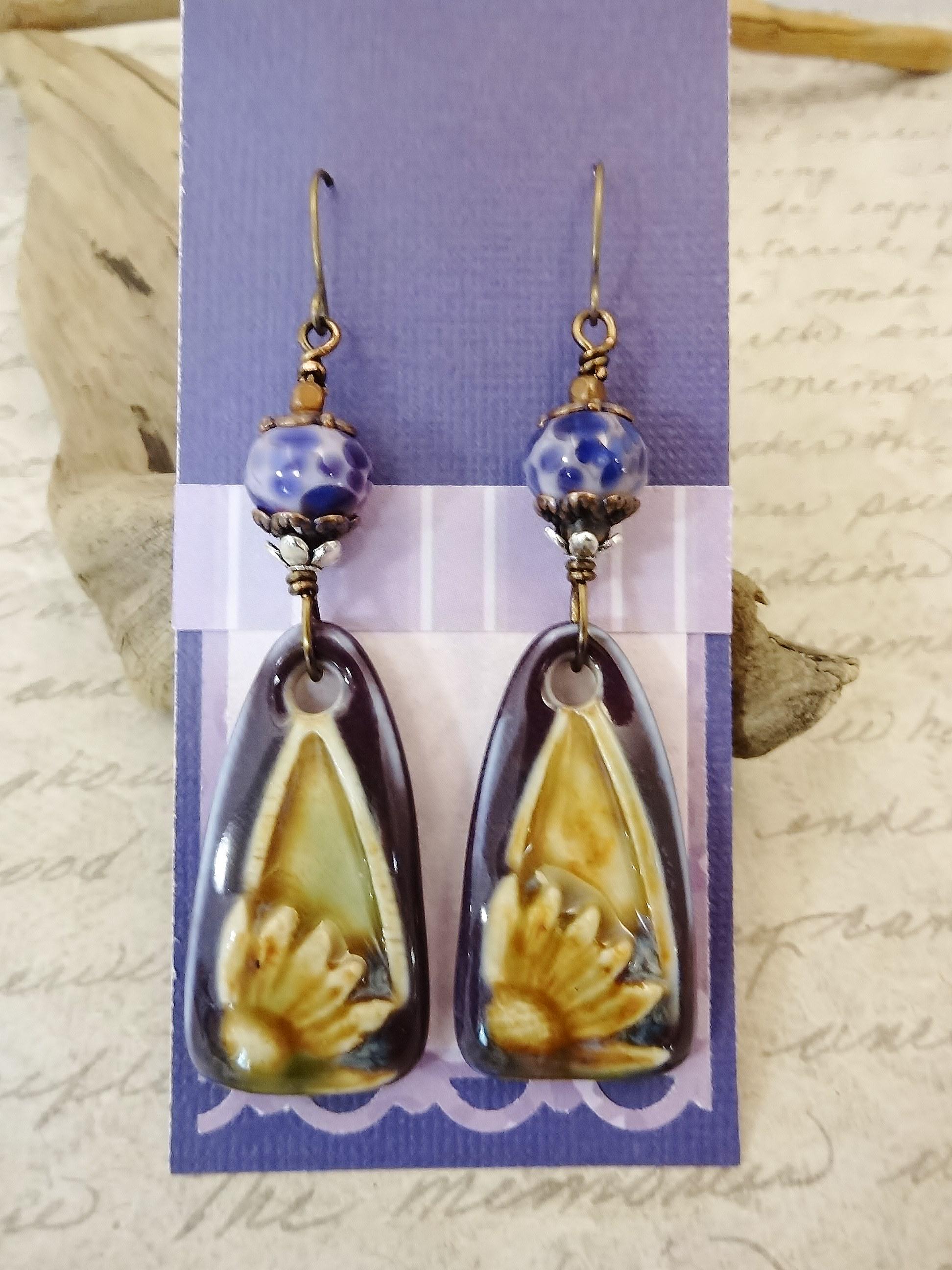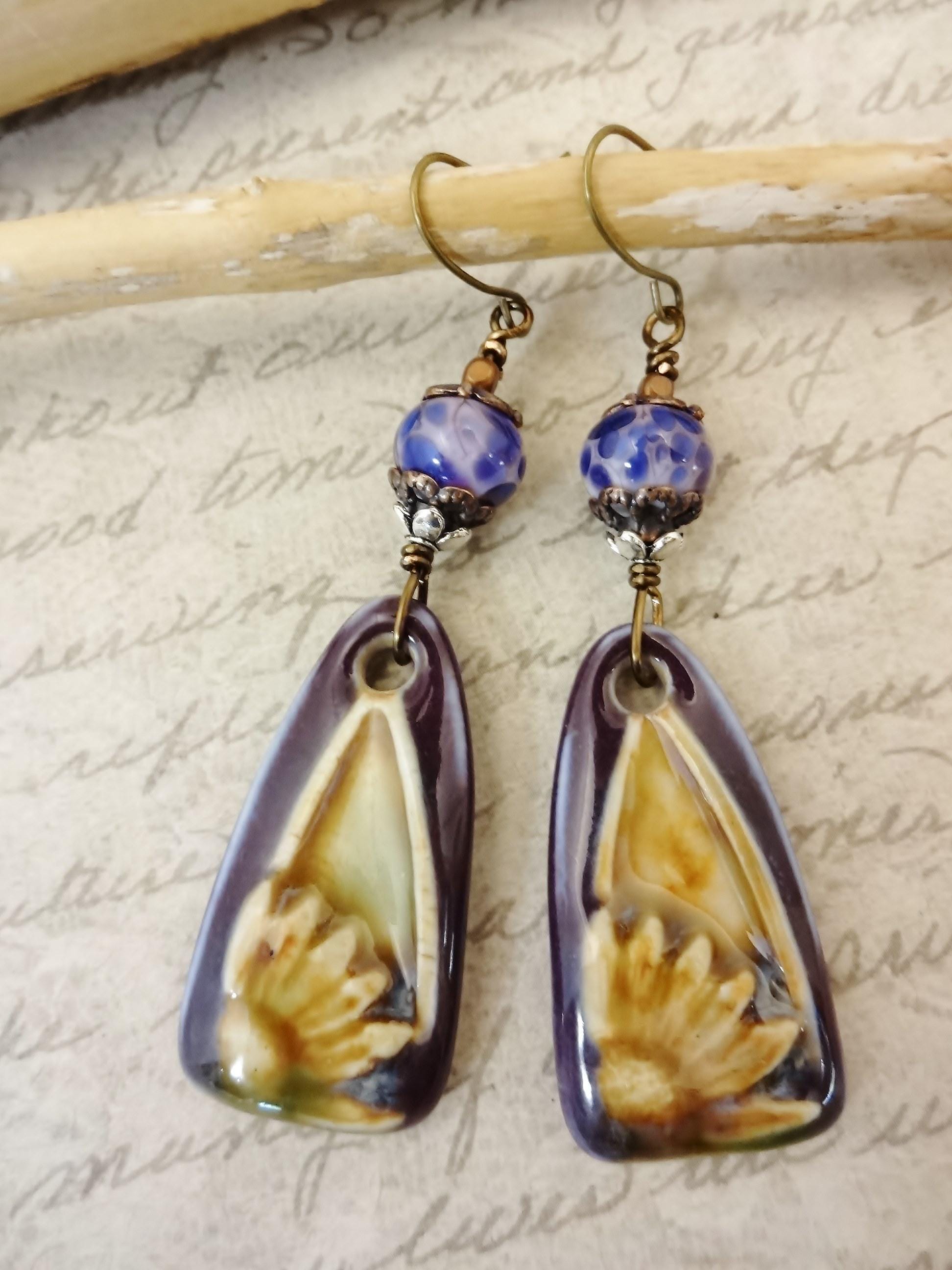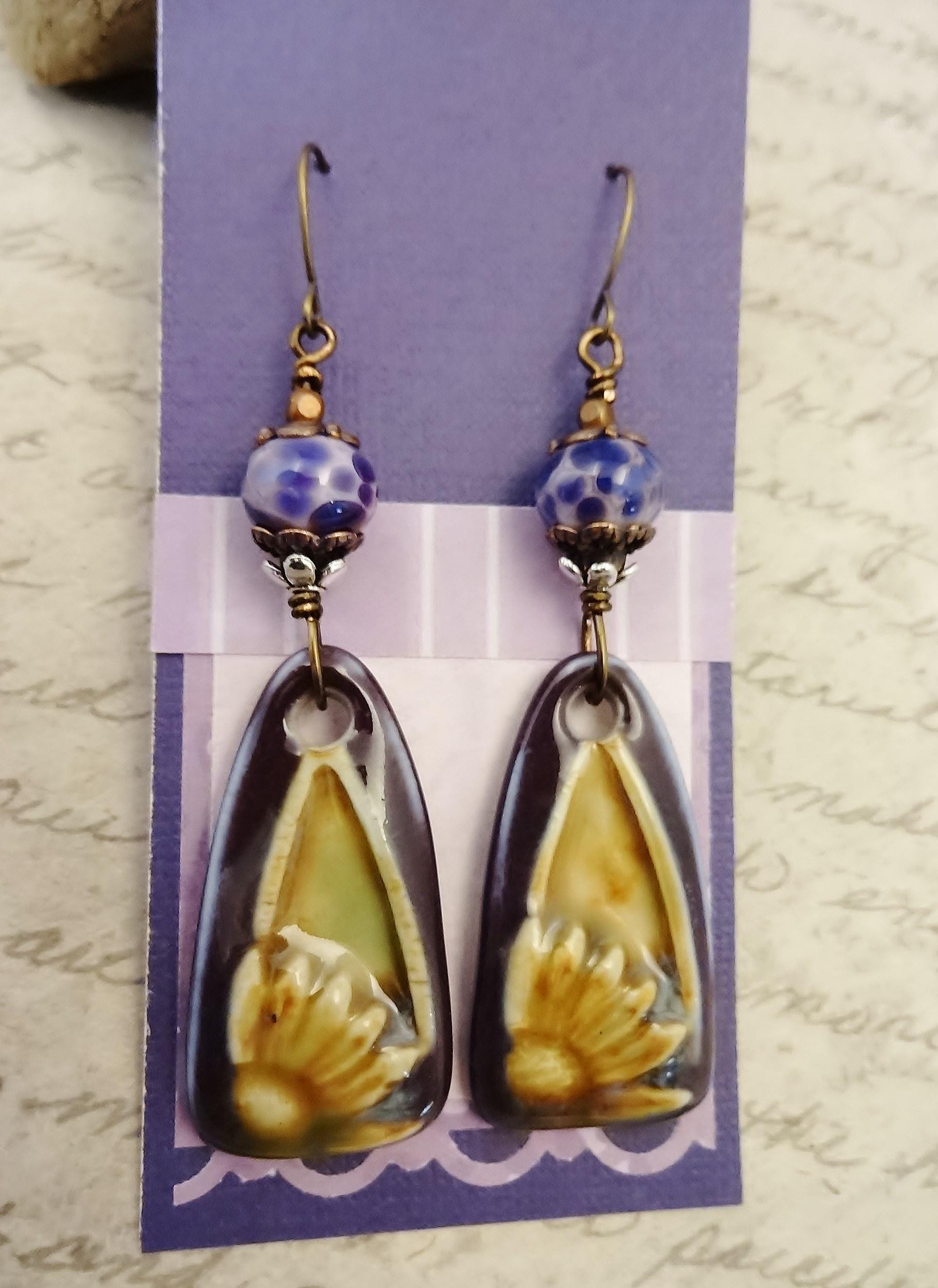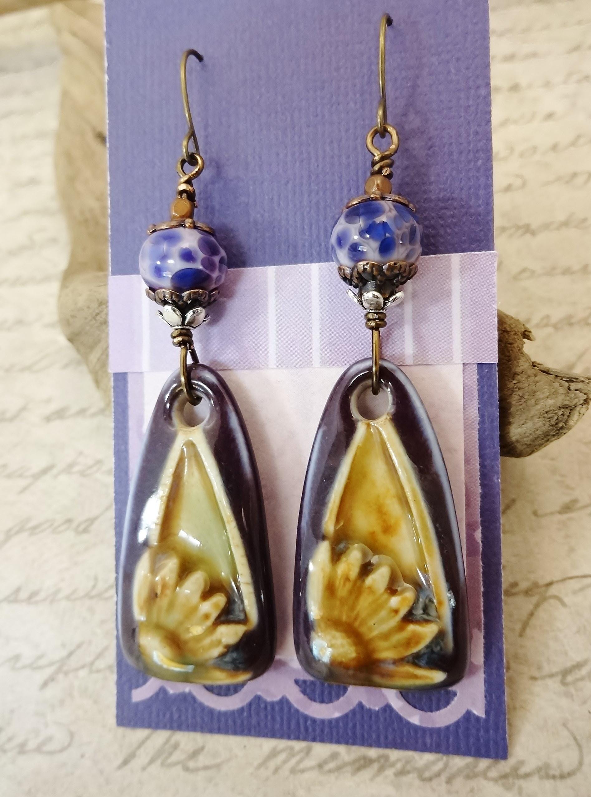 Gorgeous artisan Ceramic components by Mari Carmen Rodriguez Martinez of Majoyoal are the focal in these artisan earrings in shades of deep plum, brown and beige. So pretty!