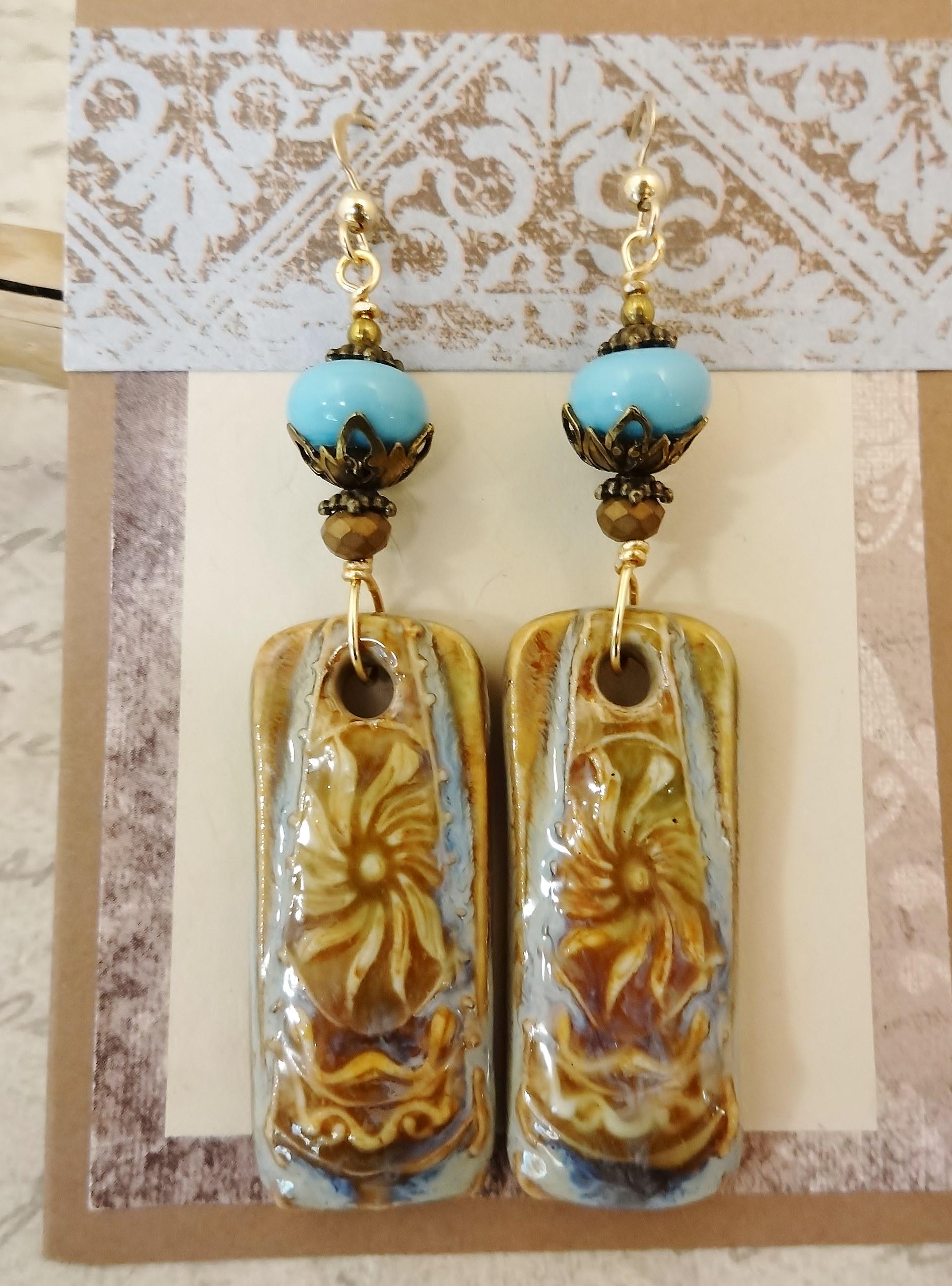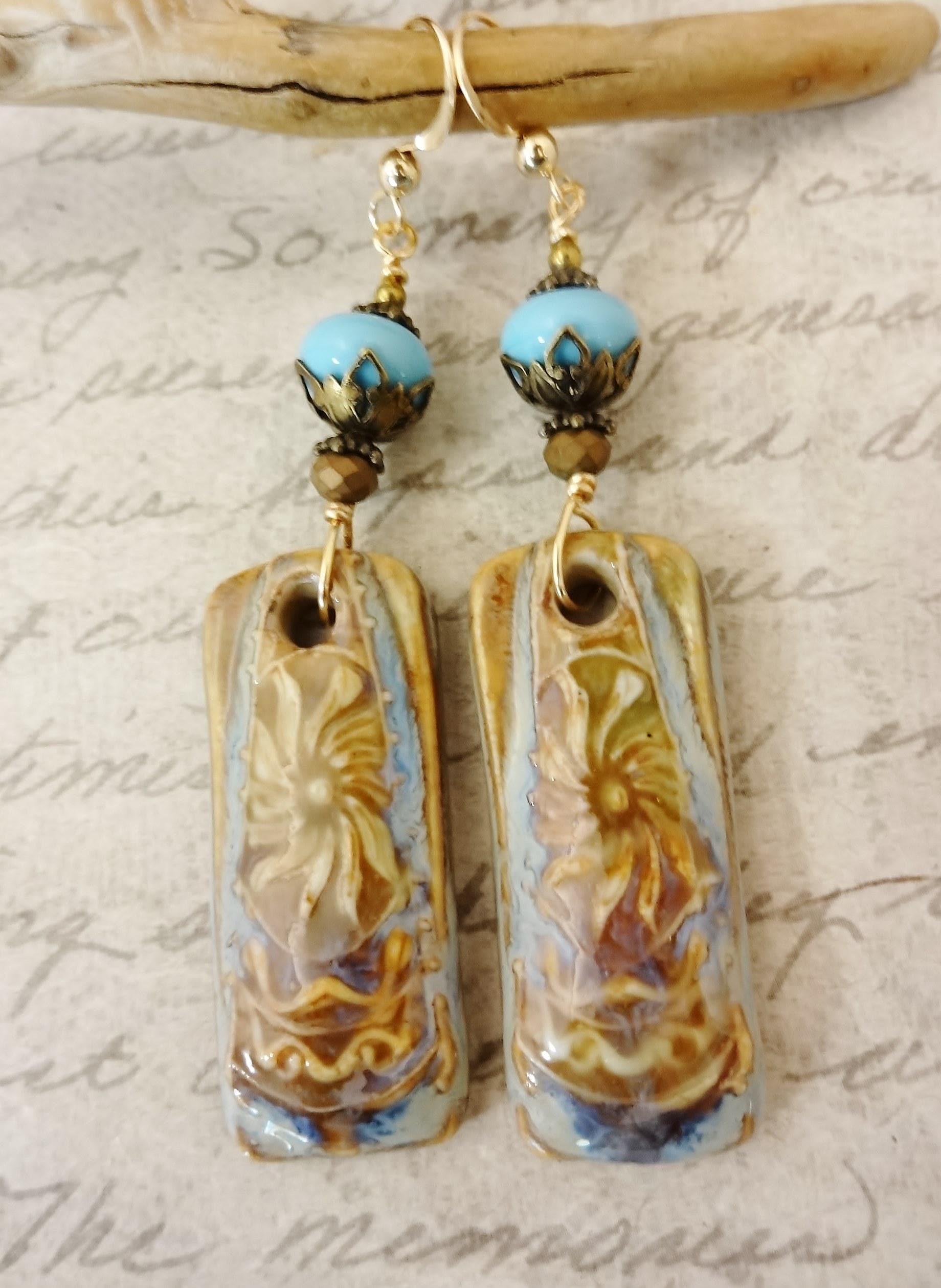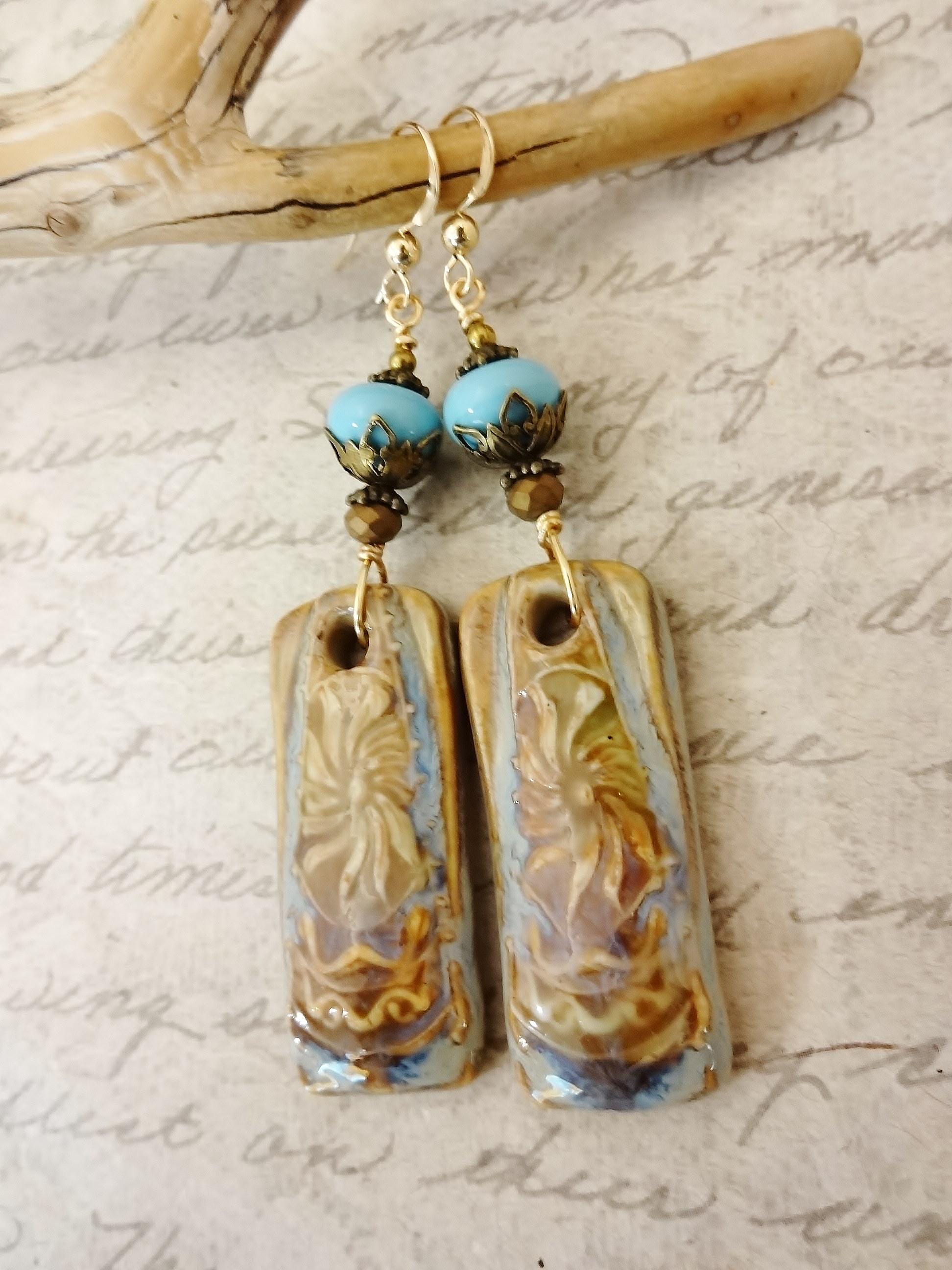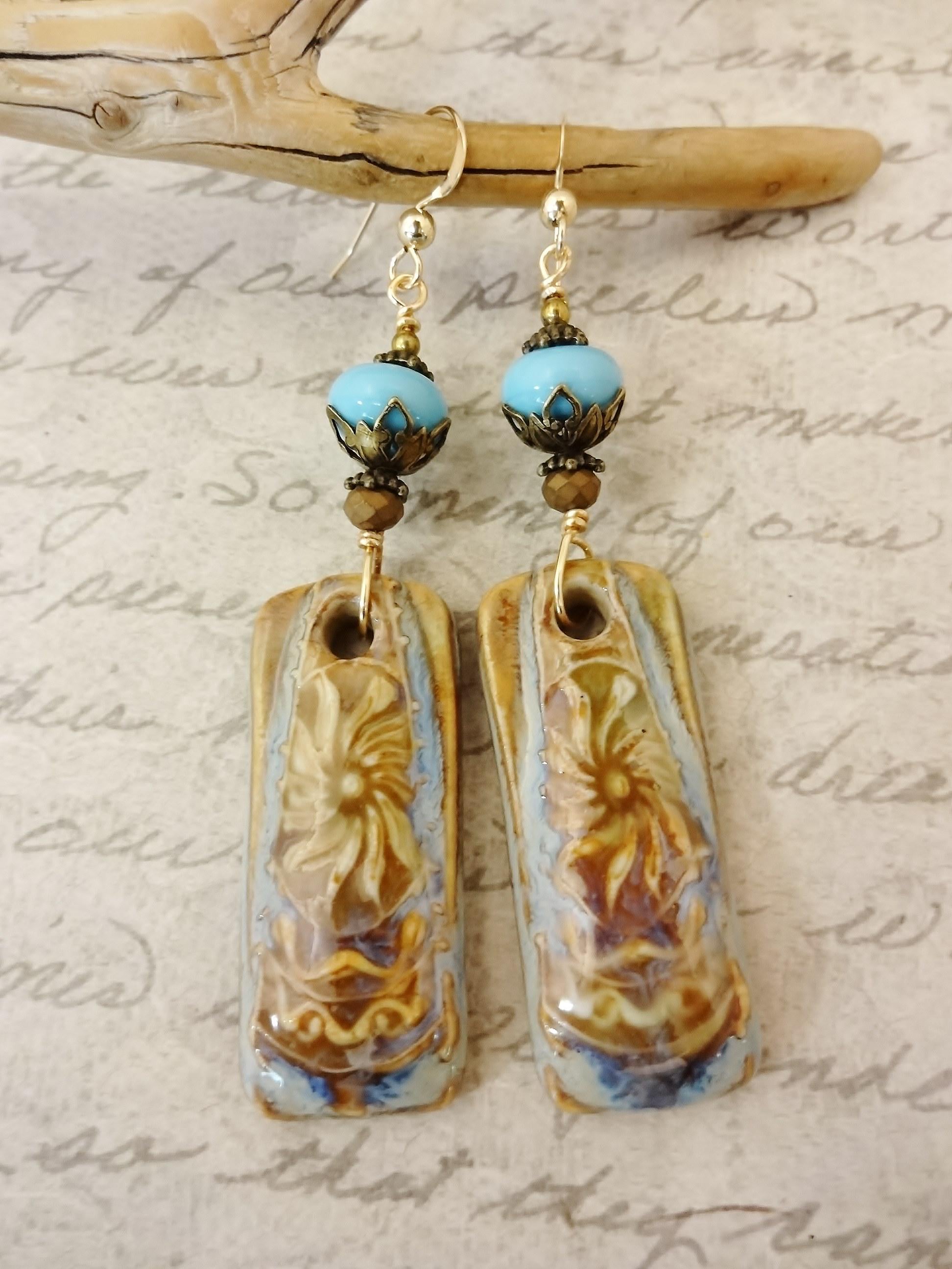 Gorgeous artisan Ceramic components by Mari Carmen Rodriguez Martinez of Majoyoal are the focal in these artisan earrings in shades of beige, caramel and blue. So pretty!