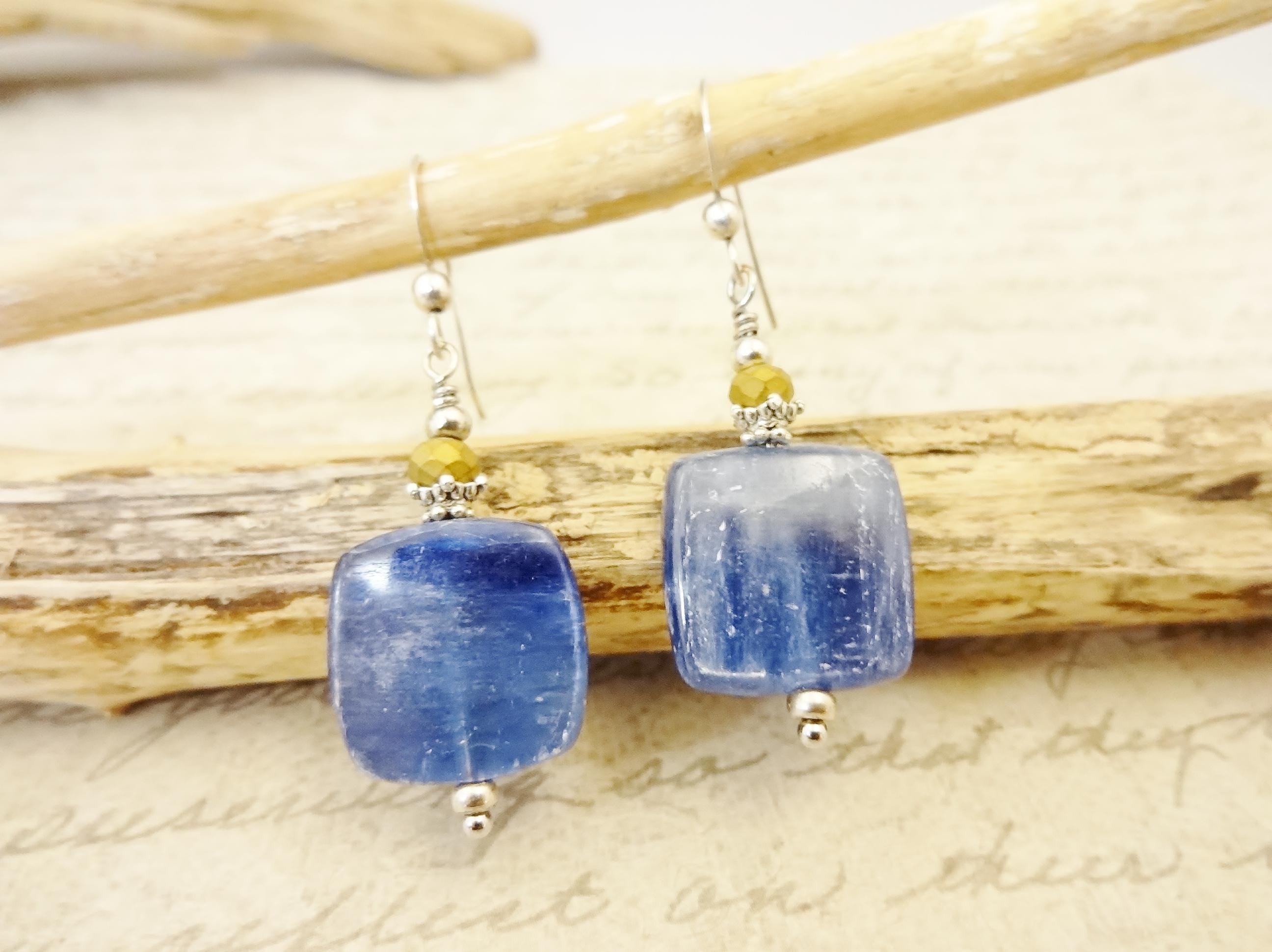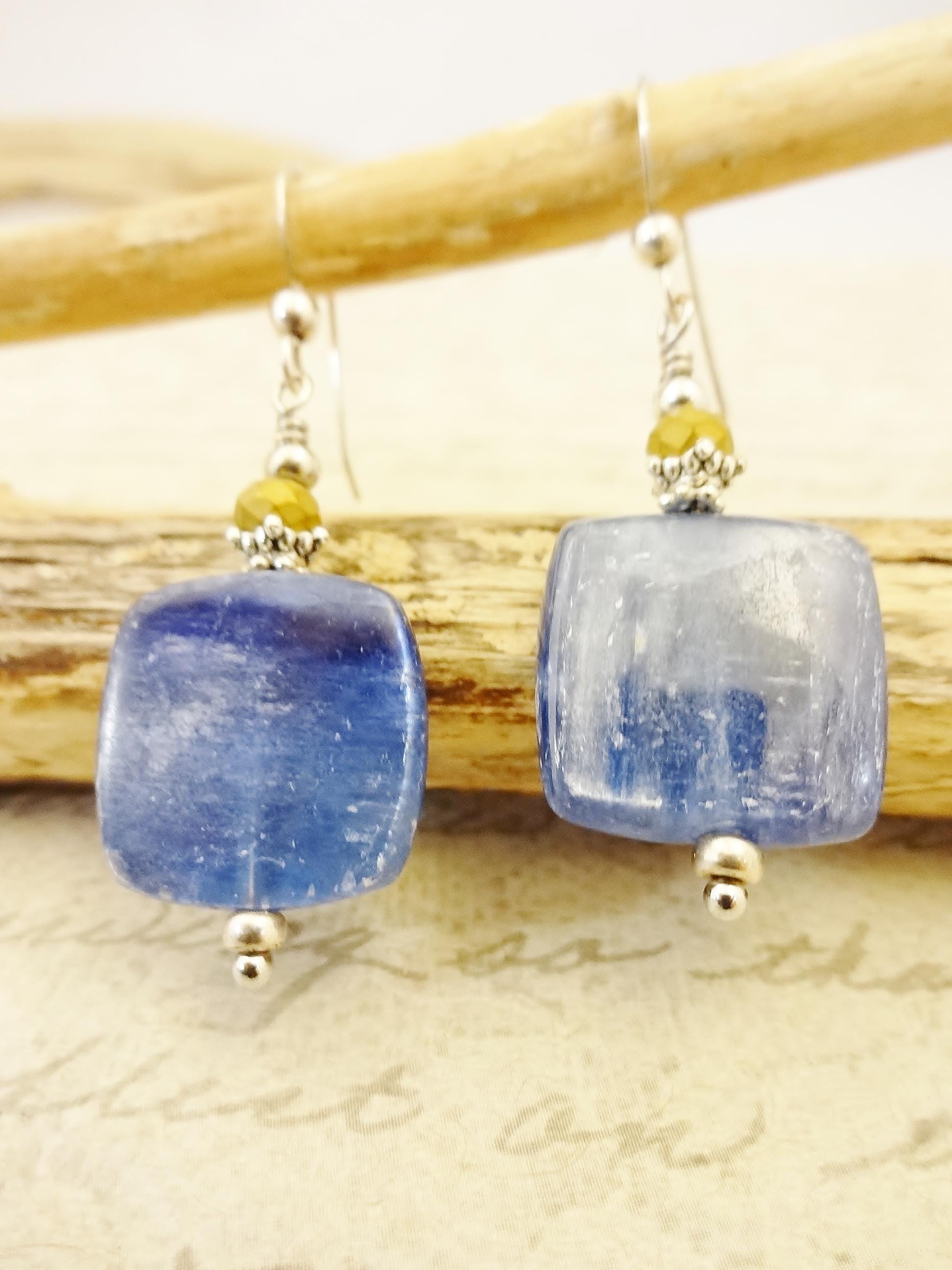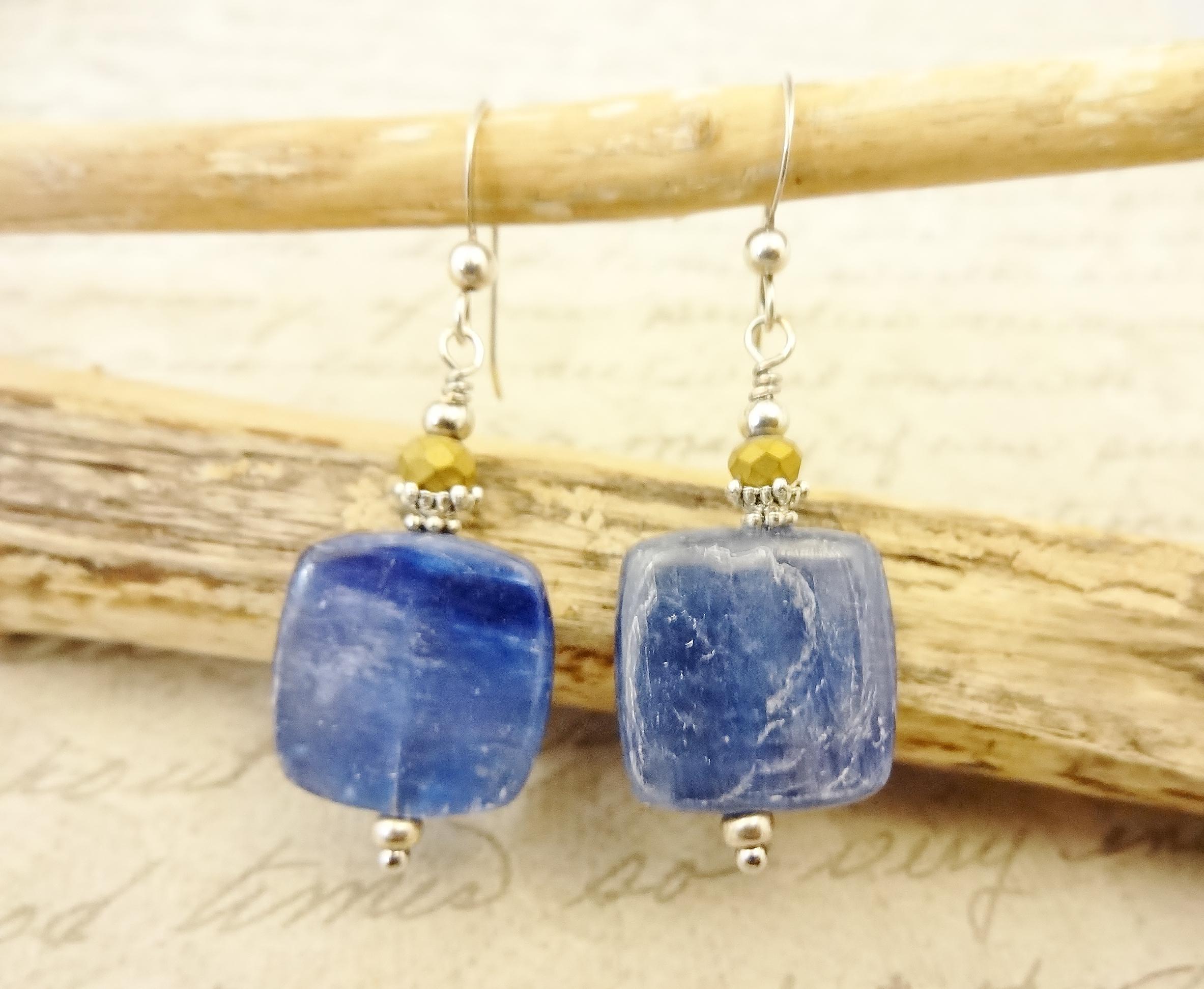 These gemstone earrings feature flat square Kyanite in a gorgeous blue with high a polish. These are large squares - 15mm. I've paired them with matte bronze Czech faceted glass.