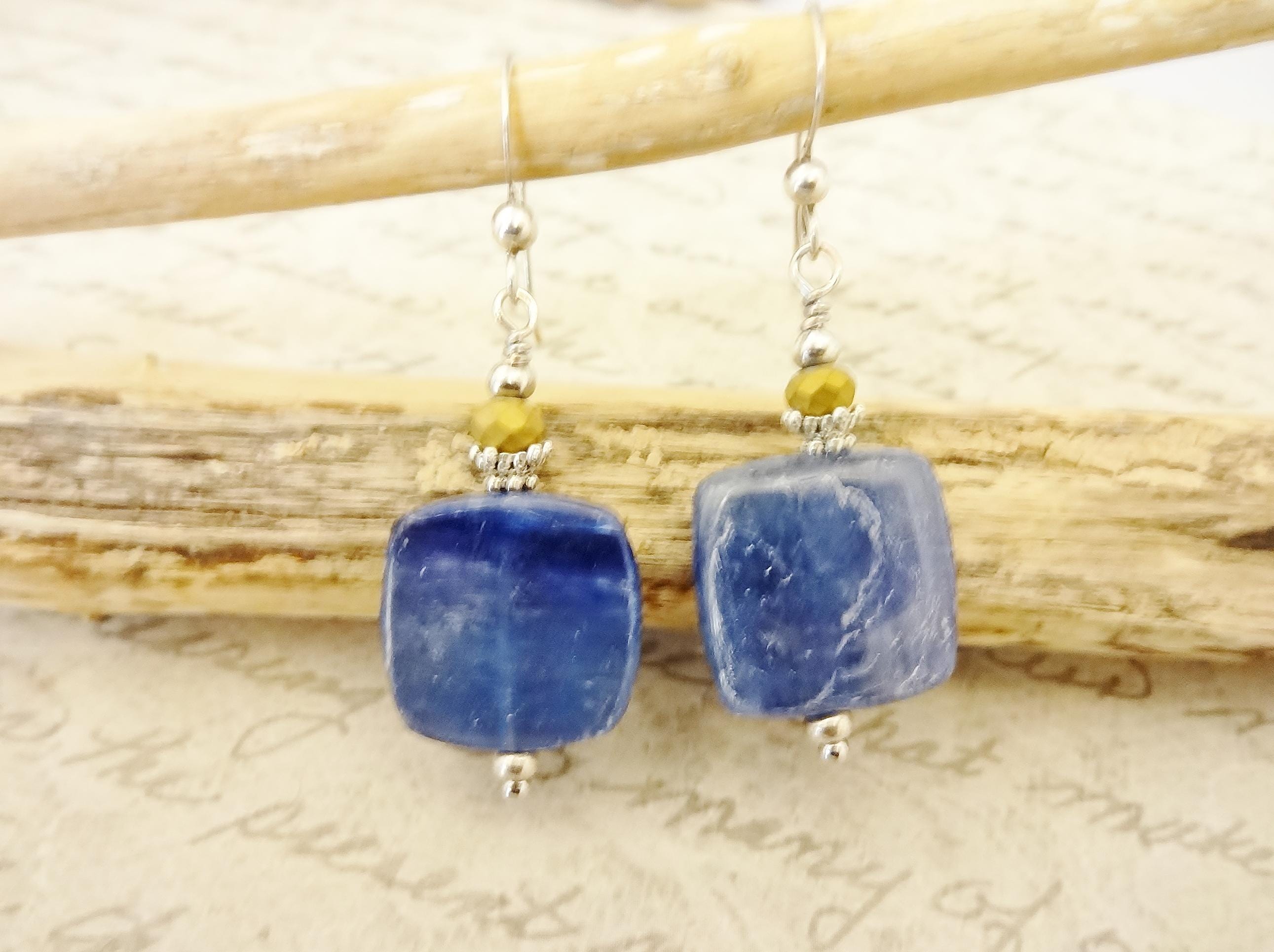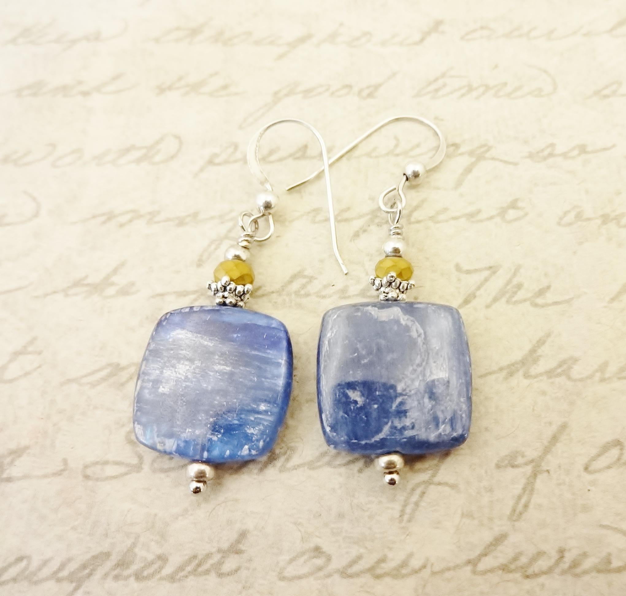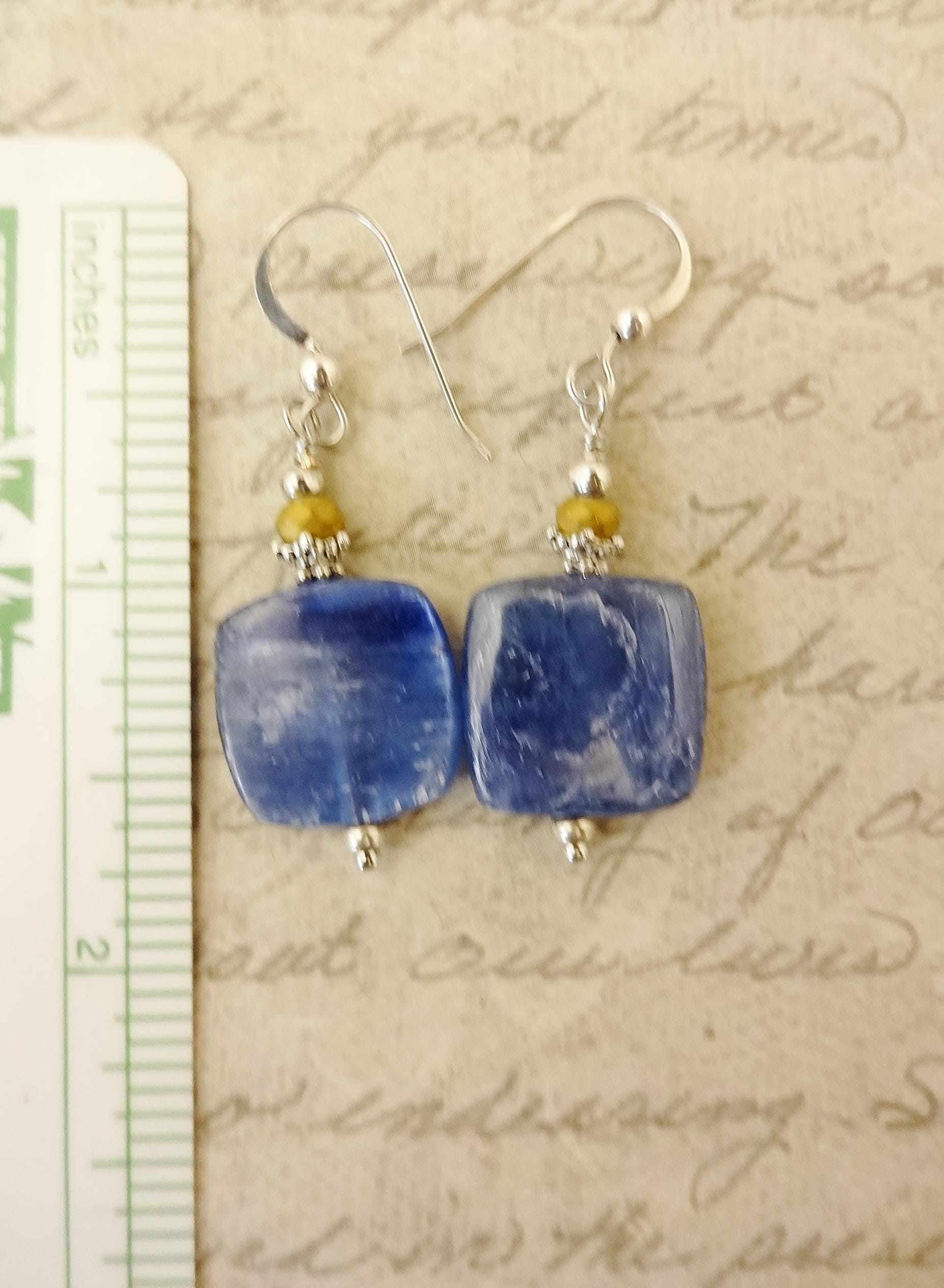 These gemstone earrings feature flat square Kyanite in a gorgeous blue with high a polish. These are large squares - 15mm. I've paired them with matte bronze Czech faceted glass.