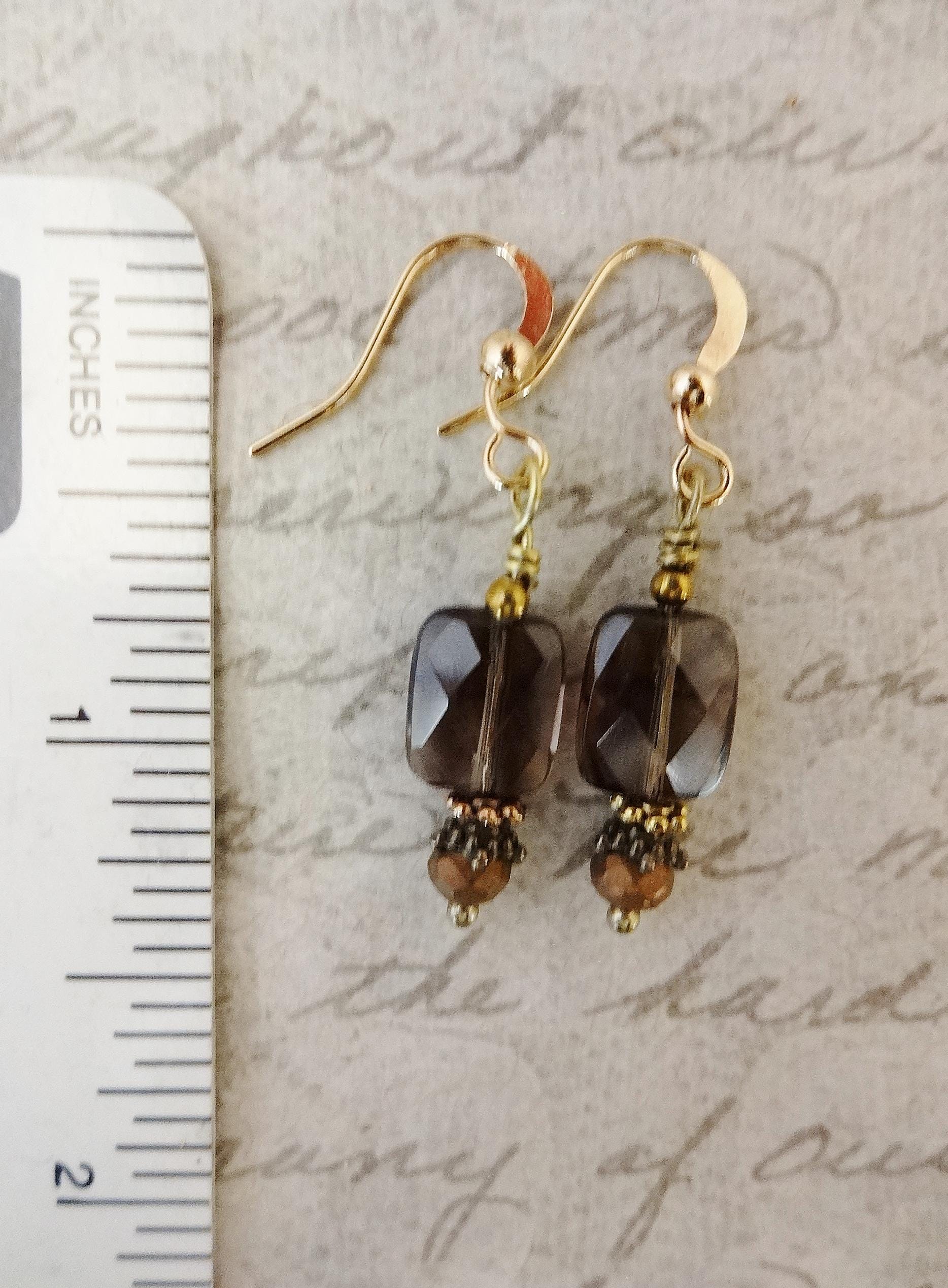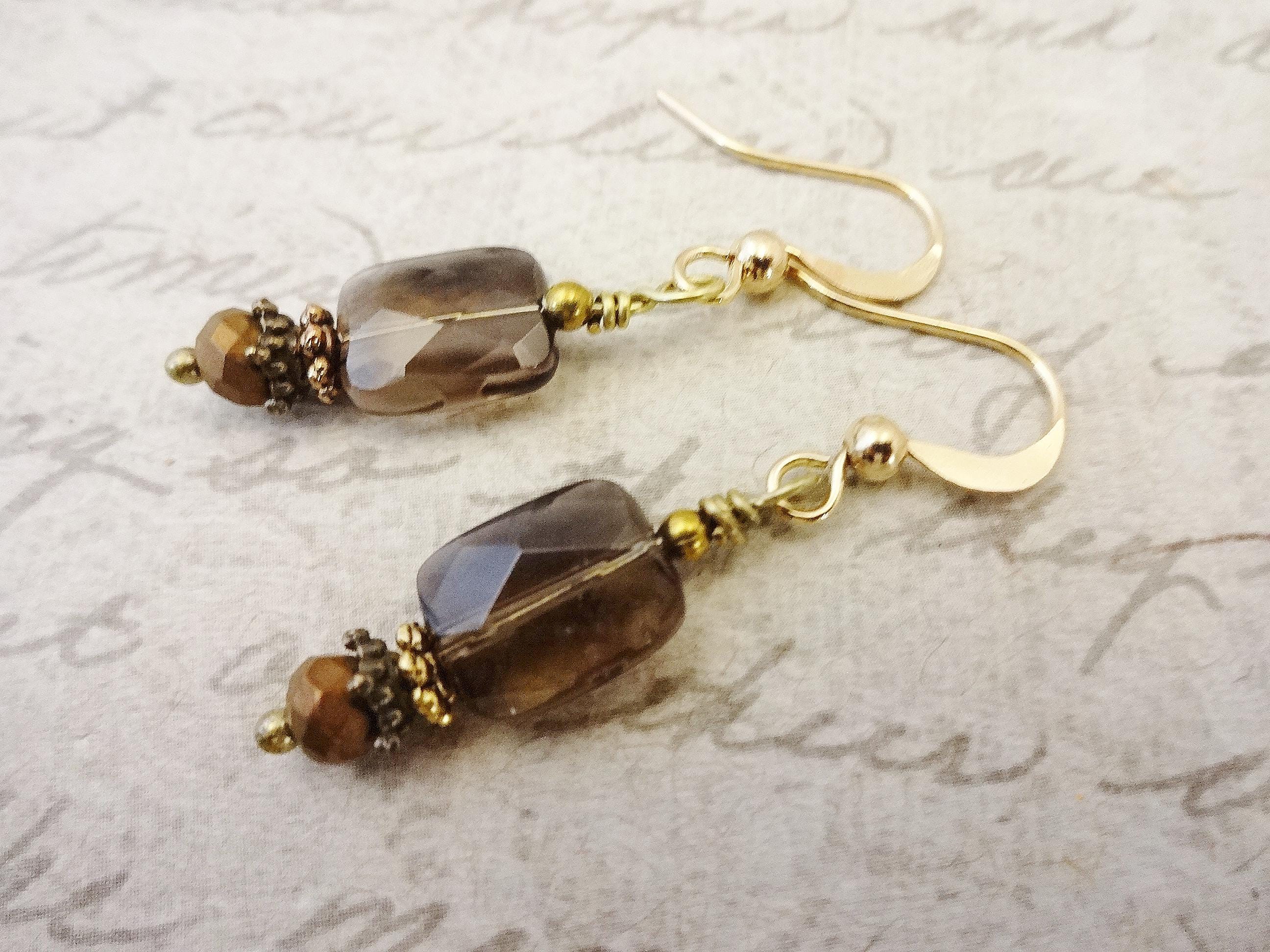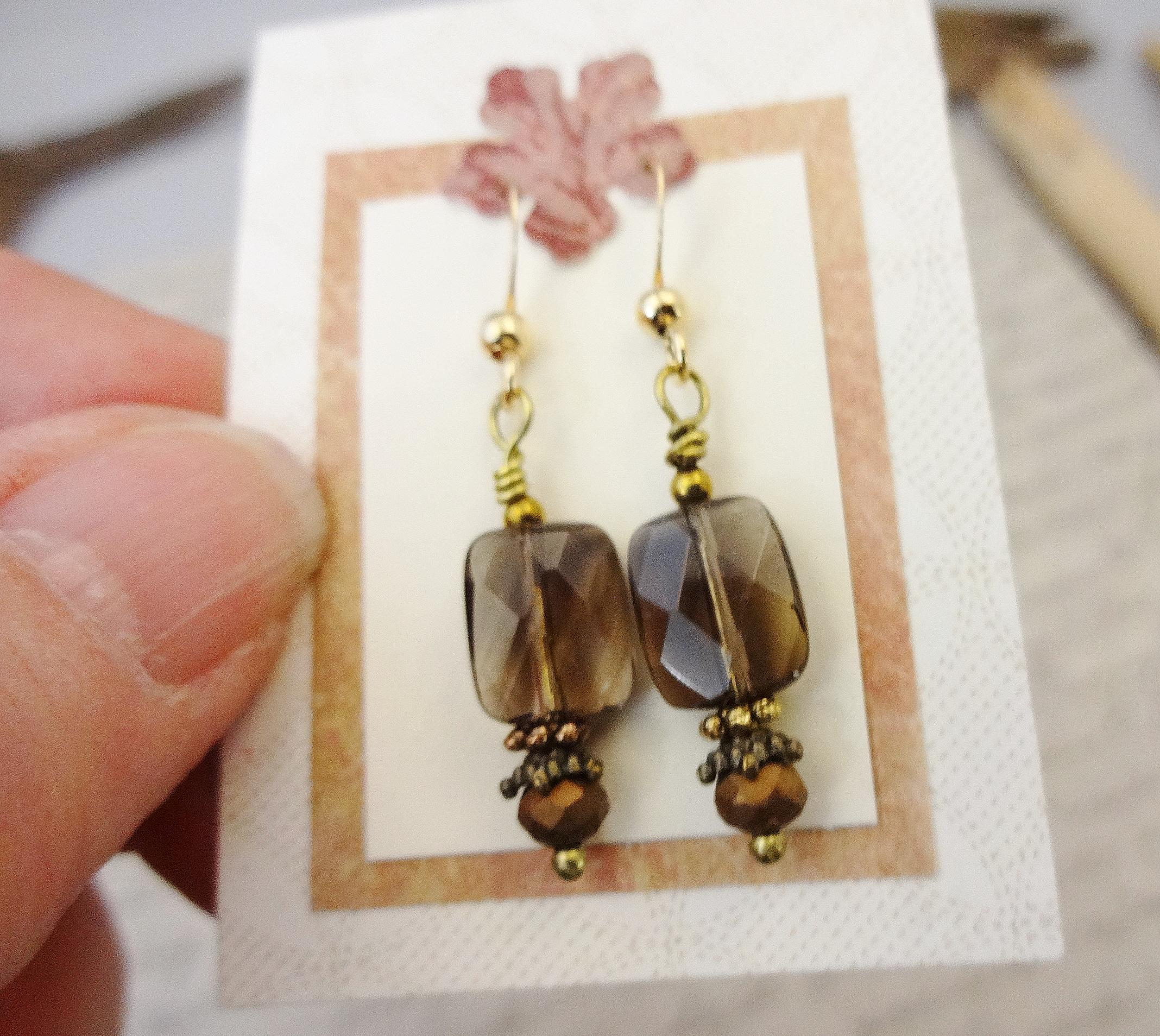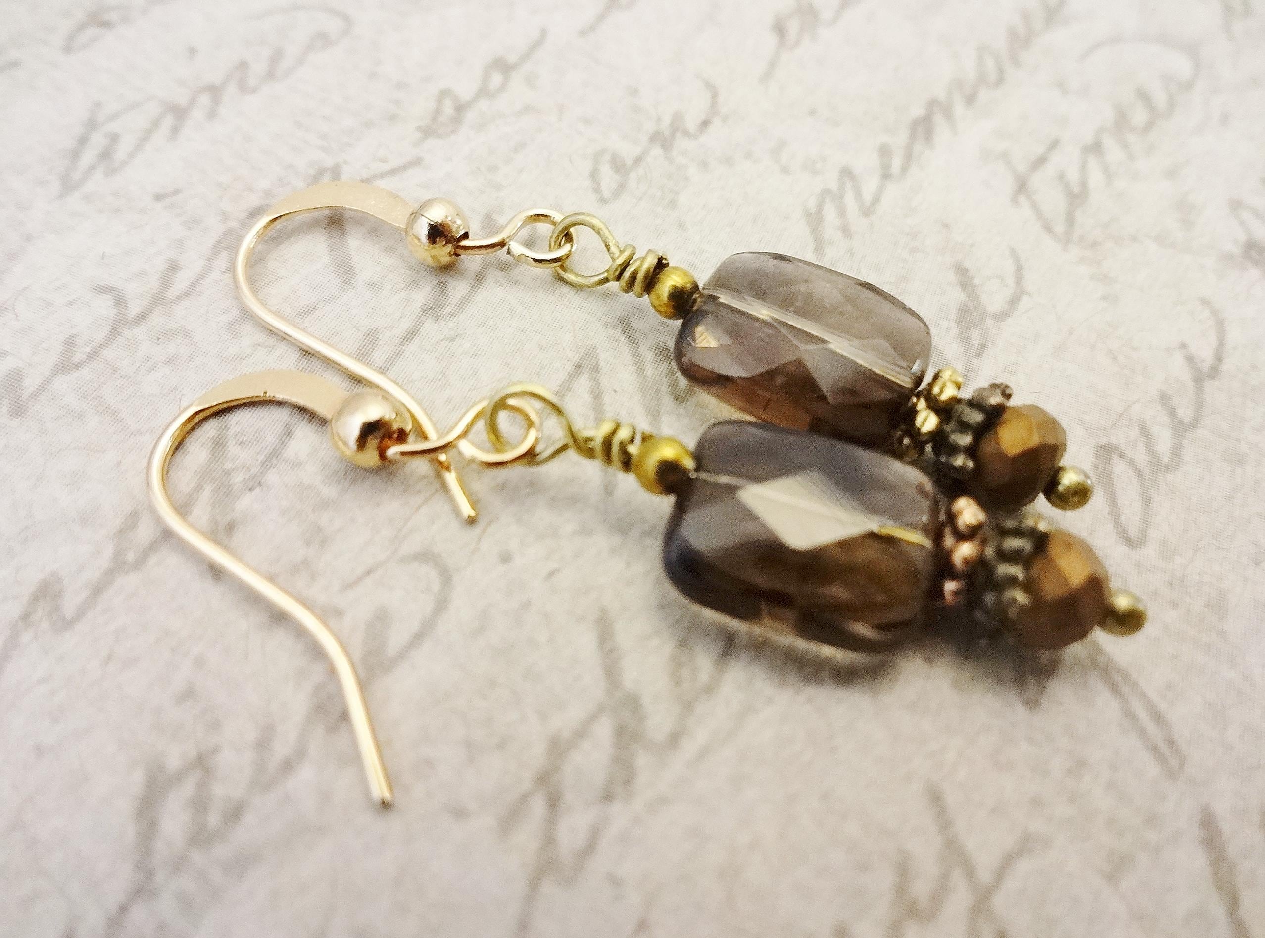 These earrings feature Smoky Quartz faceted rectangles that I stacked with bronze Czech faceted glass rondelles, tiny Antique Brass bead caps and daisy spacers. On top are tiny antique brass beads.