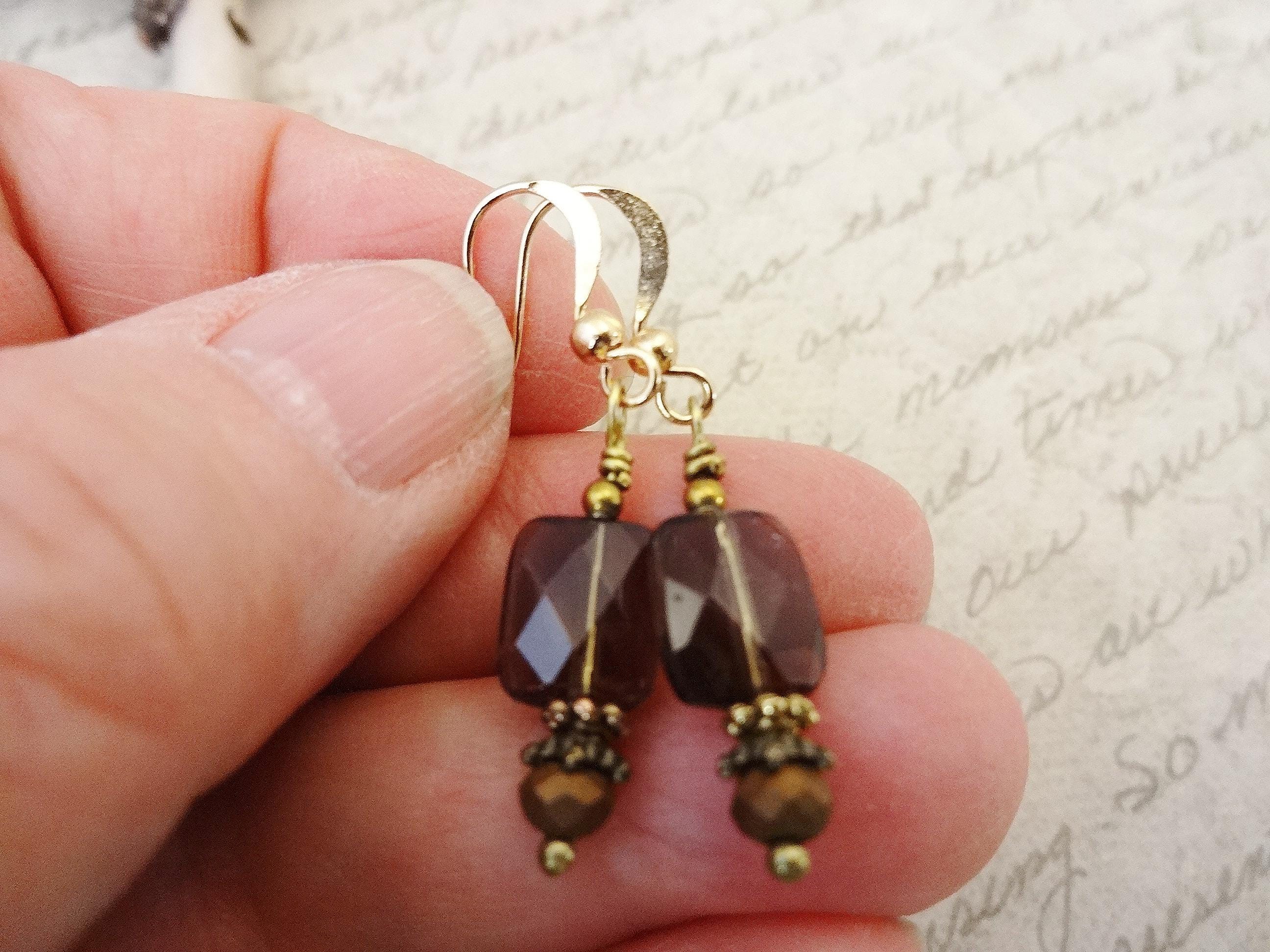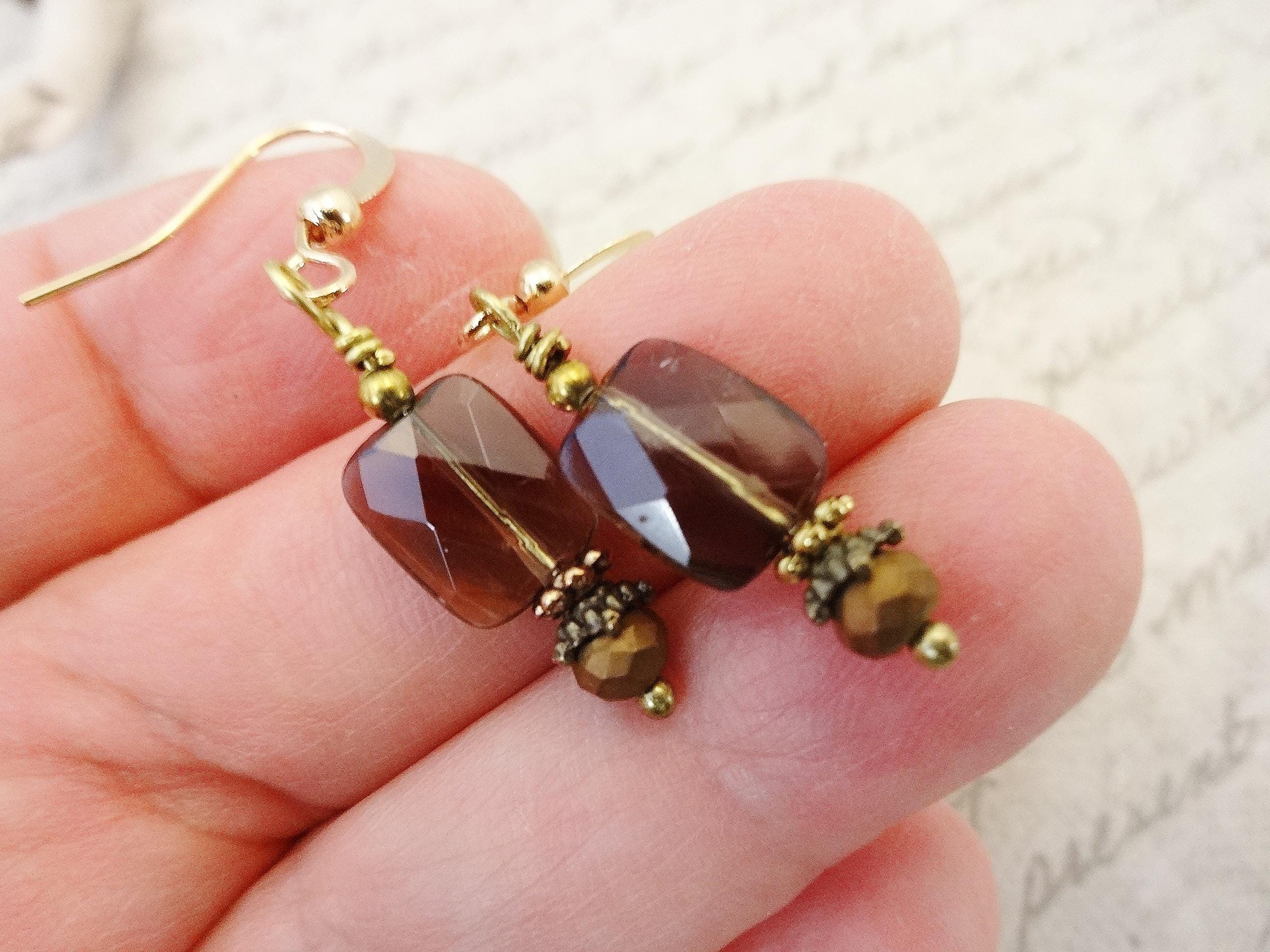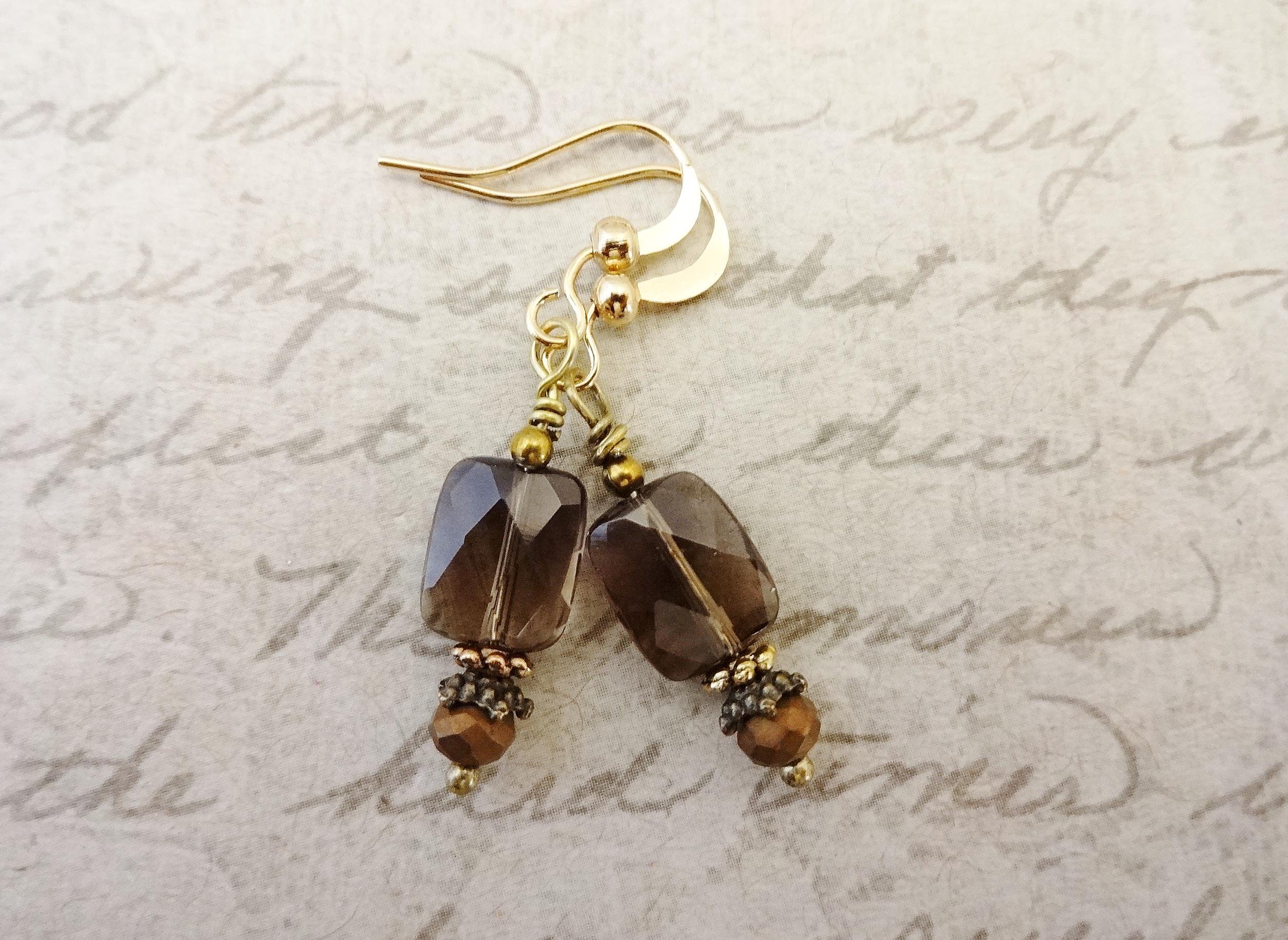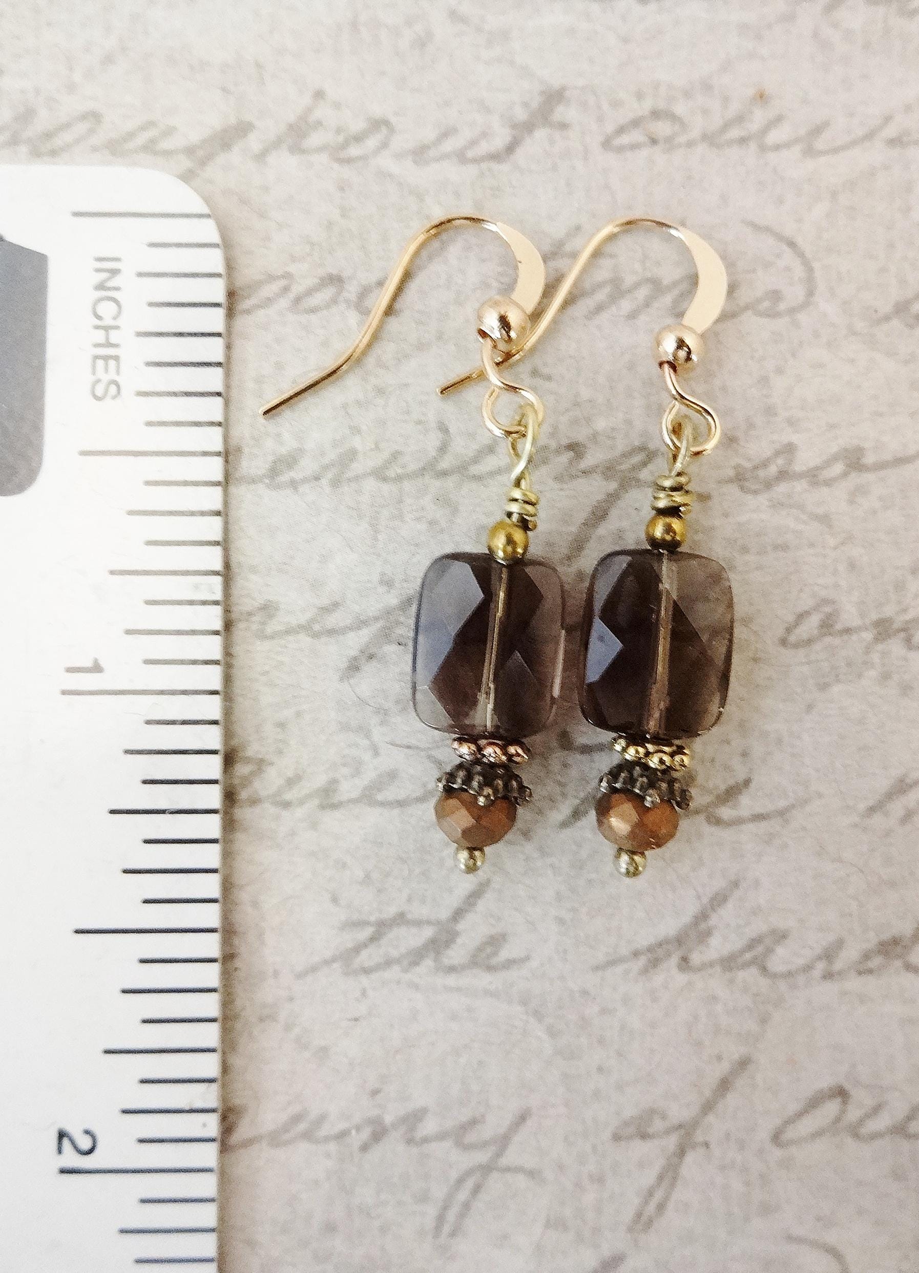 These earrings feature Smoky Quartz faceted rectangles that I stacked with bronze Czech faceted glass rondelles, tiny Antique Brass bead caps and daisy spacers. On top are tiny antique brass beads.