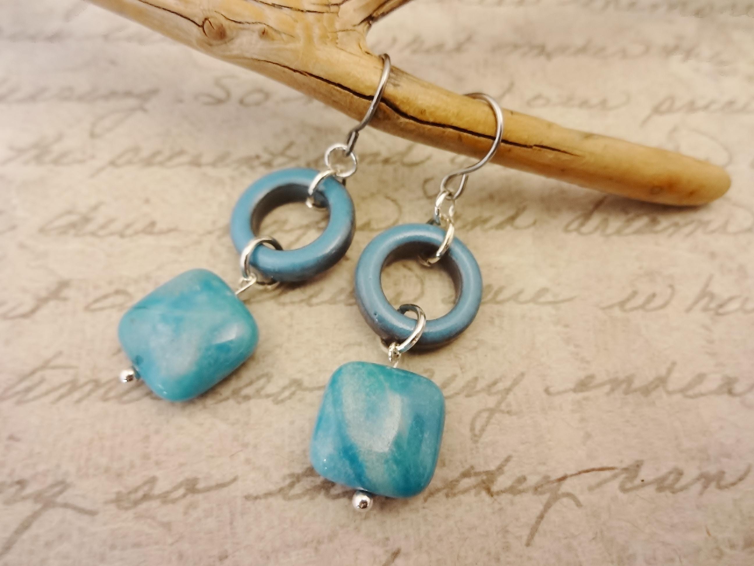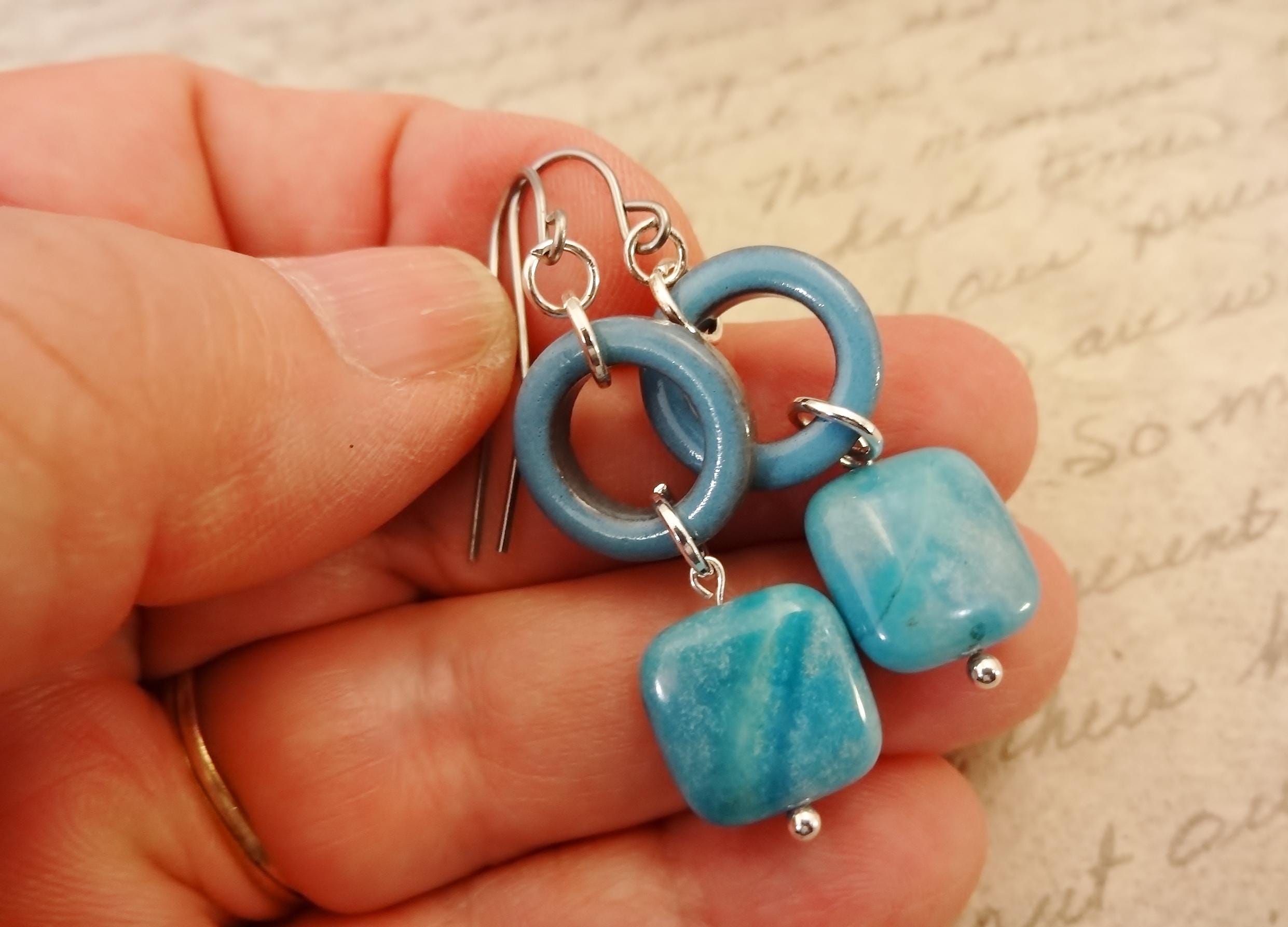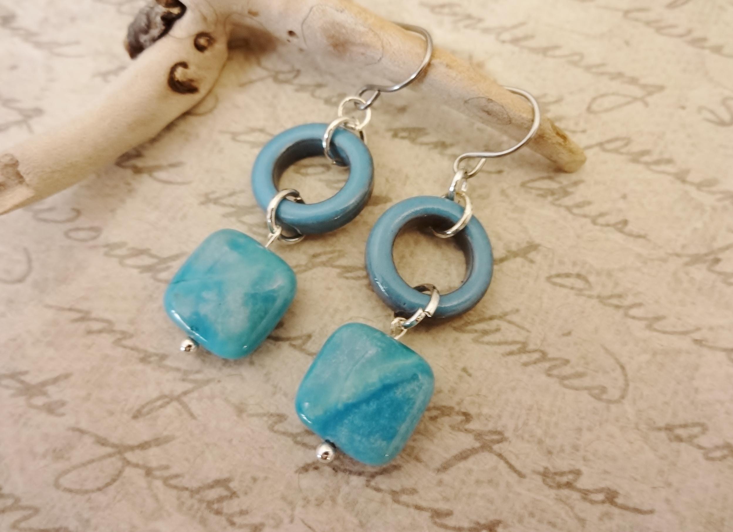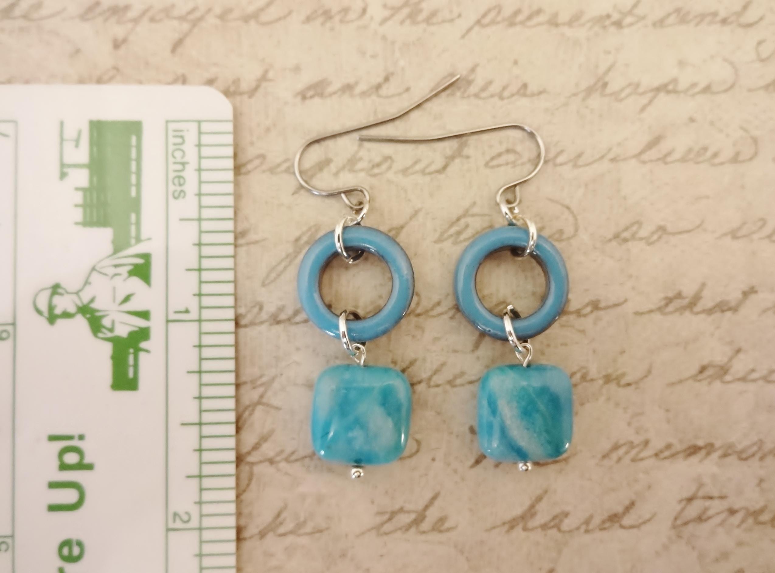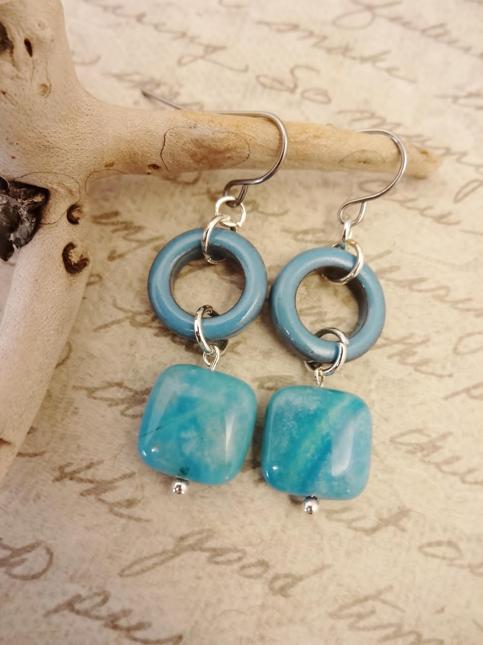 Squares and circles are highlighted in these fun aqua earrings. From the Artisan-made torch-fired enamel circles to the Blue Opal squares, I kept the design simple to show off the way these two components complement each other.