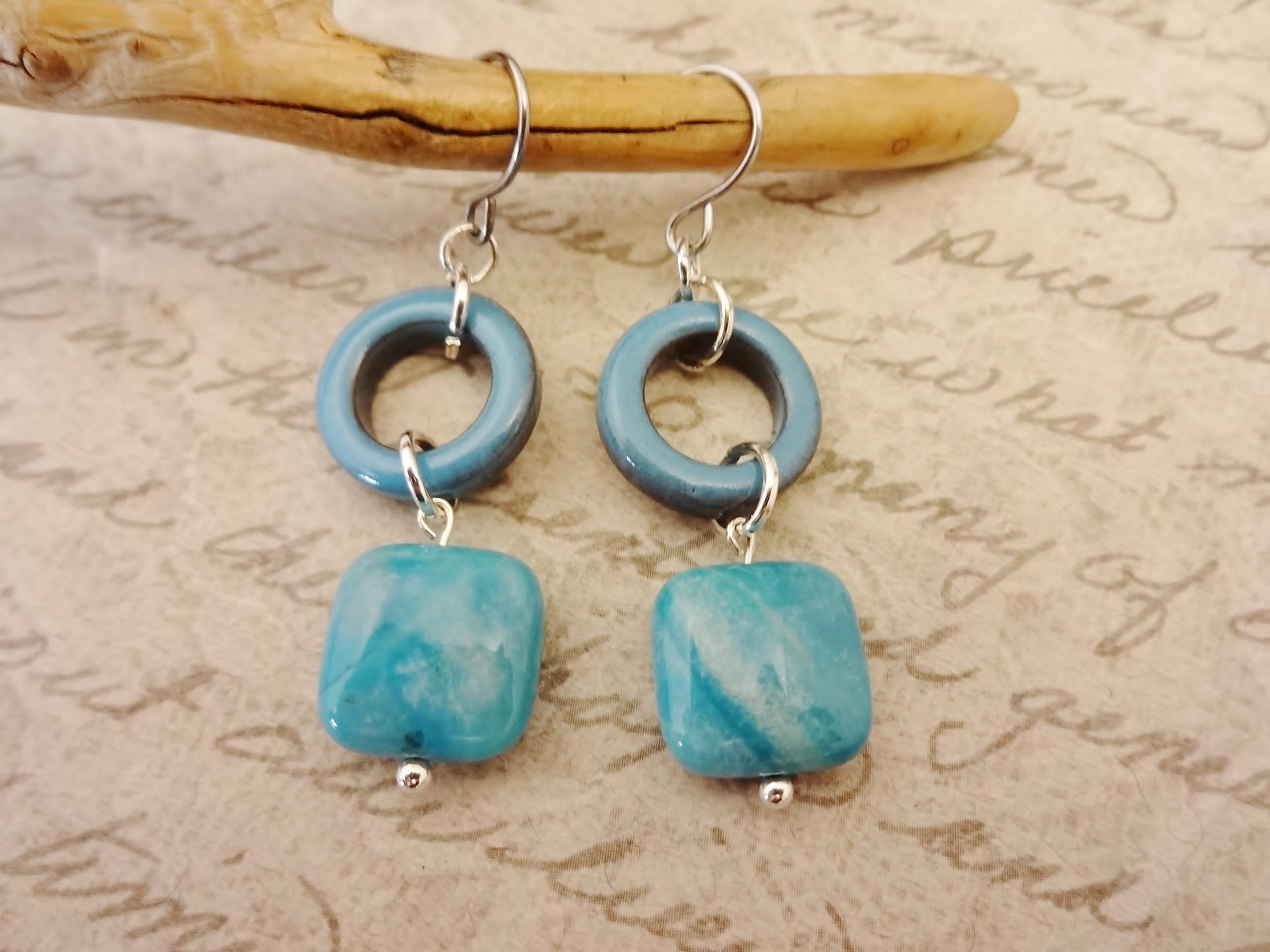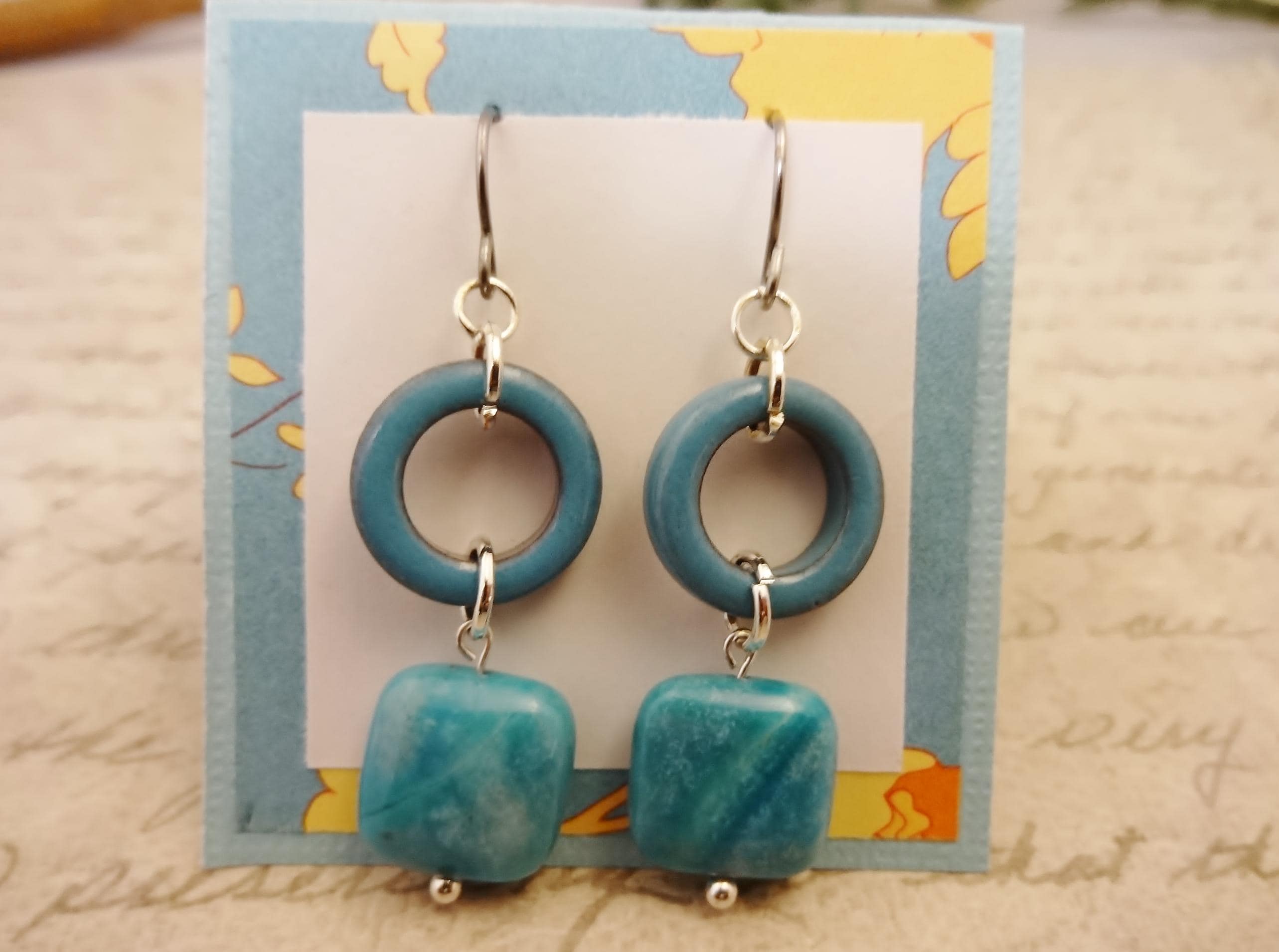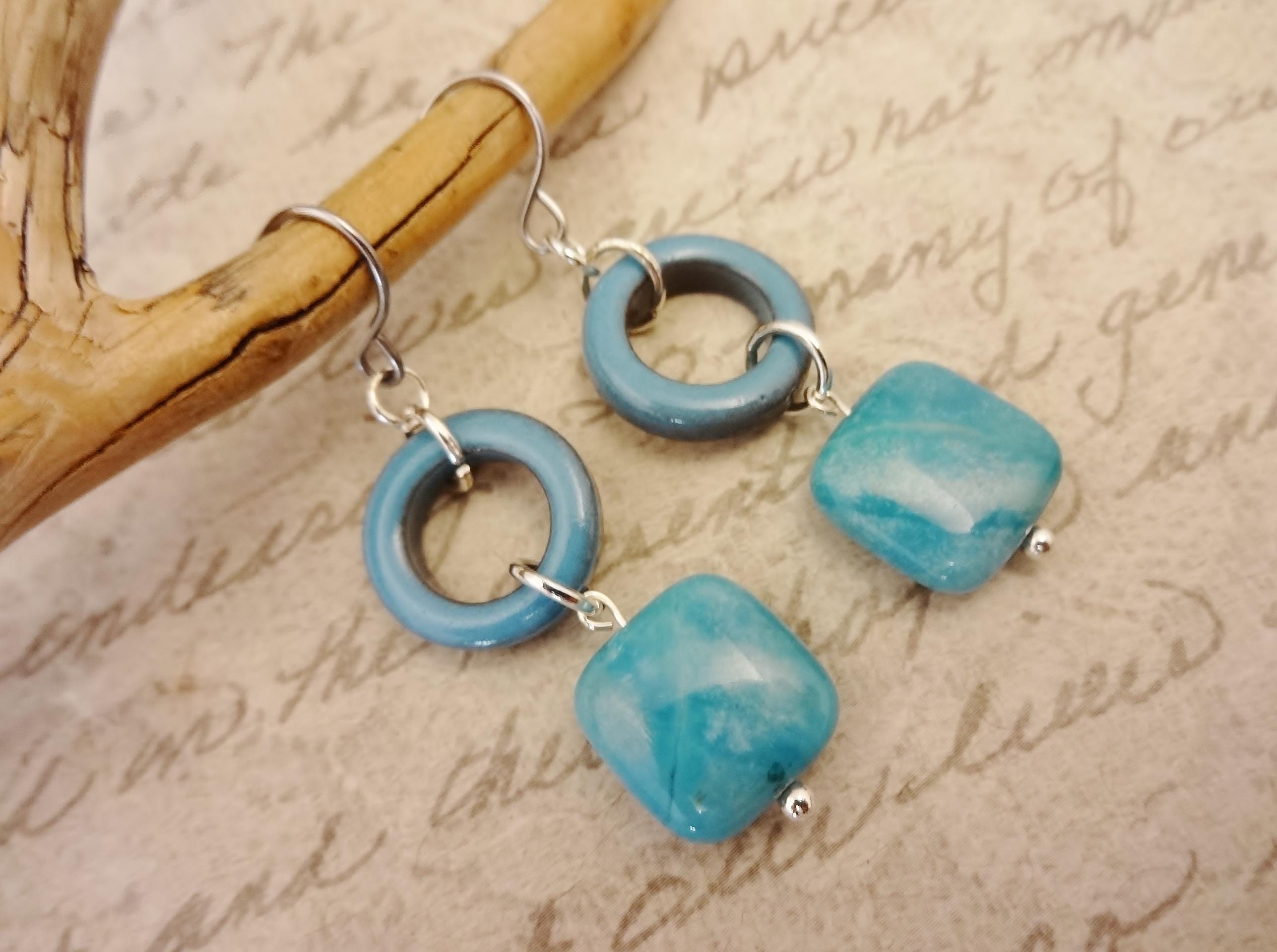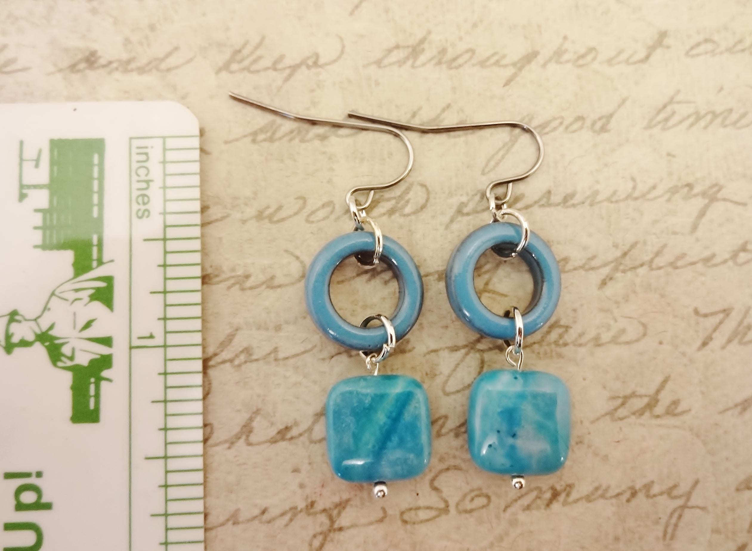 Blue Opal Square and Enamel Circle Earrings: Geometric Jewelry, One of a Kind Artisan Earrings, Handmade Earrings, Gift for Her