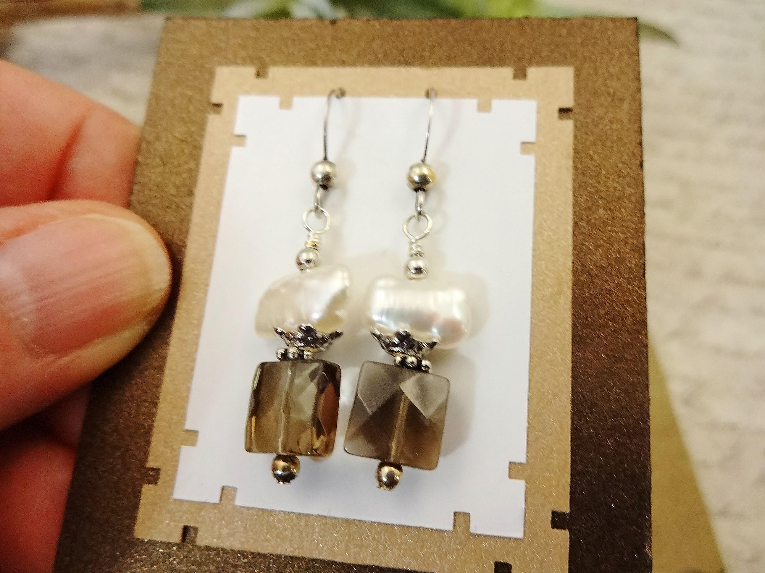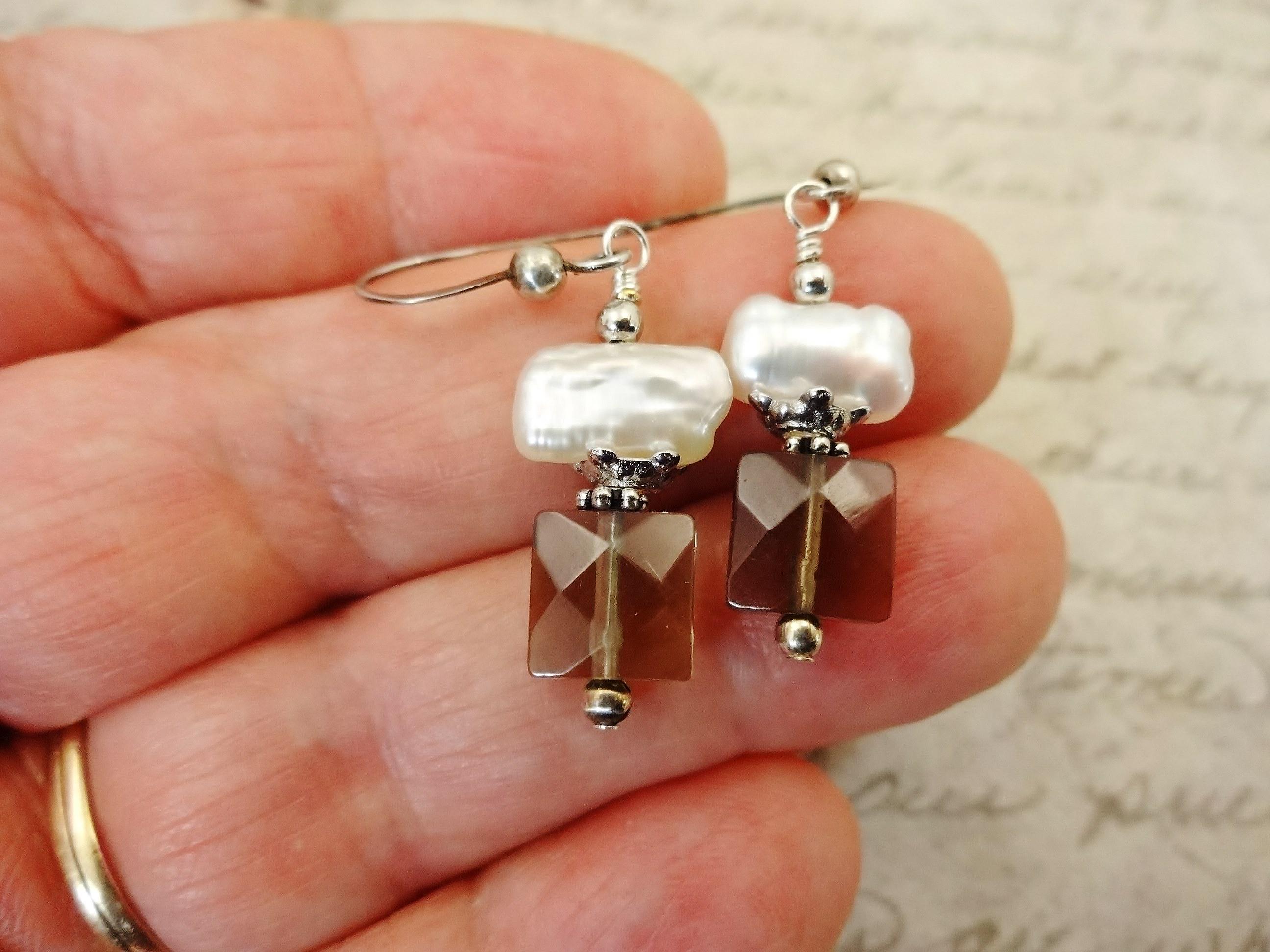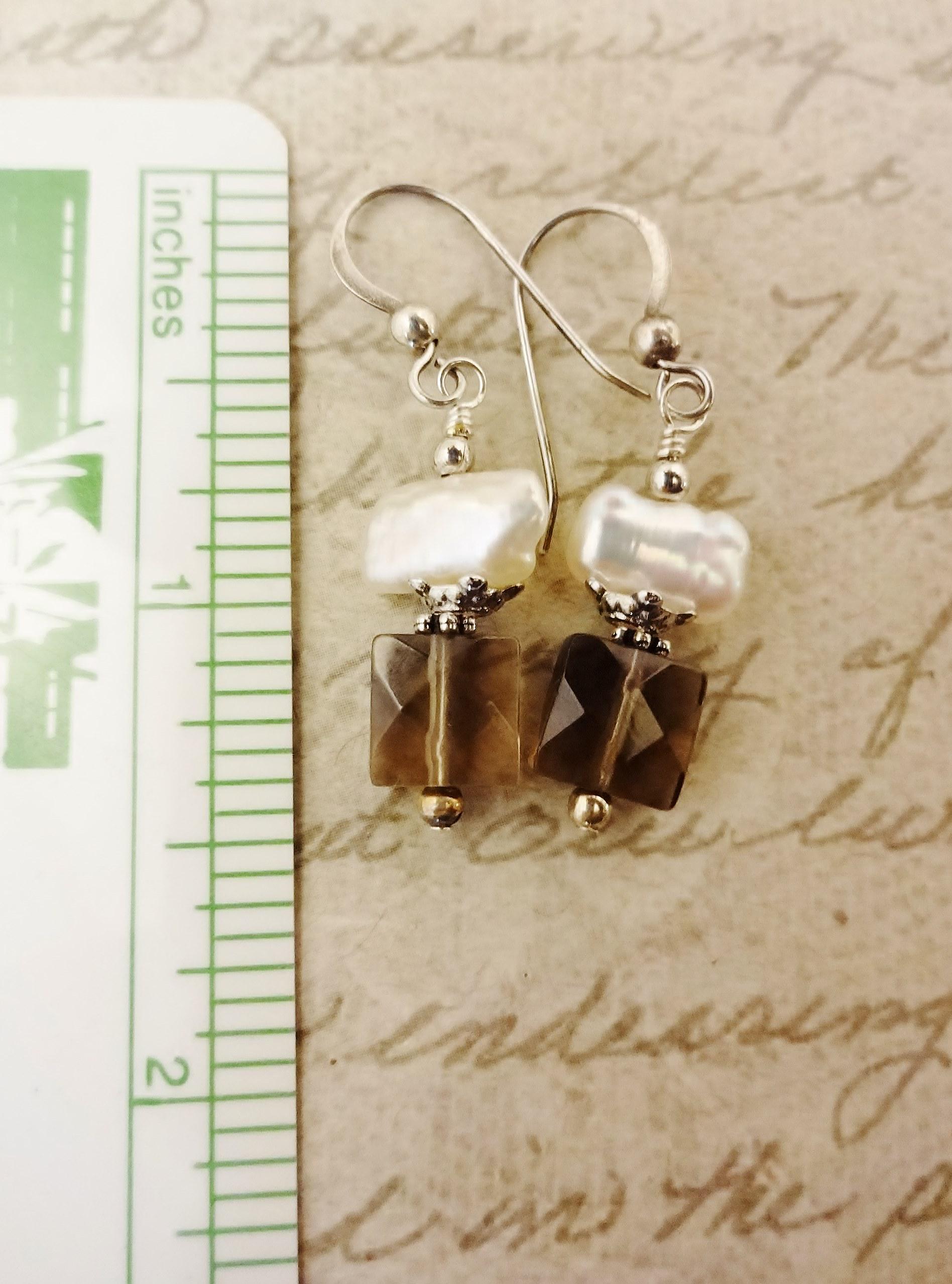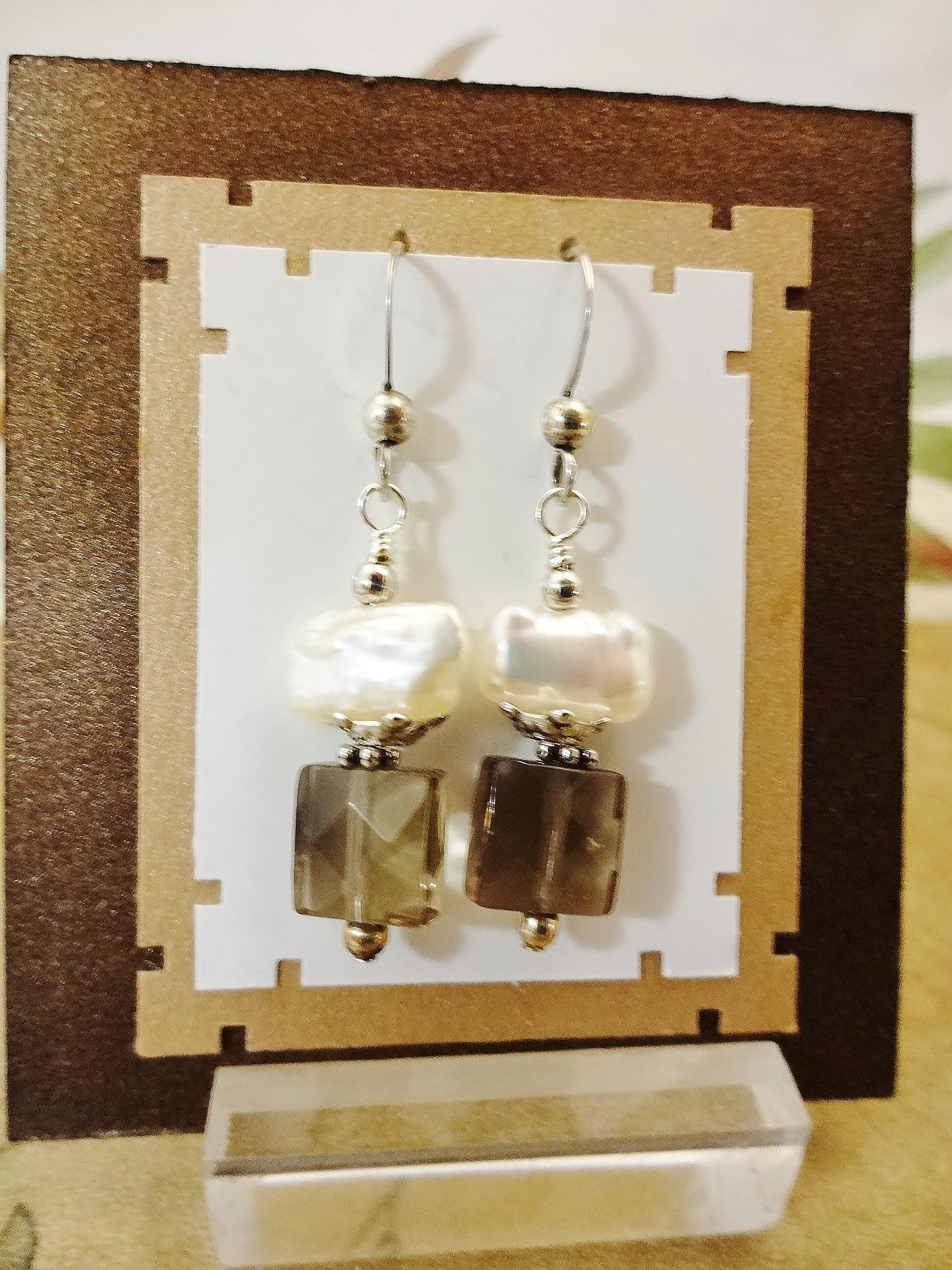 These earrings feature Smoky Quartz faceted flat squares that I stacked with large white Biwa Pearls, silver-plated pewter bead caps and daisy spacers. On top are tiny Sterling Silver beads.