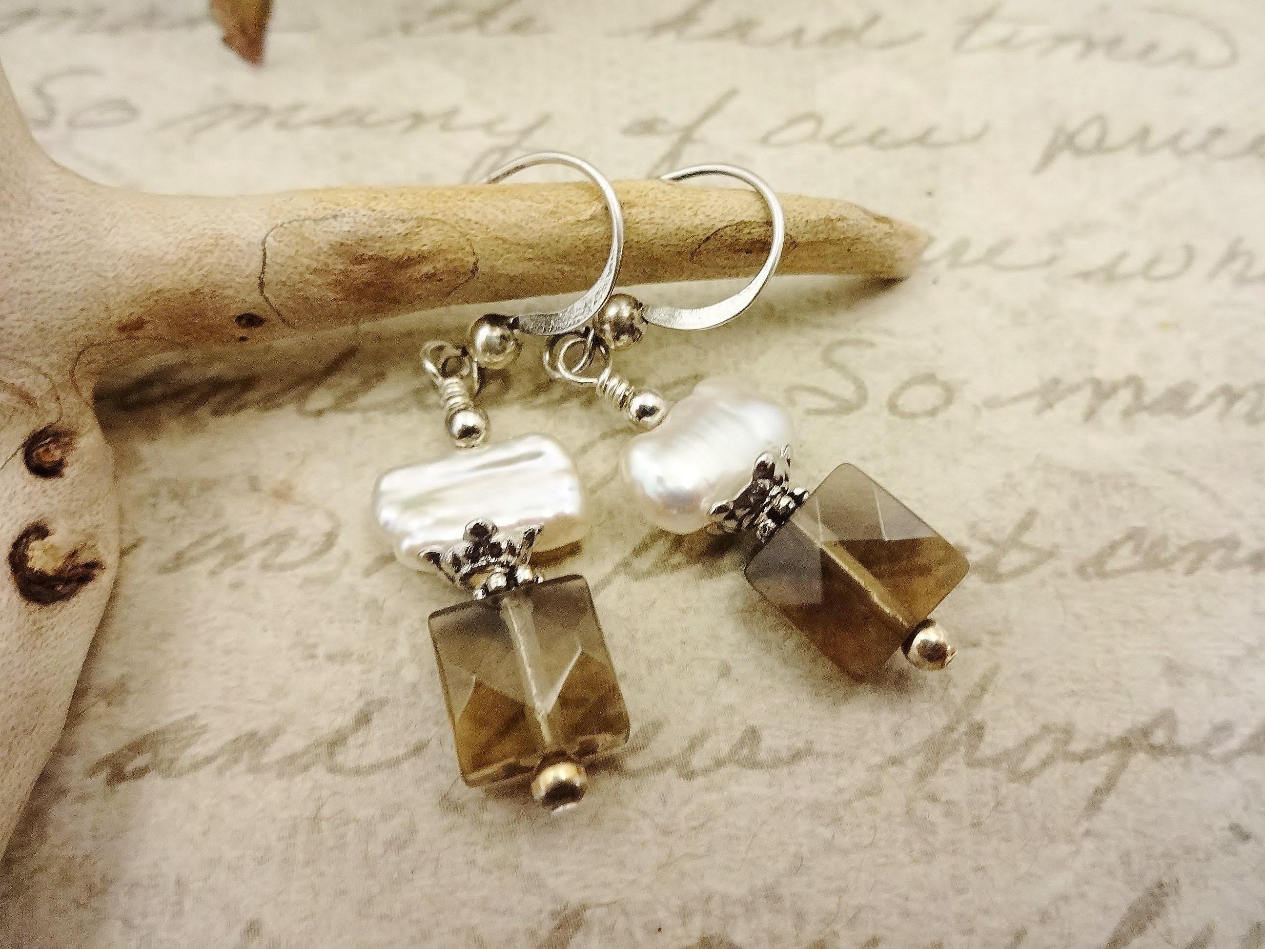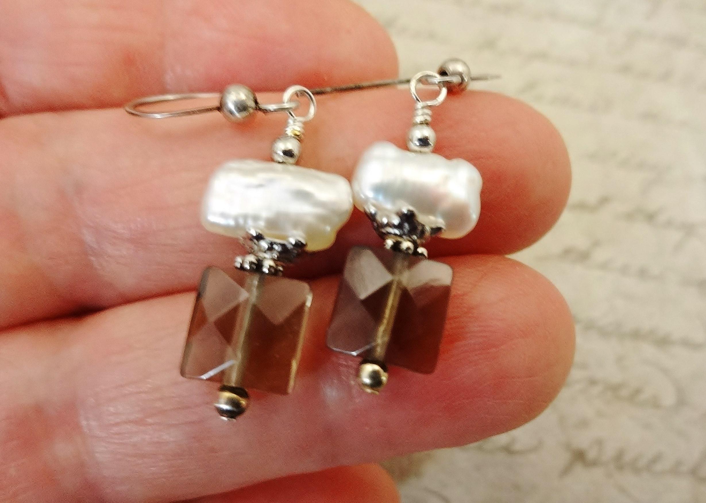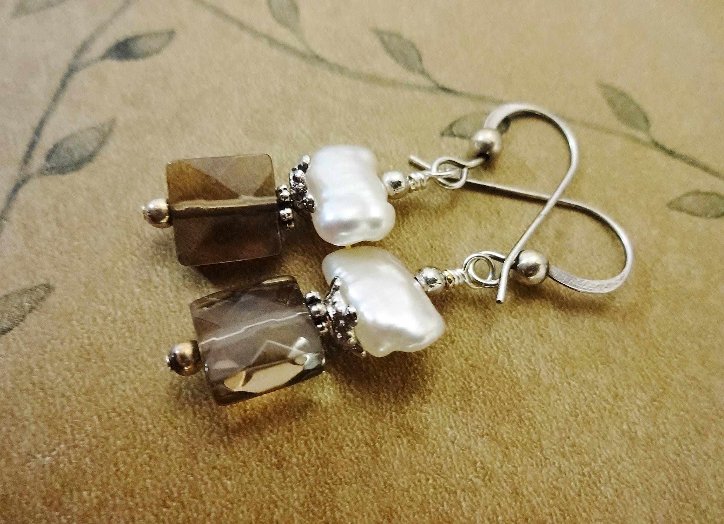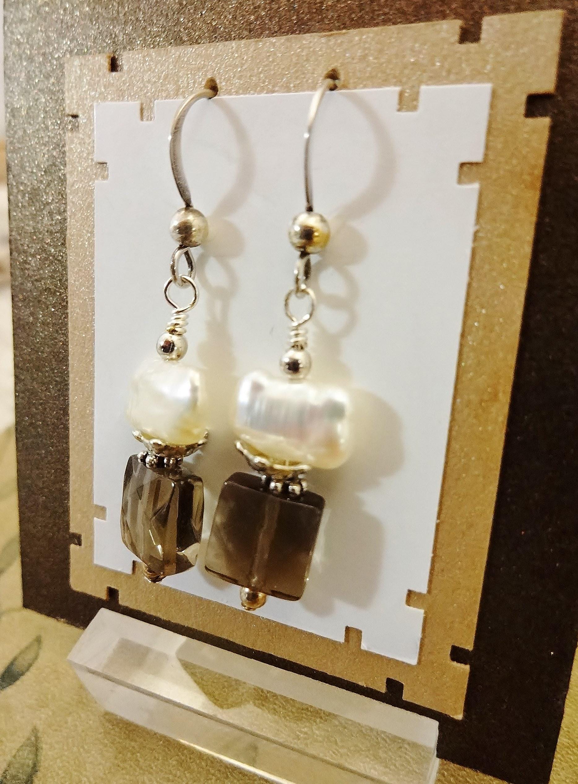 These earrings feature Smoky Quartz faceted flat squares that I stacked with large white Biwa Pearls, silver-plated pewter bead caps and daisy spacers. On top are tiny Sterling Silver beads.