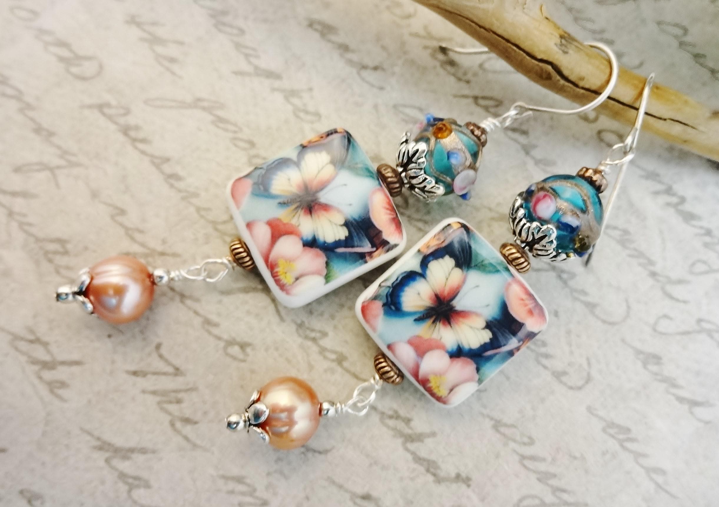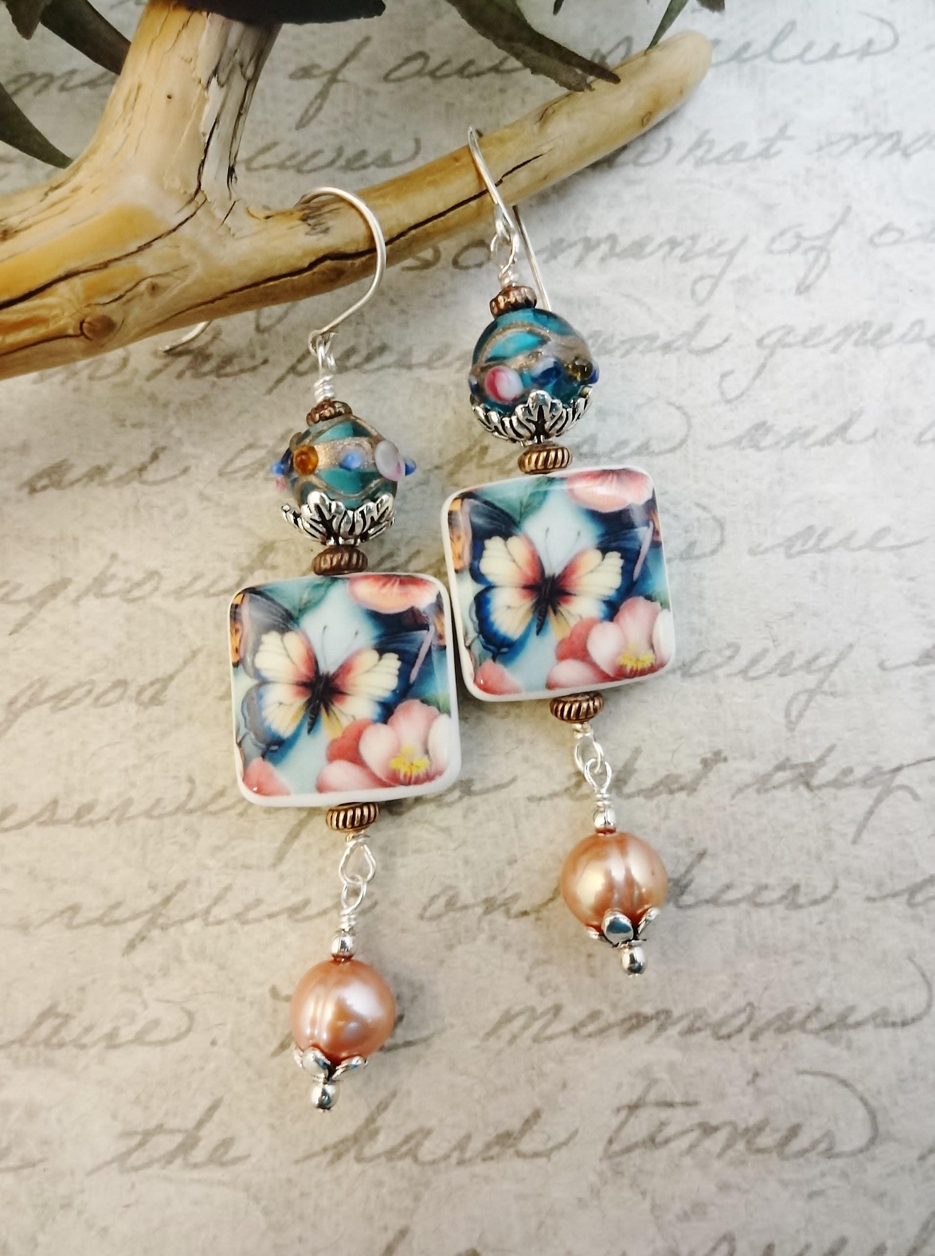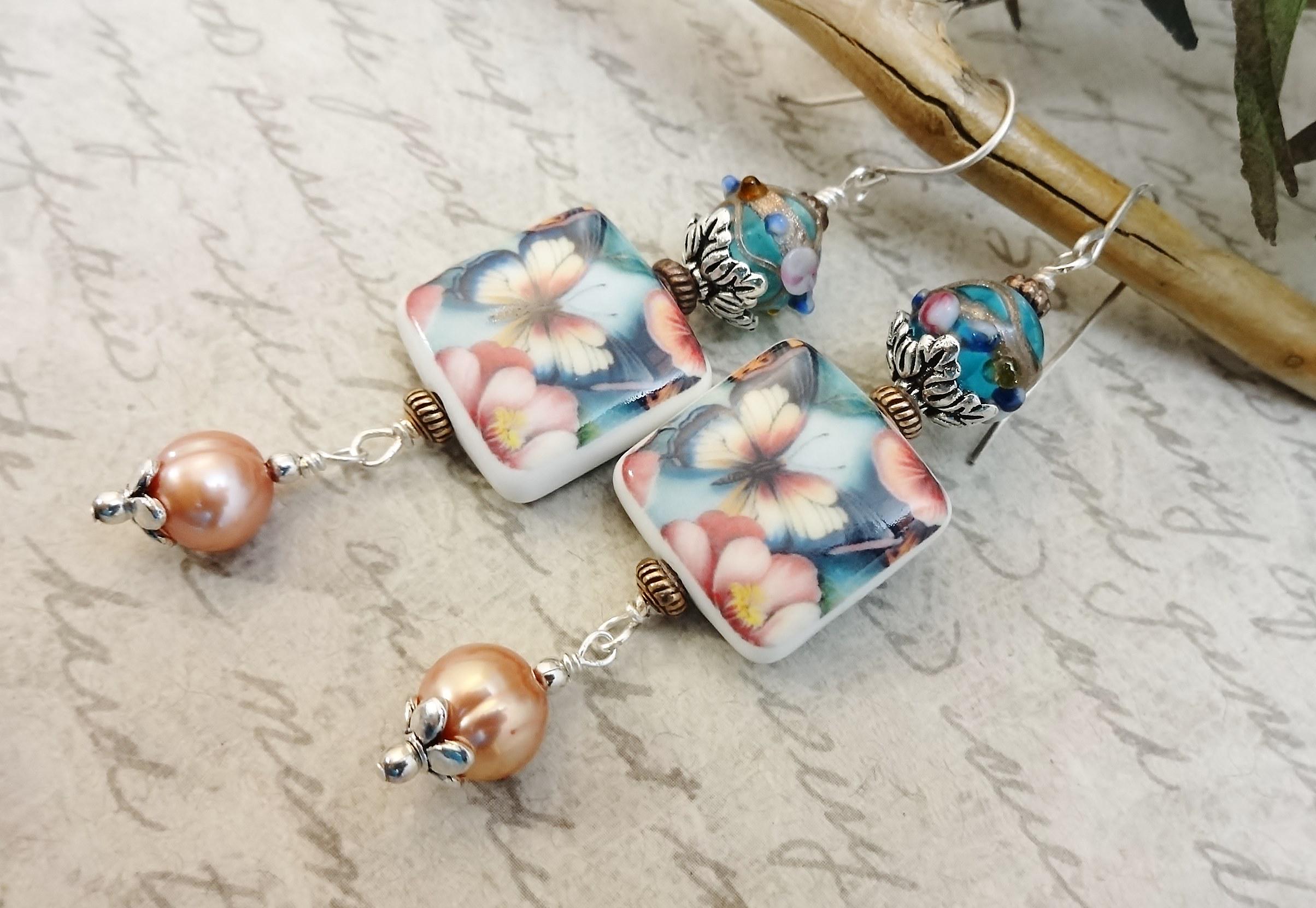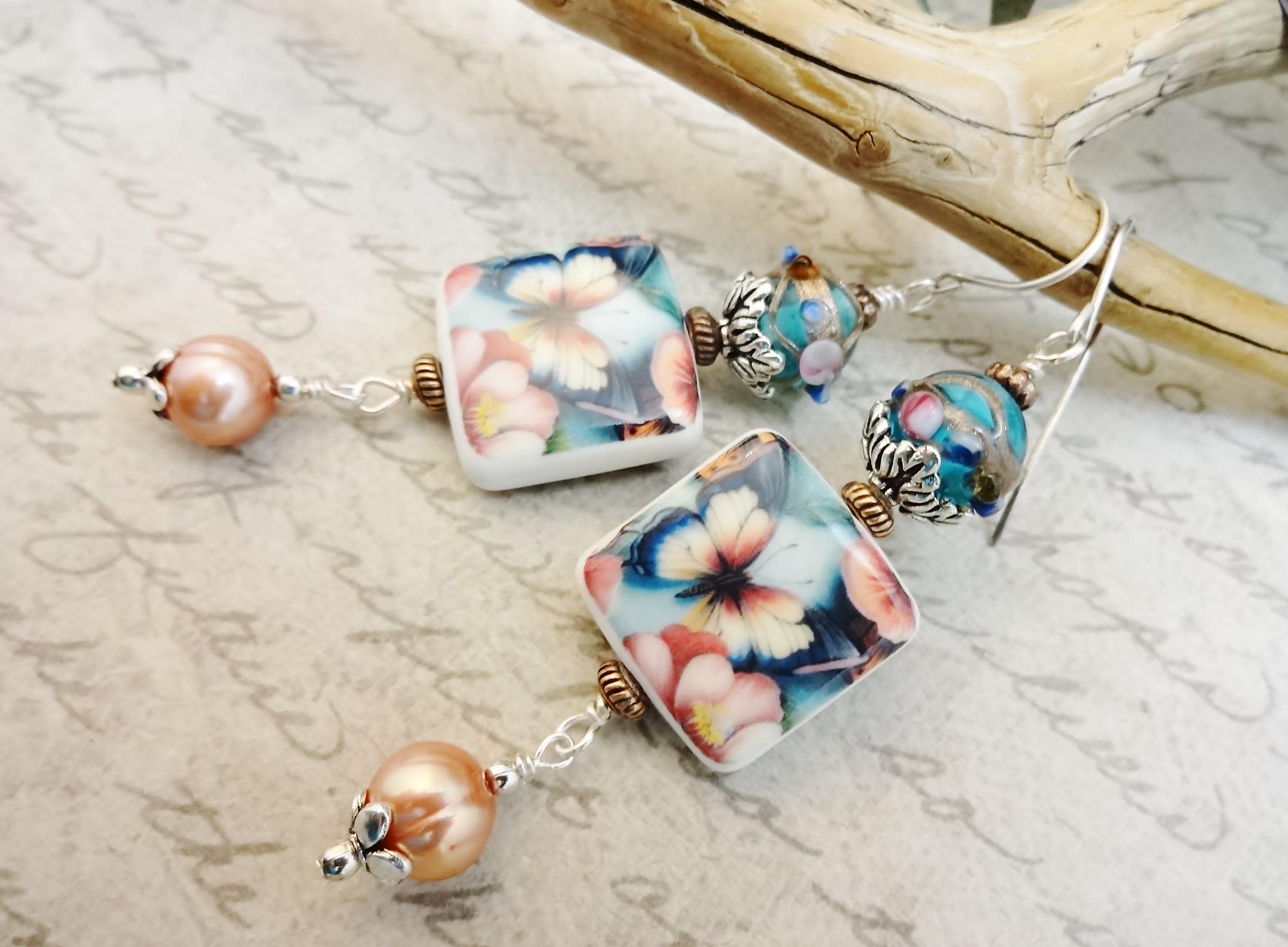 French Porcelain Butterflies and Pearls: Lampwork Glass Peach and Aqua Earrings, Gift for Her, One of a Kind Earrings
