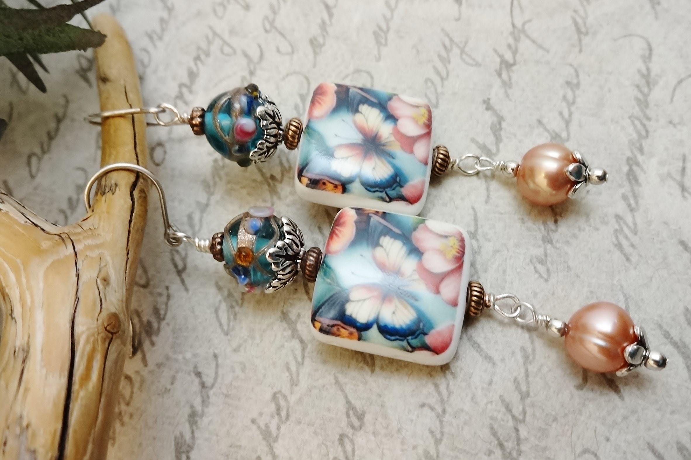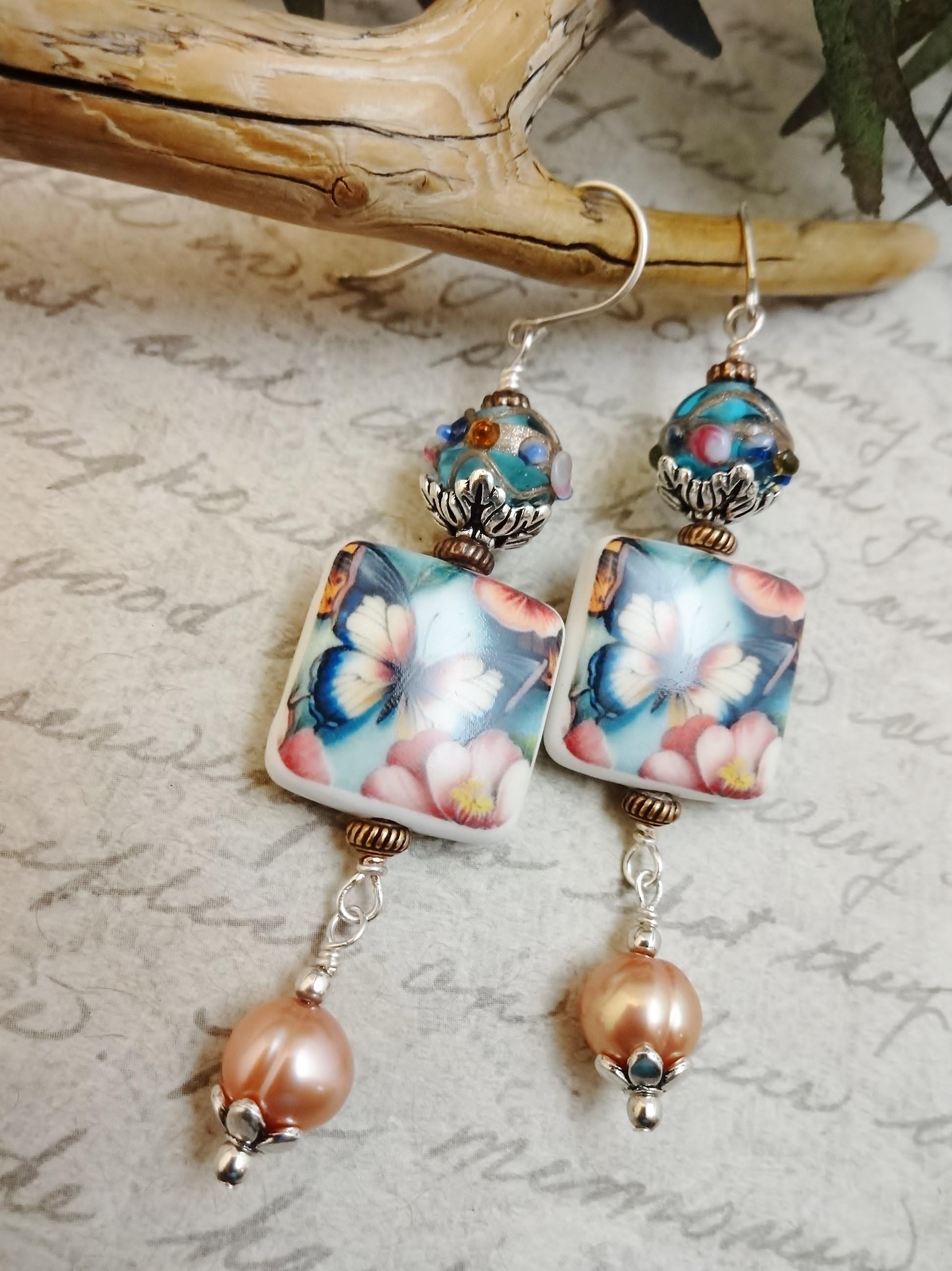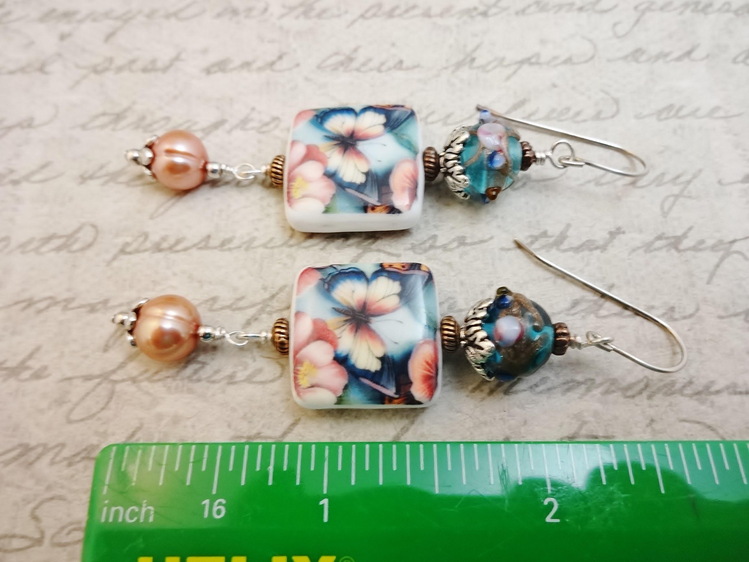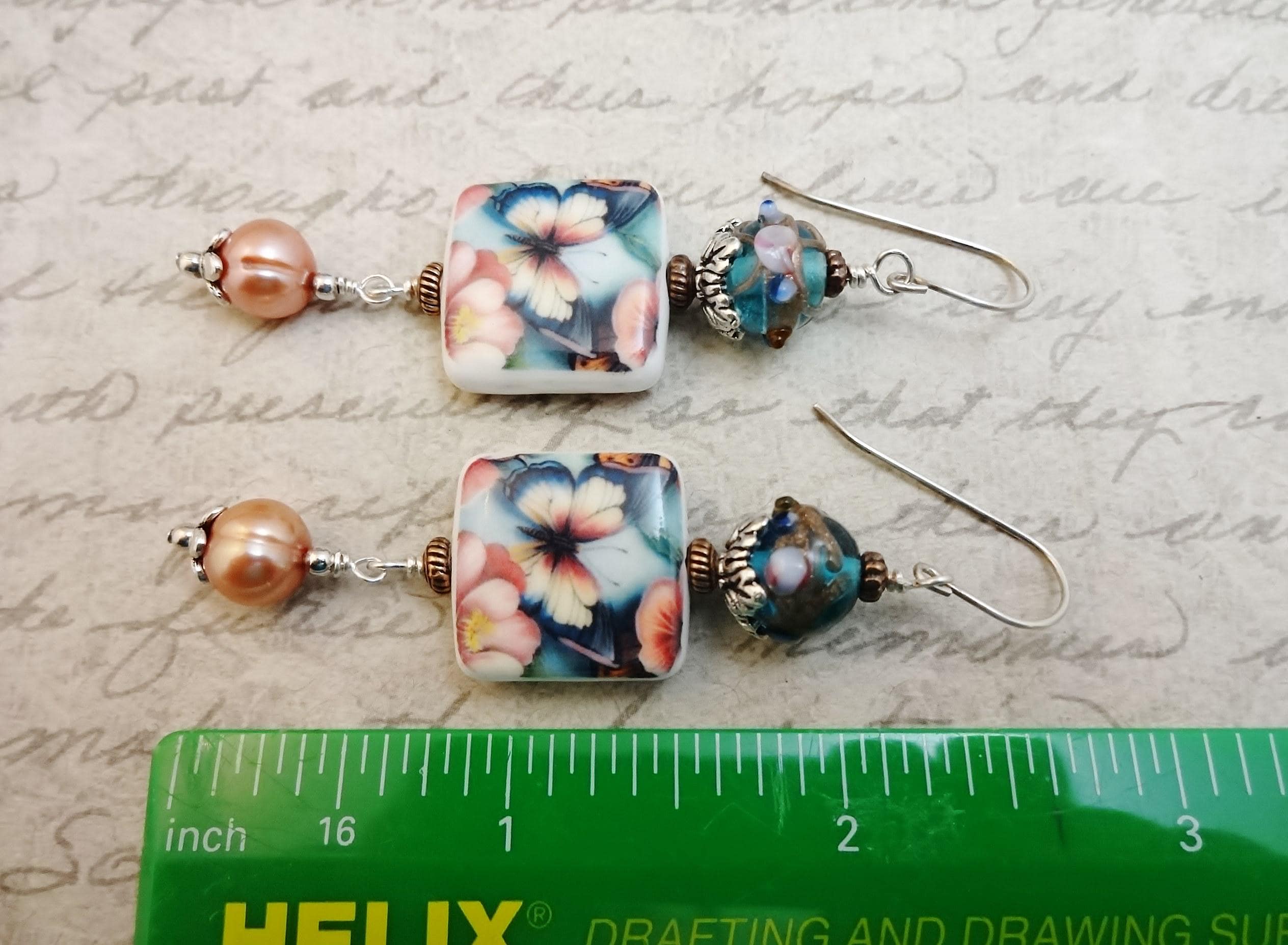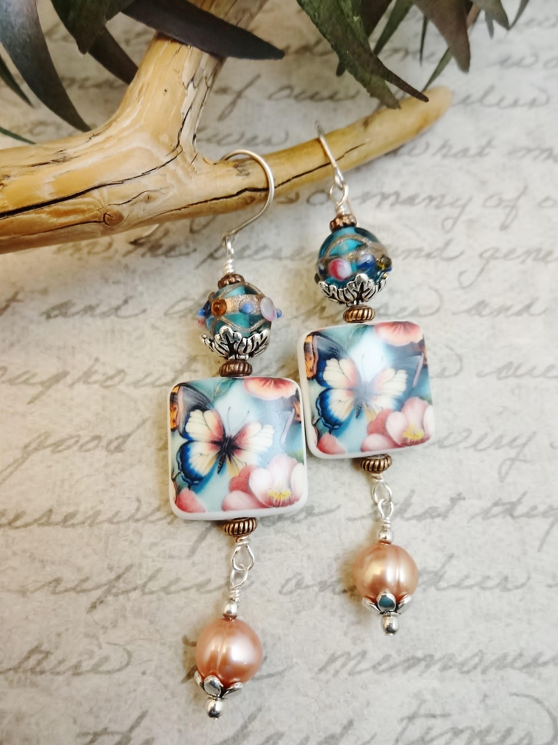 French Porcelain Butterflies and Pearls: Lampwork Glass Peach and Aqua Earrings, Gift for Her, One of a Kind Earrings