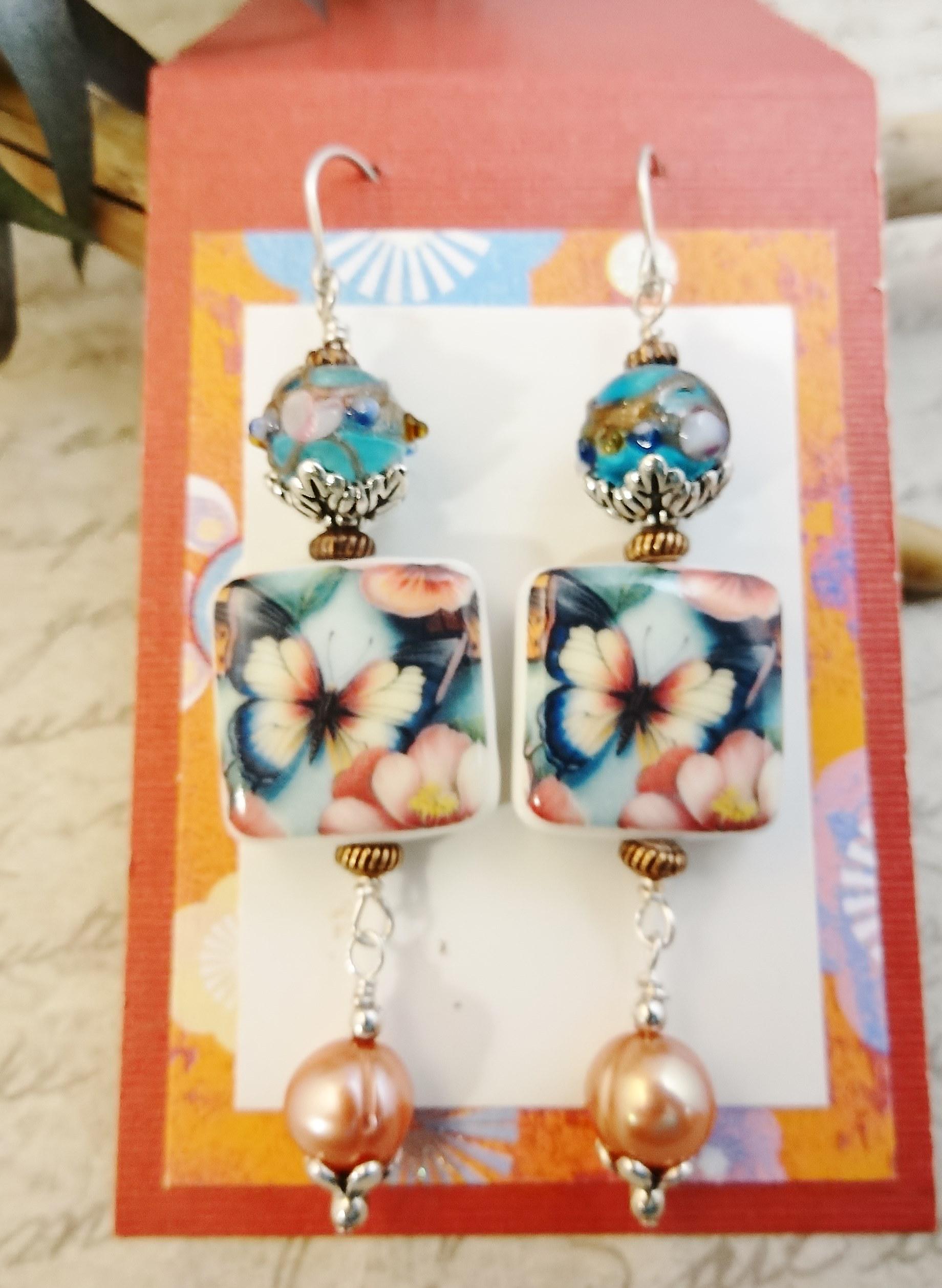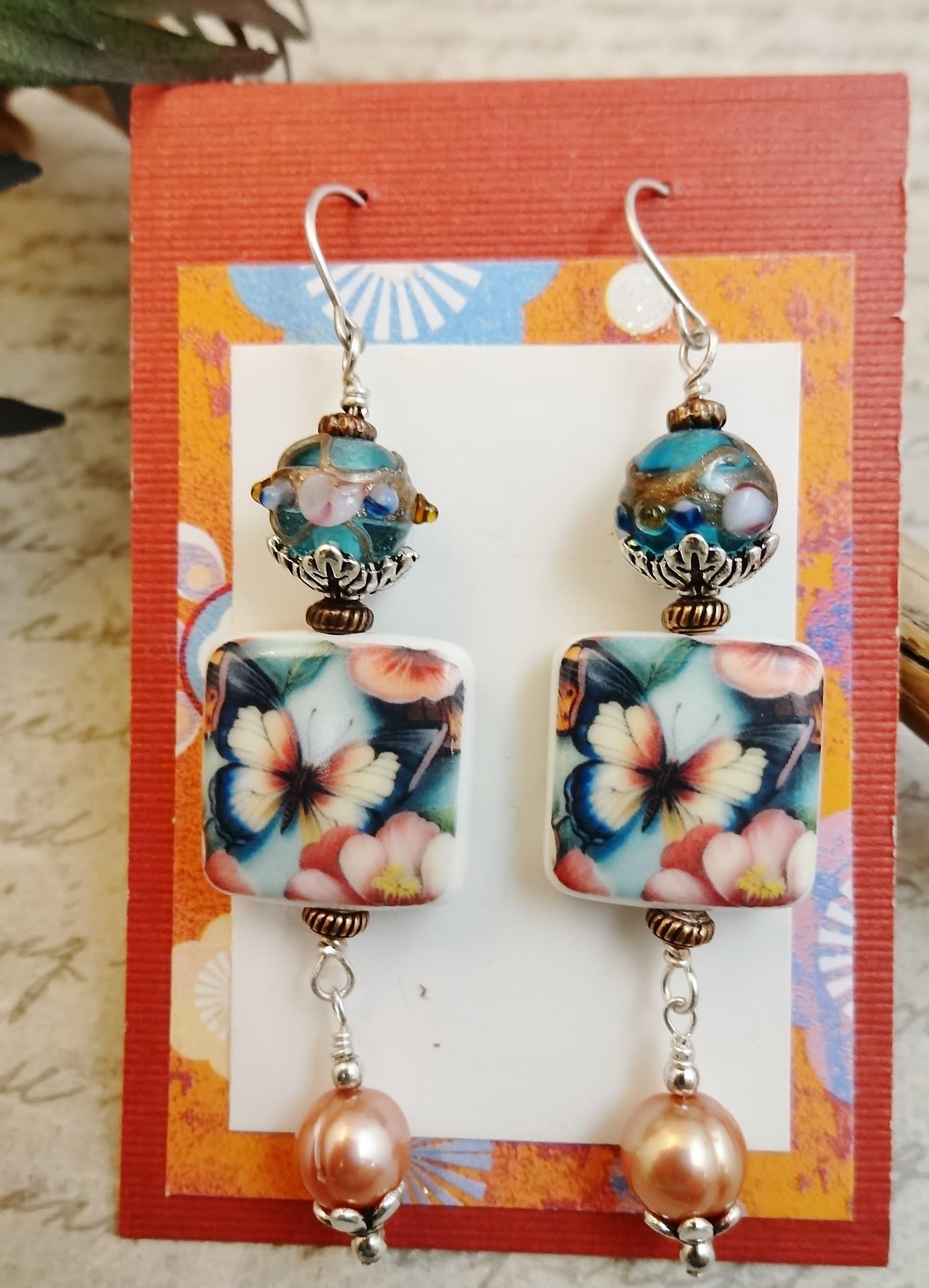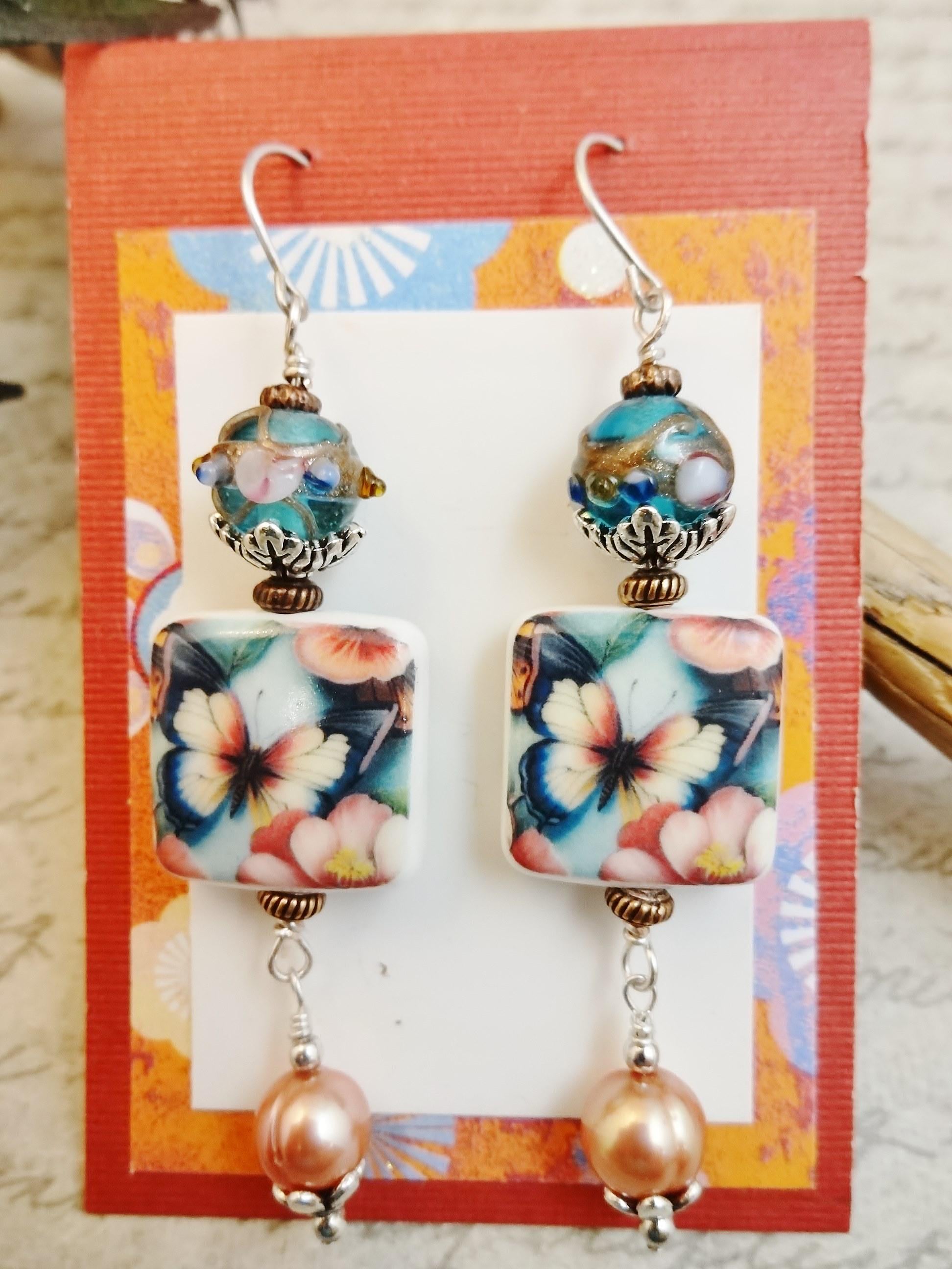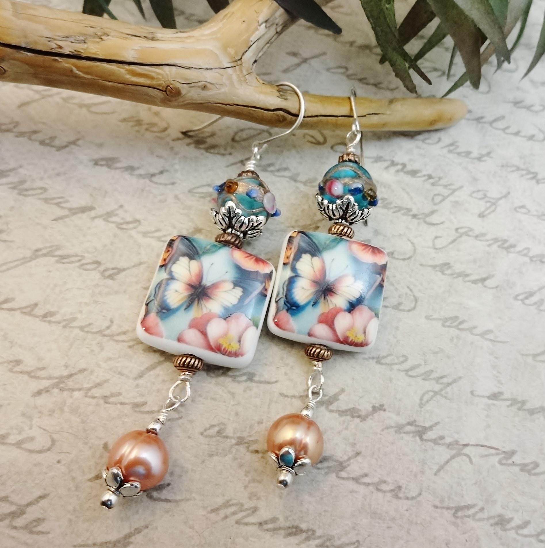 French Porcelain Butterflies and Pearls: Lampwork Glass Peach and Aqua Earrings, Gift for Her, One of a Kind Earrings