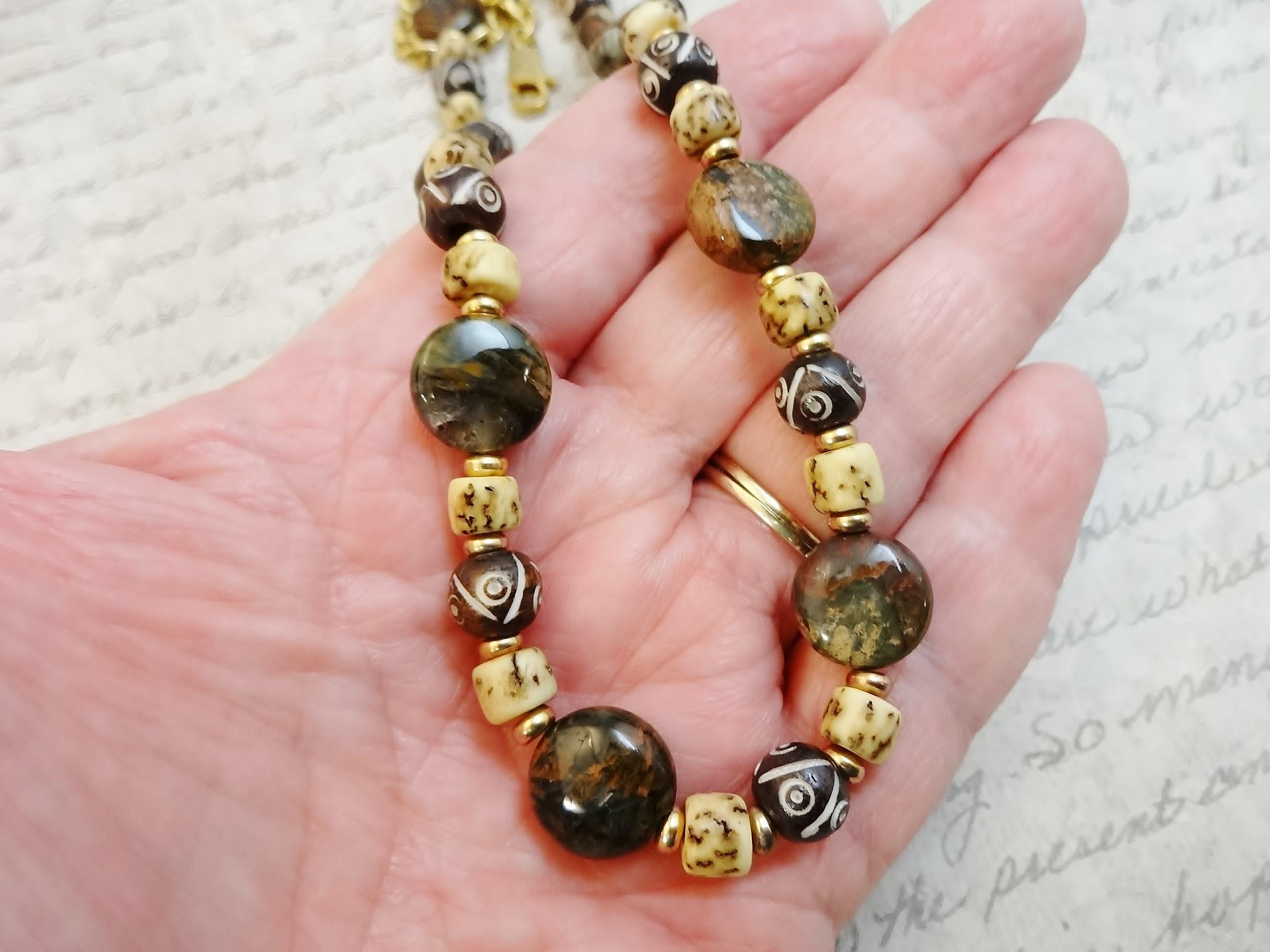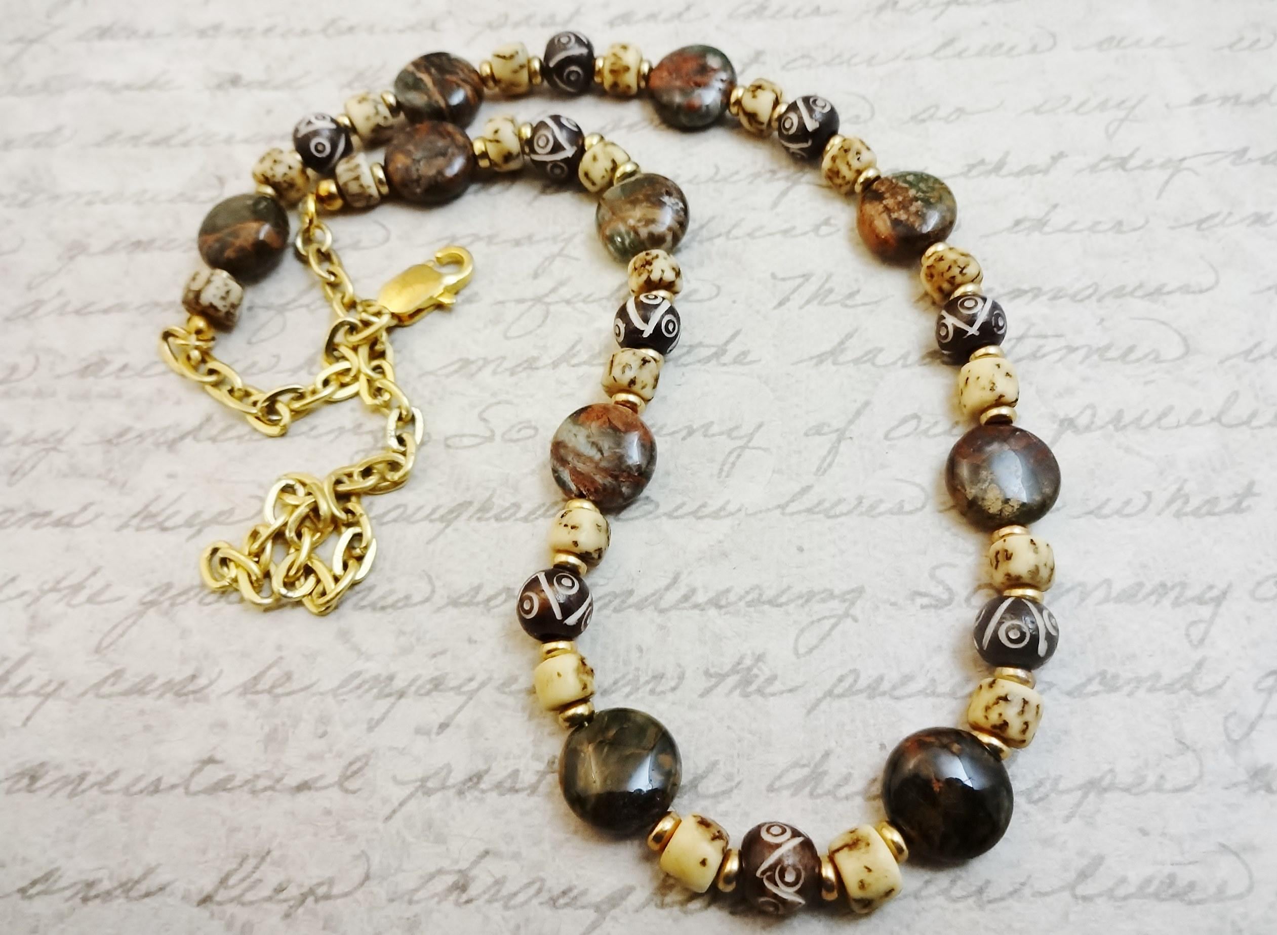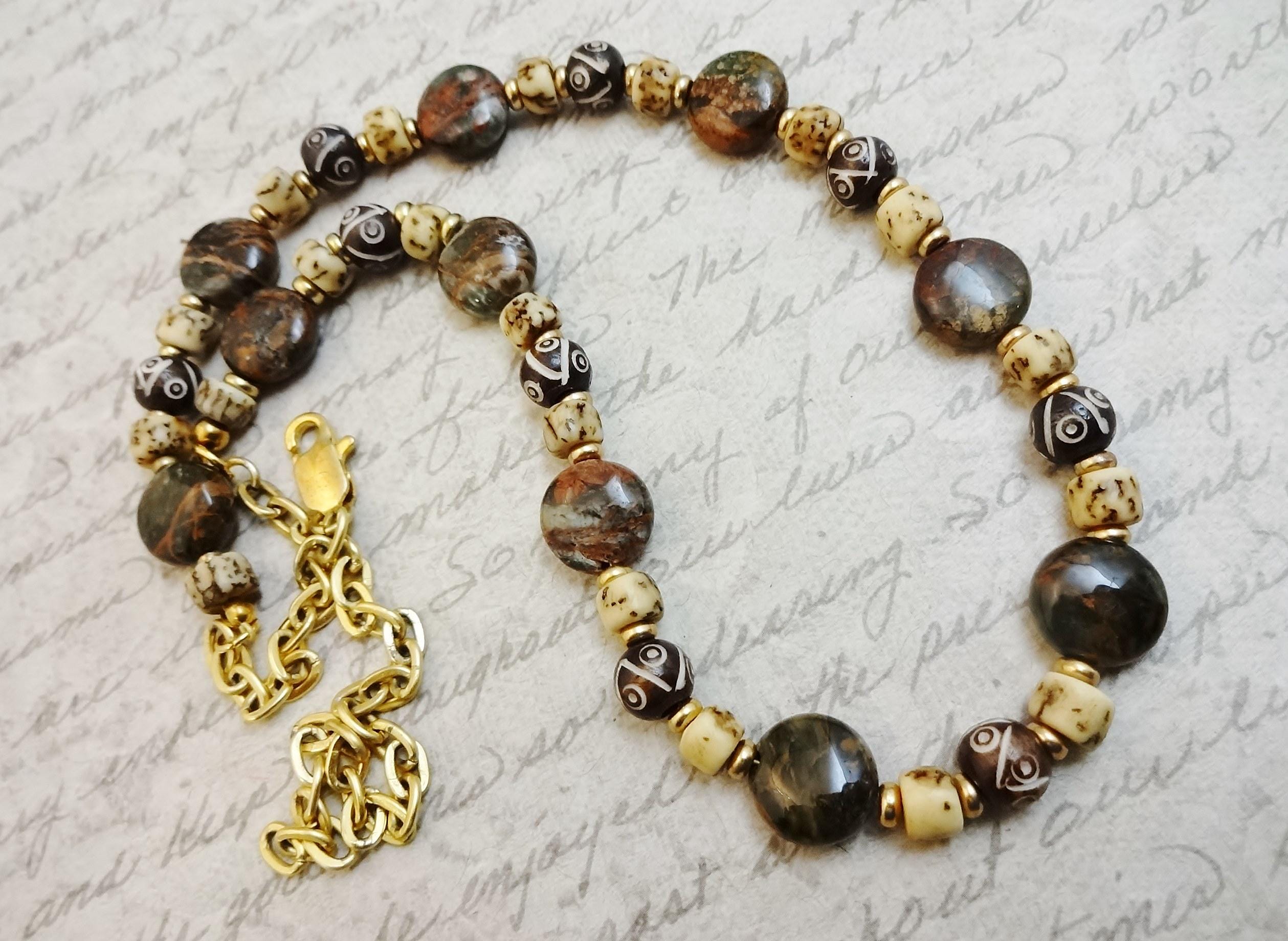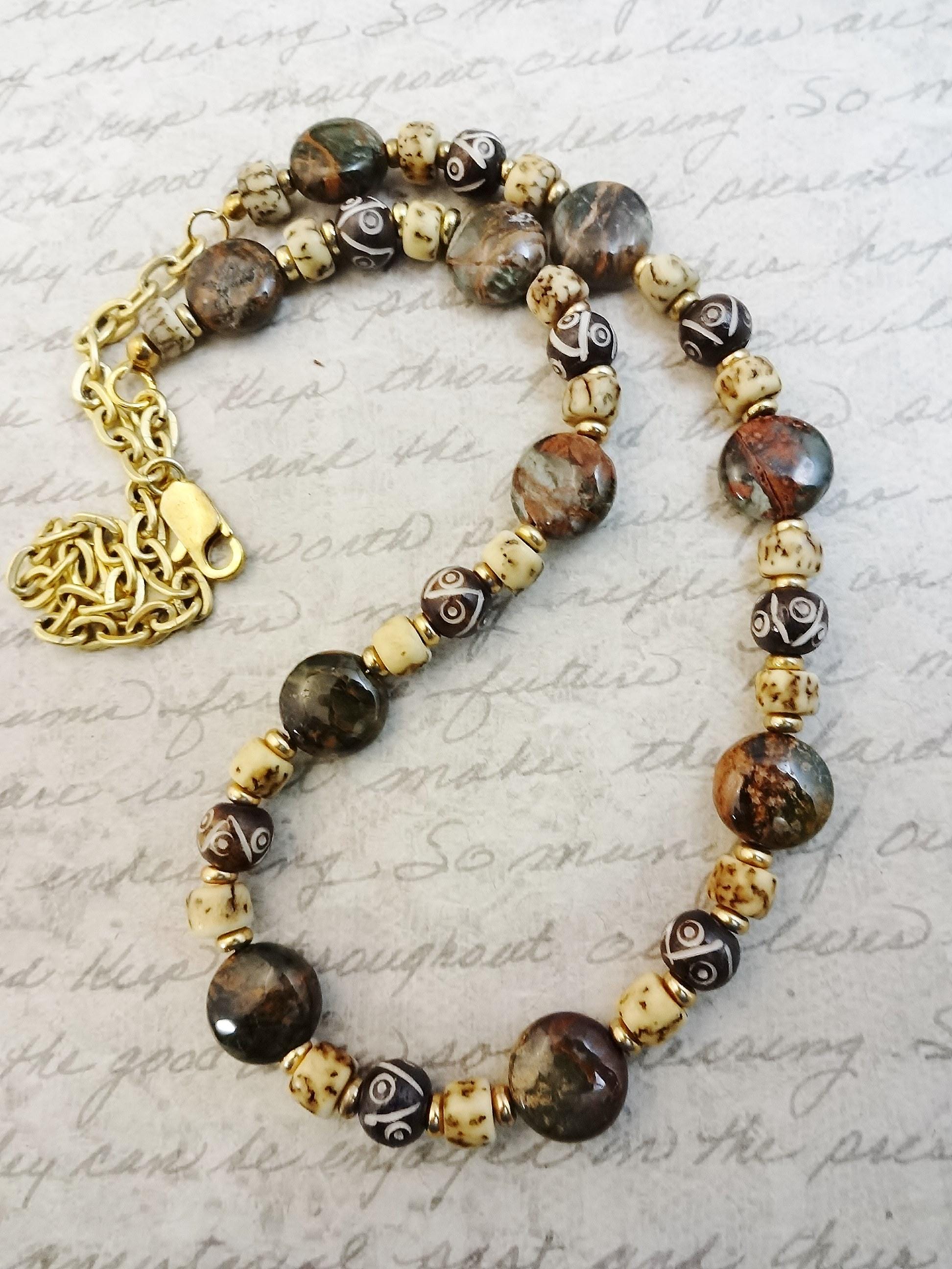 Boulder Opal, Carved Bone and Nut Necklace: Brown Chunky Gemstone Jewelry, Unisex Jewelry