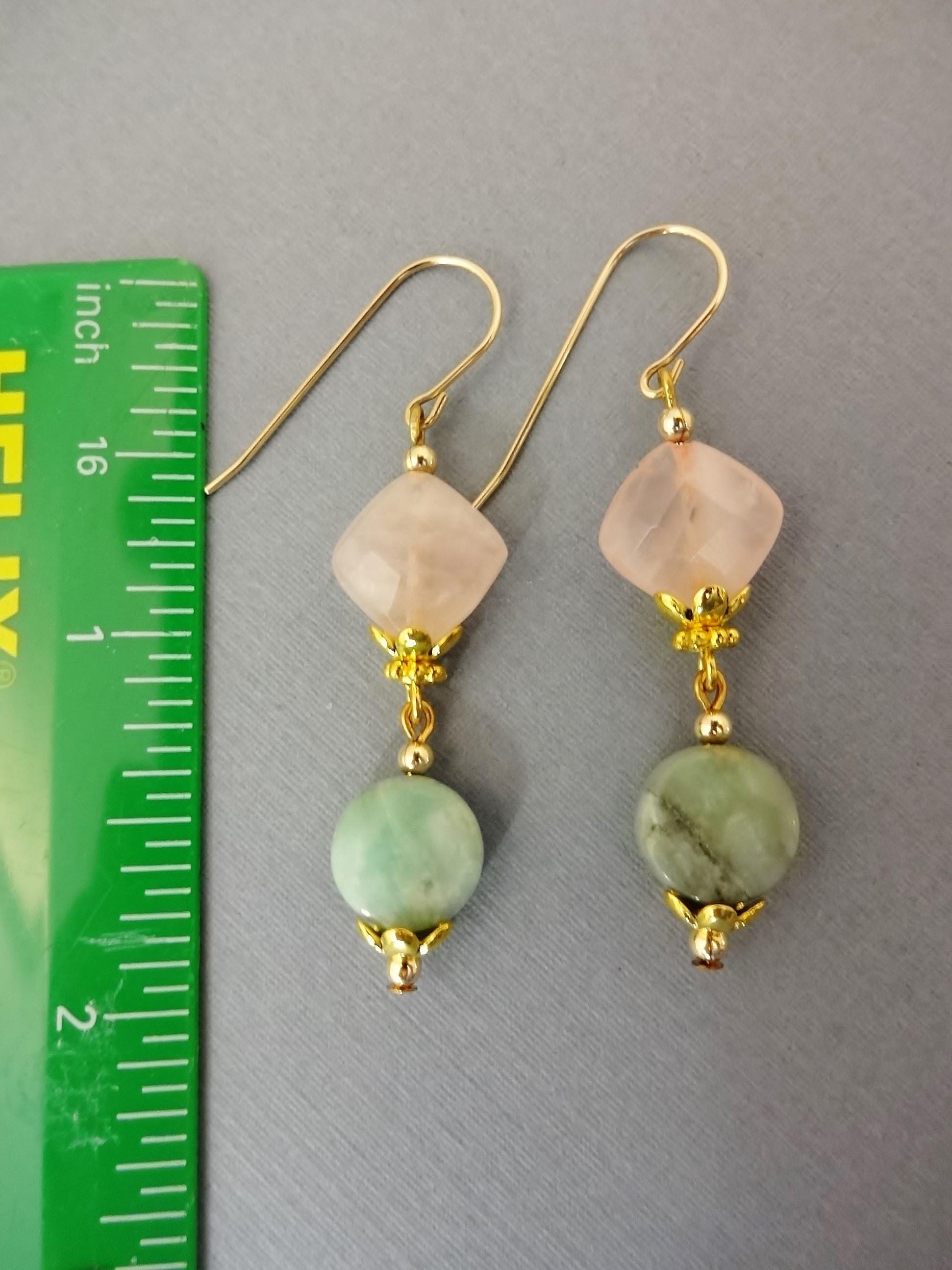 Rose Quartz is a feminine stone that captures the hearts of girls from 5 to 95. These earrings feature Rose Quartz corner drilled faceted flat squares ovals with Chrysoprase coins dangling from the bottom.