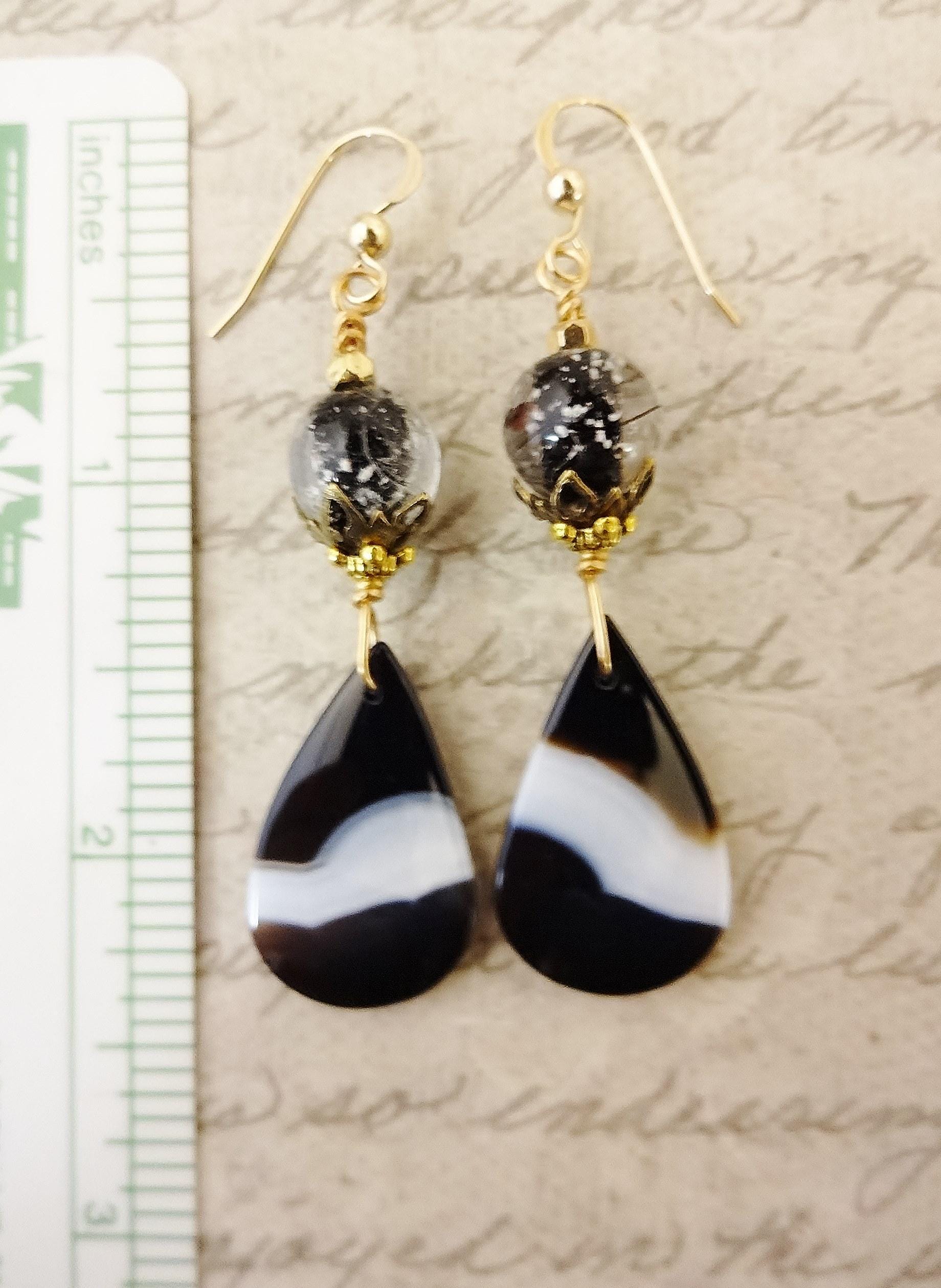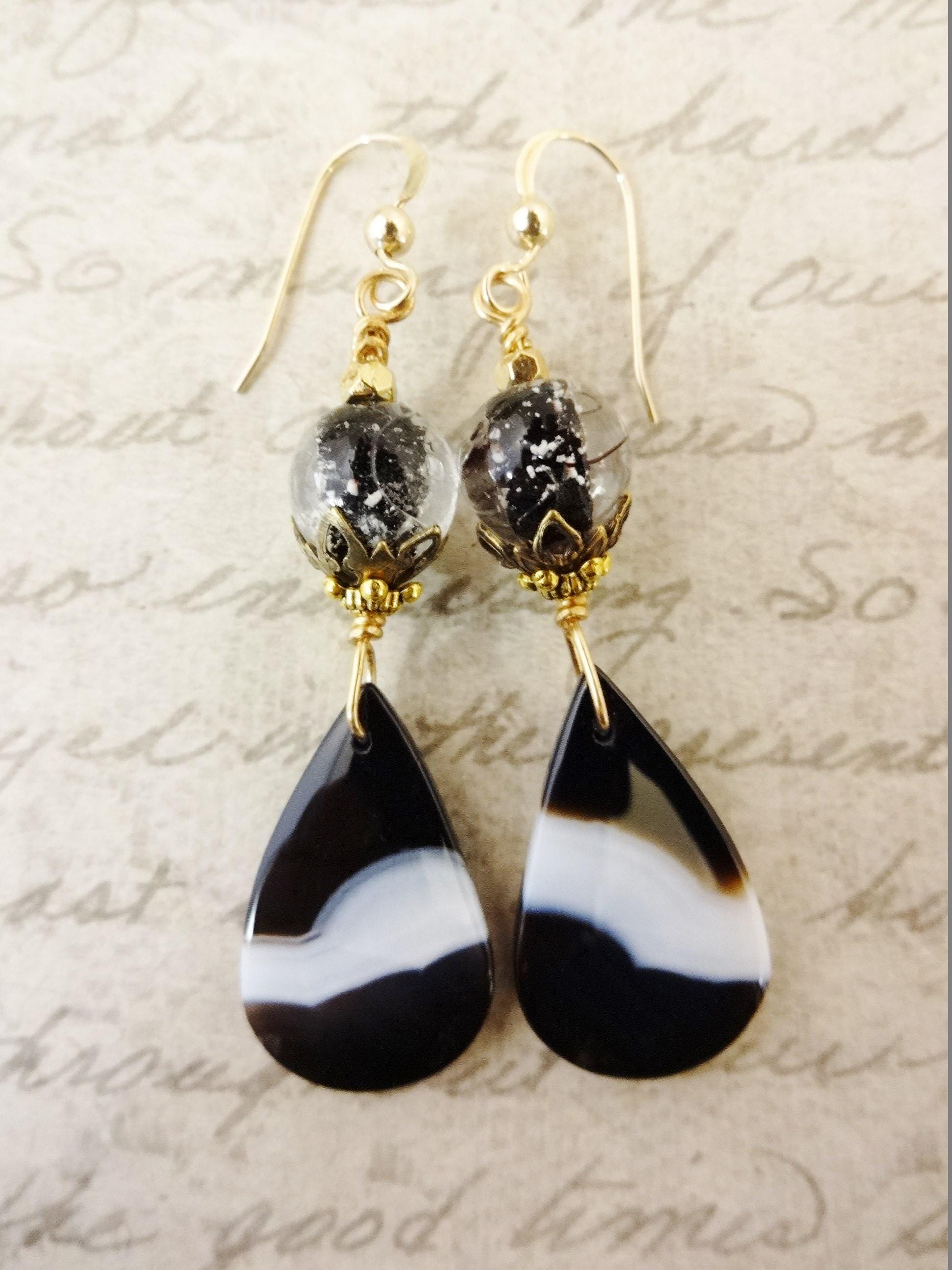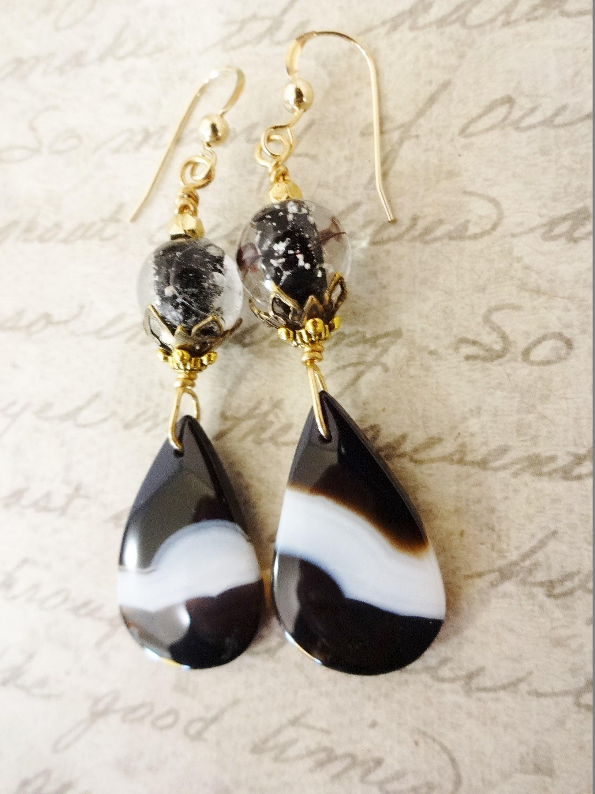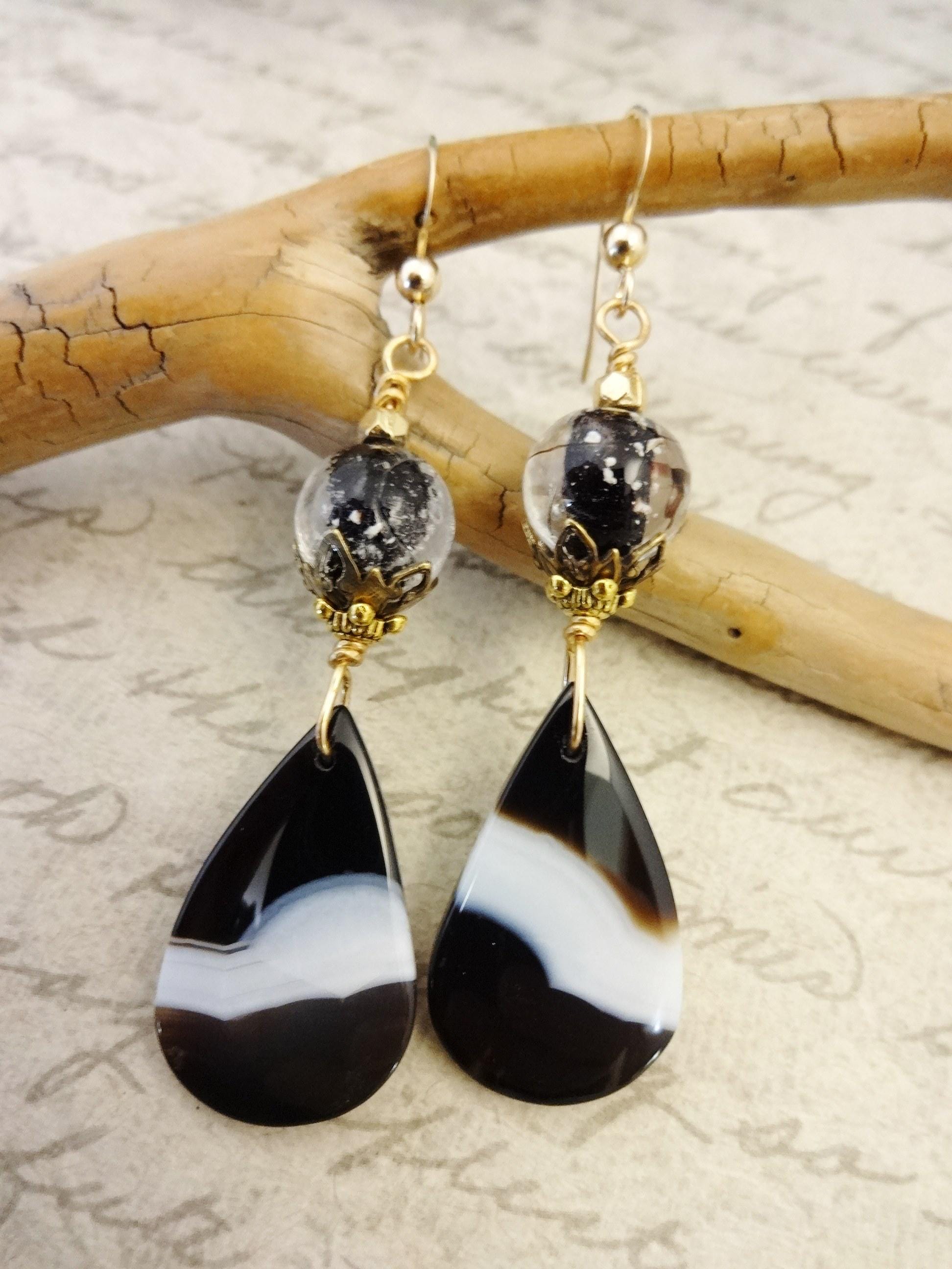These gorgeous earrings feature Striped Onyx teardrop gemstones that I wrapped with gold non-tarnish wire. Above the stones are 10mm Black Lampwork rounds seated above small gold-plated bead caps and vintage brass filigree bead caps.