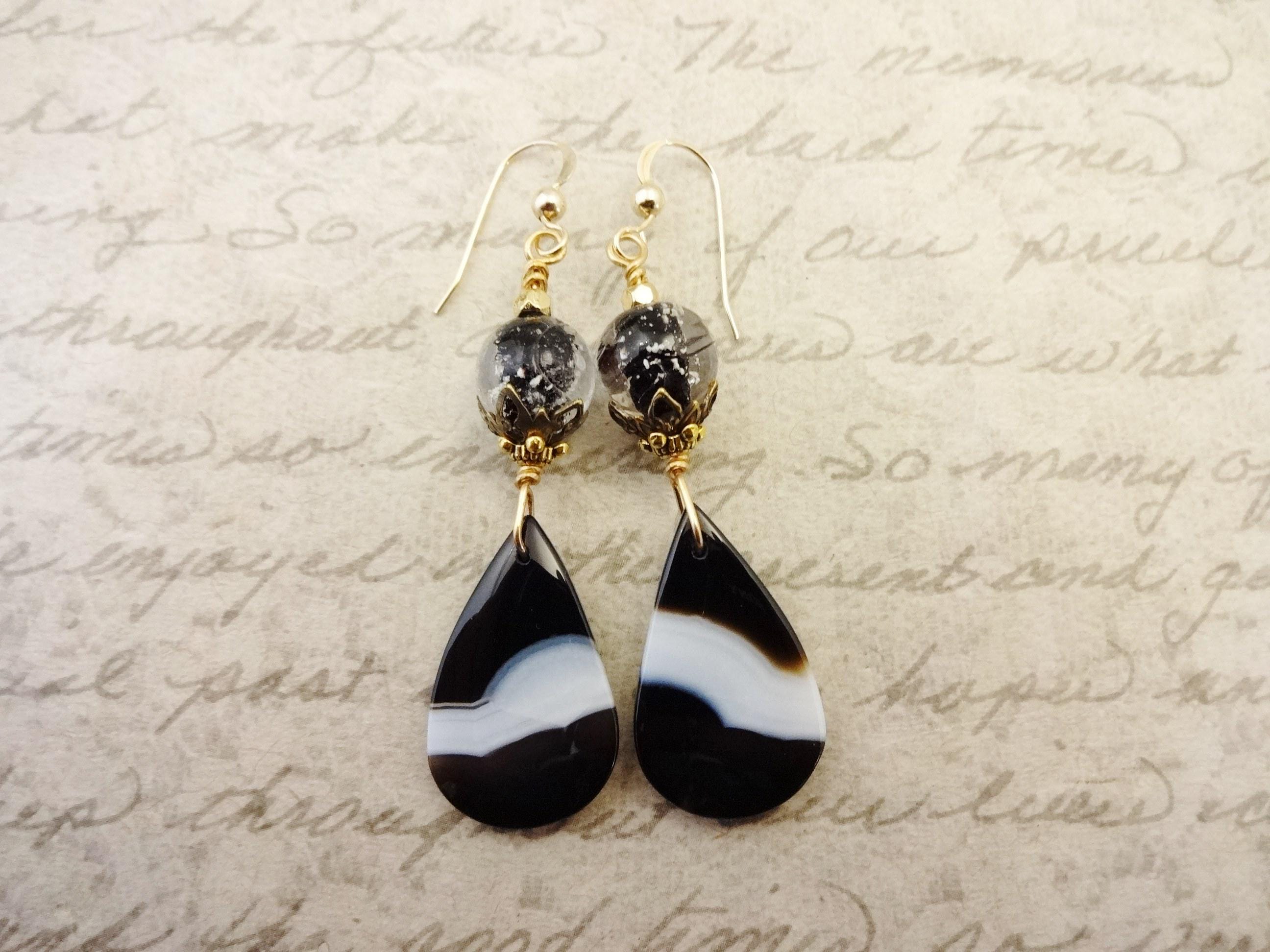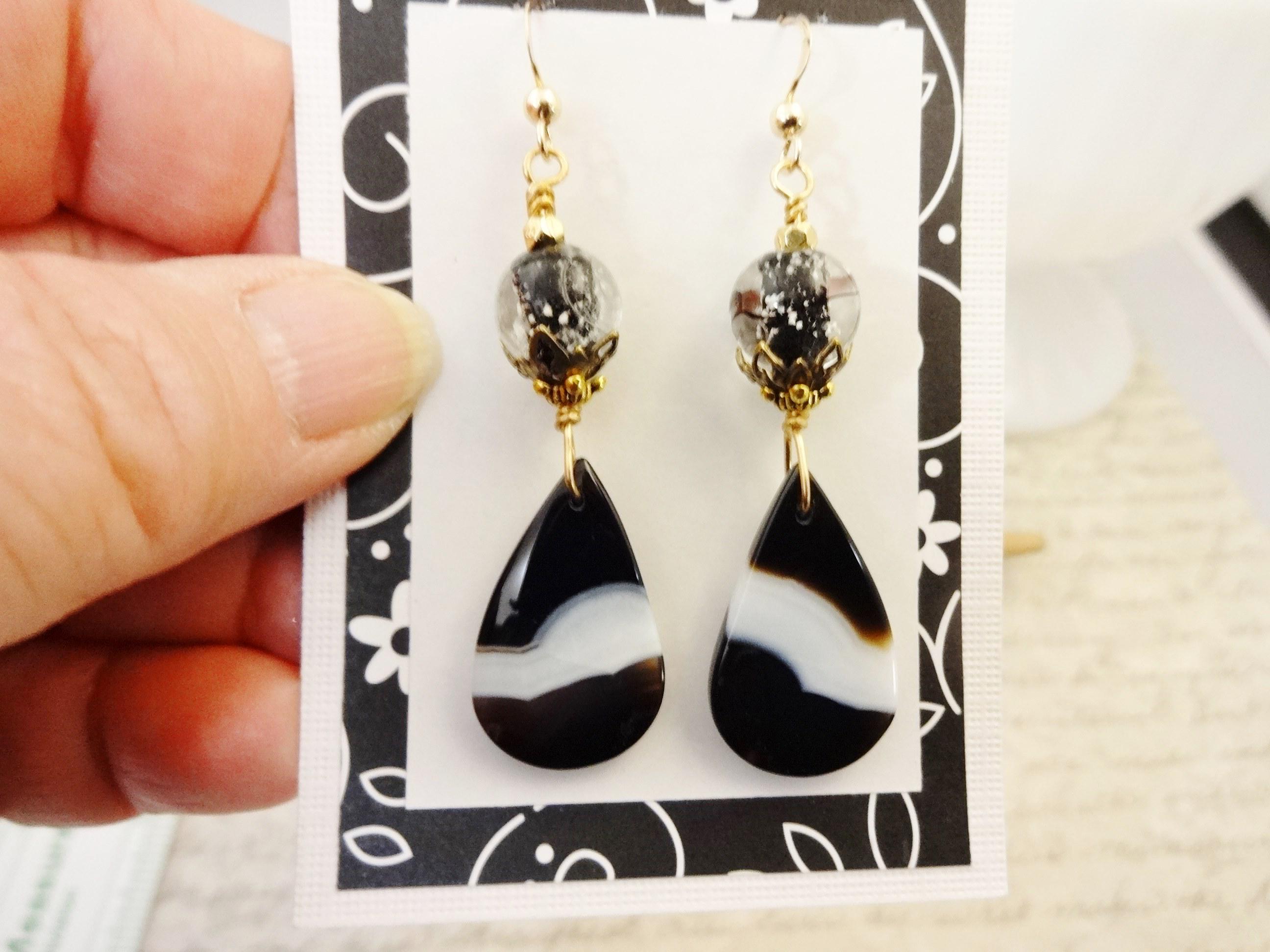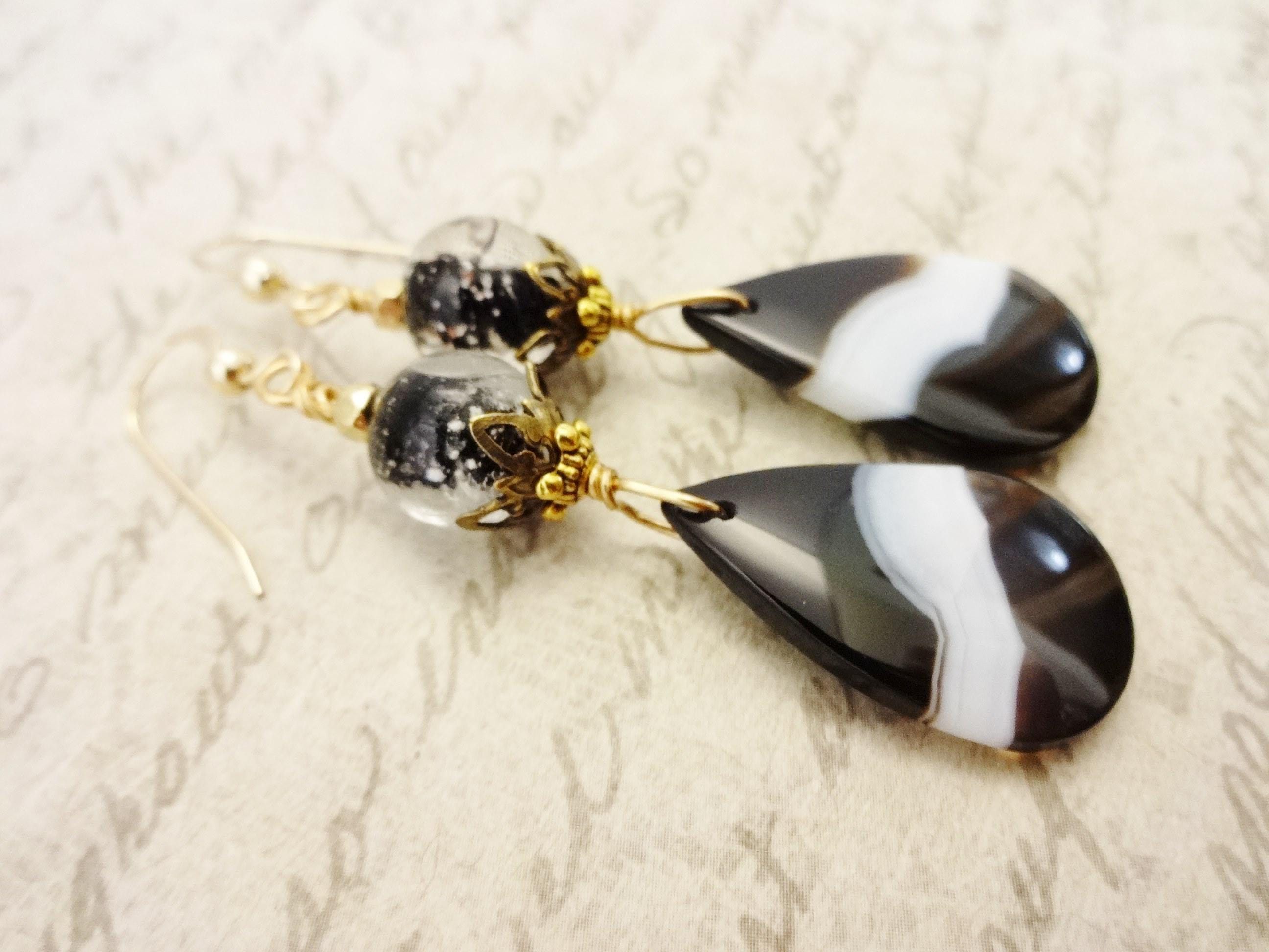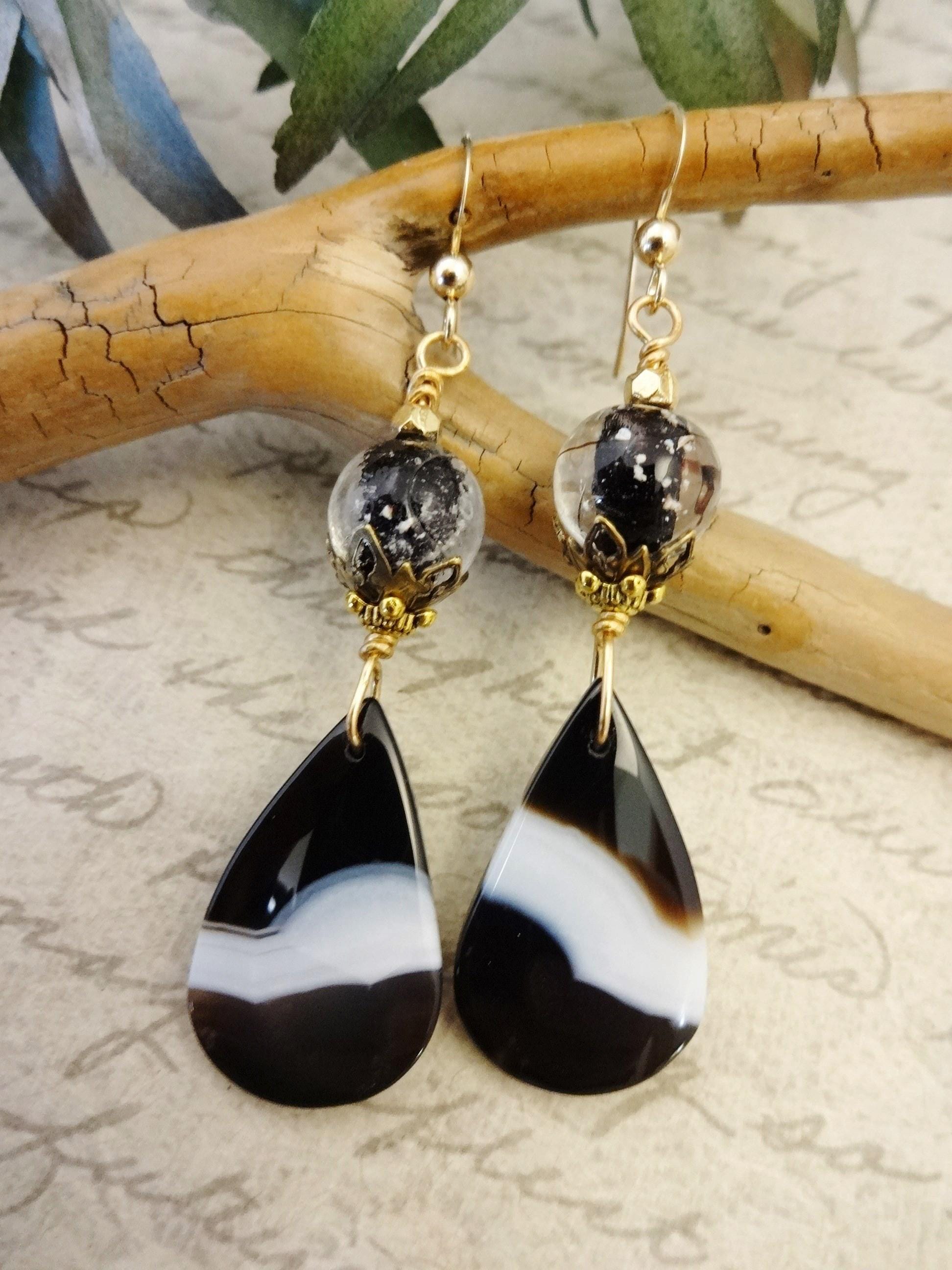 These gorgeous earrings feature Striped Onyx teardrop gemstones that I wrapped with gold non-tarnish wire. Above the stones are 10mm Black Lampwork rounds seated above small gold-plated bead caps and vintage brass filigree bead caps.