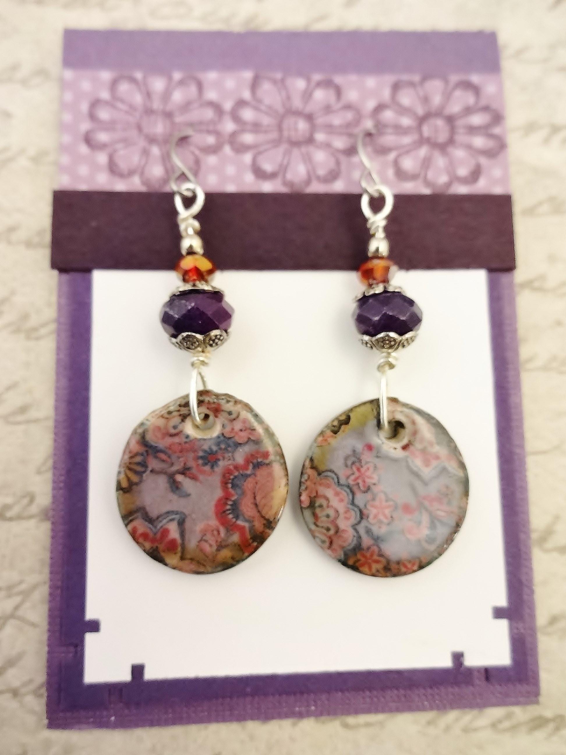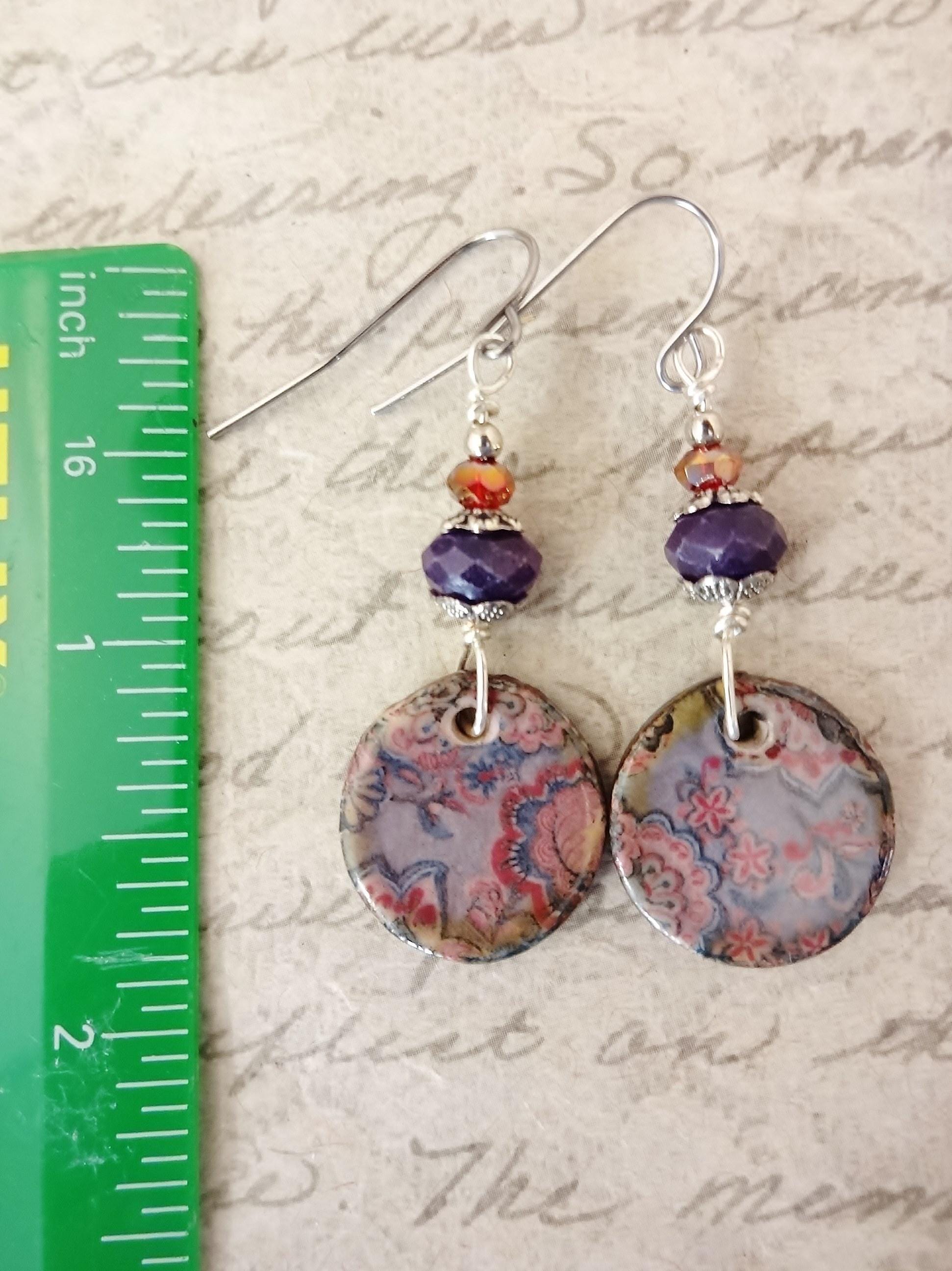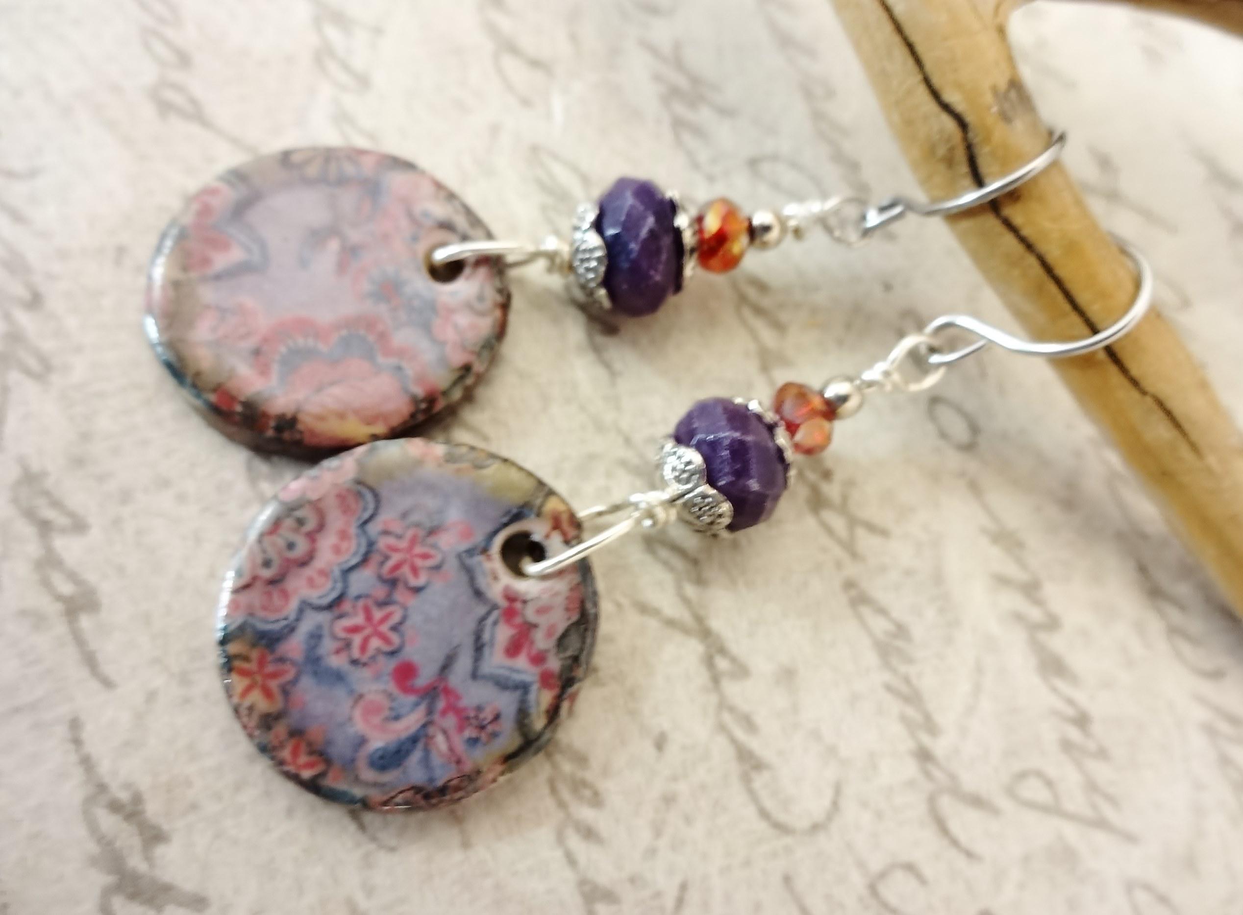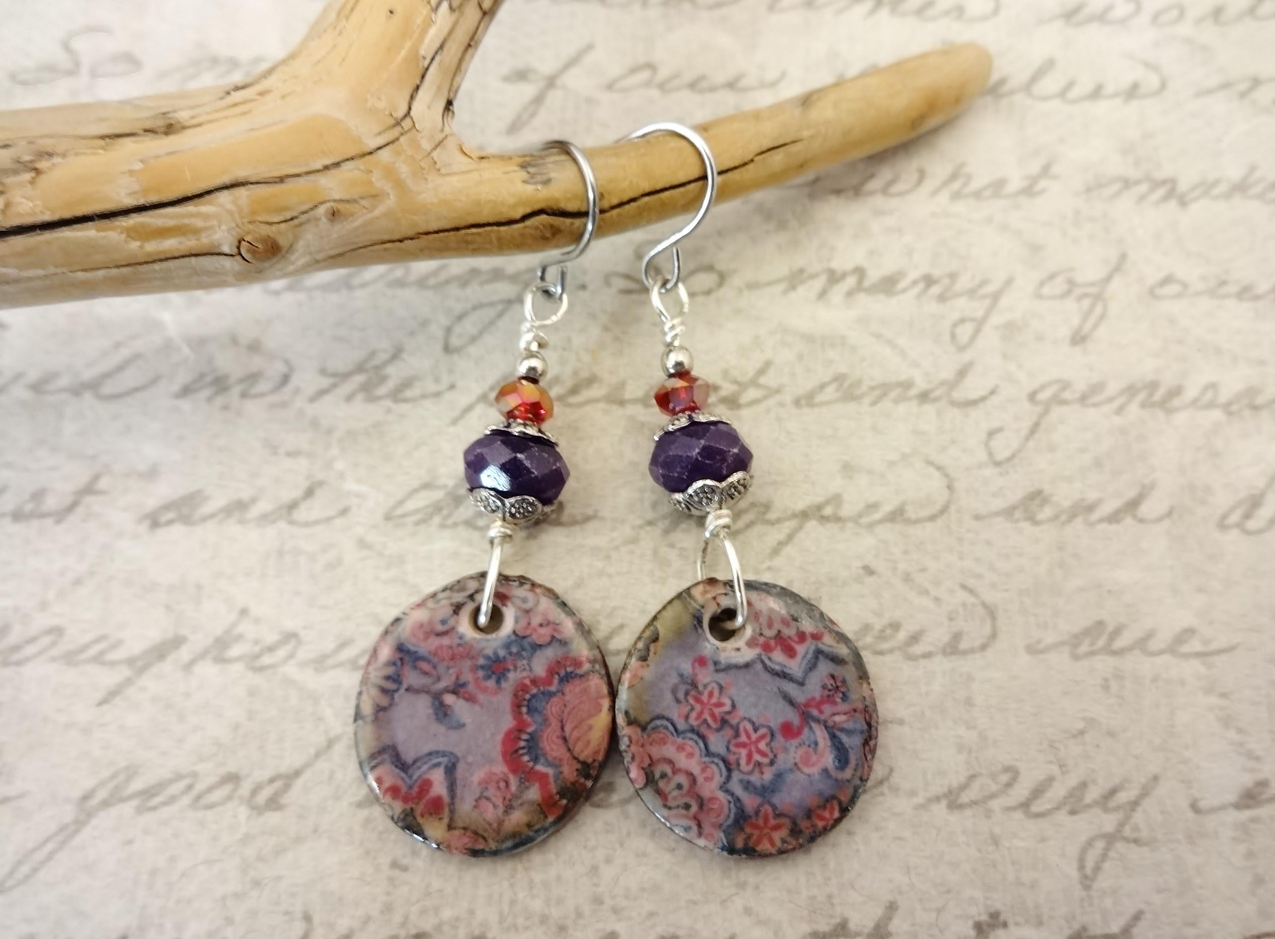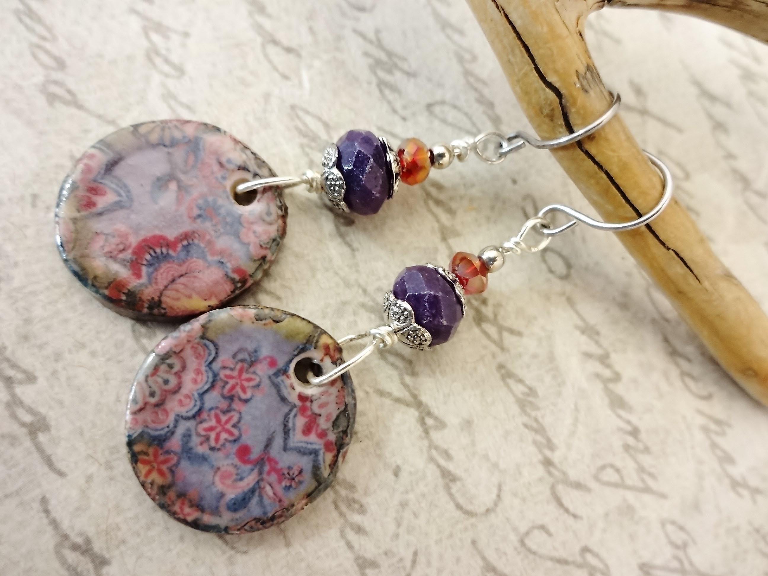 I paired these shabby chic boho Ceramic charms with dark purple Sugilite stone faceted rondelles and small red crystal rondelles. I wire-wrapped the beads to the components with non-tarnish silver wire and added silver bead caps and a small Sterling Silver bead on top.