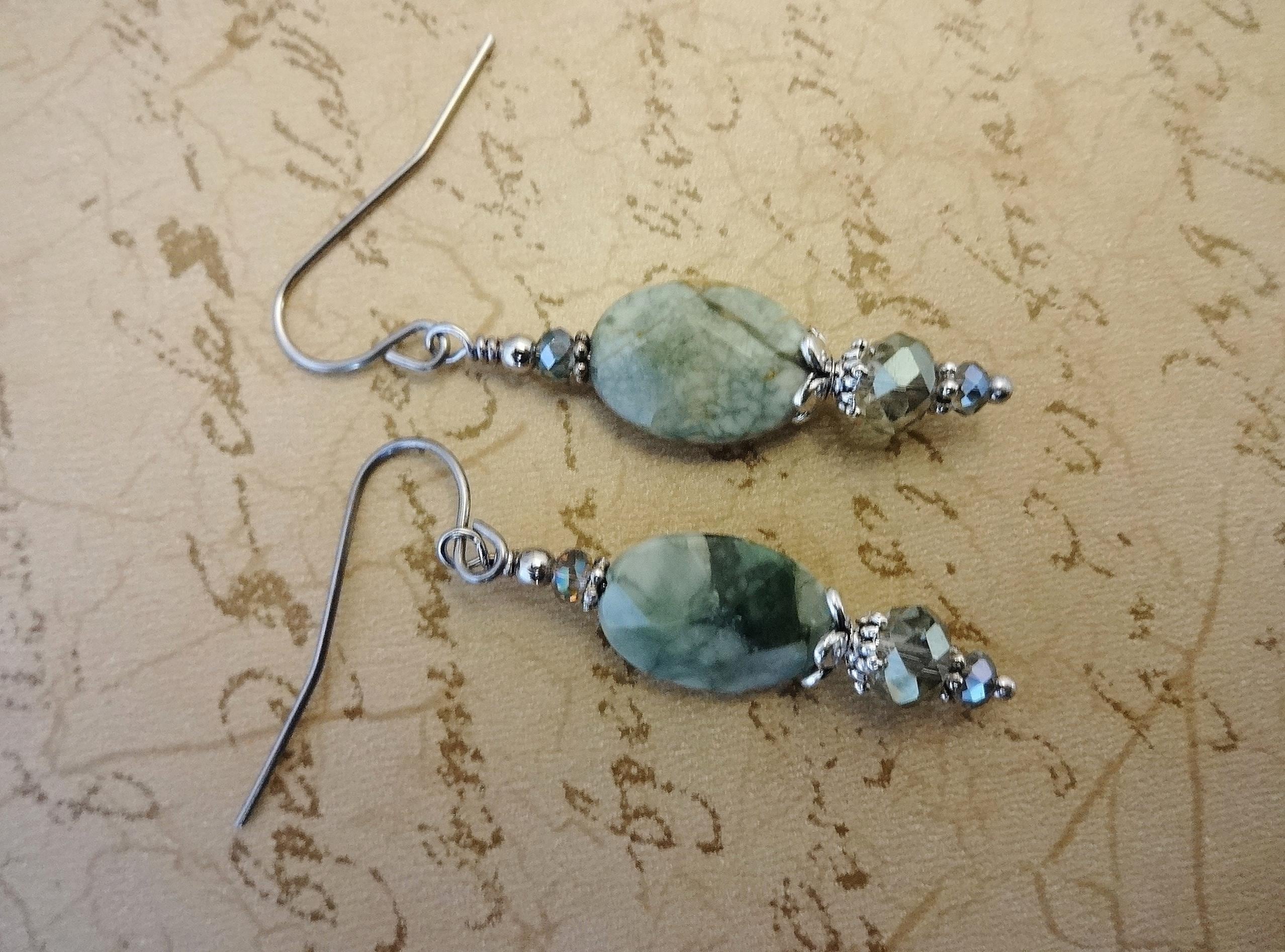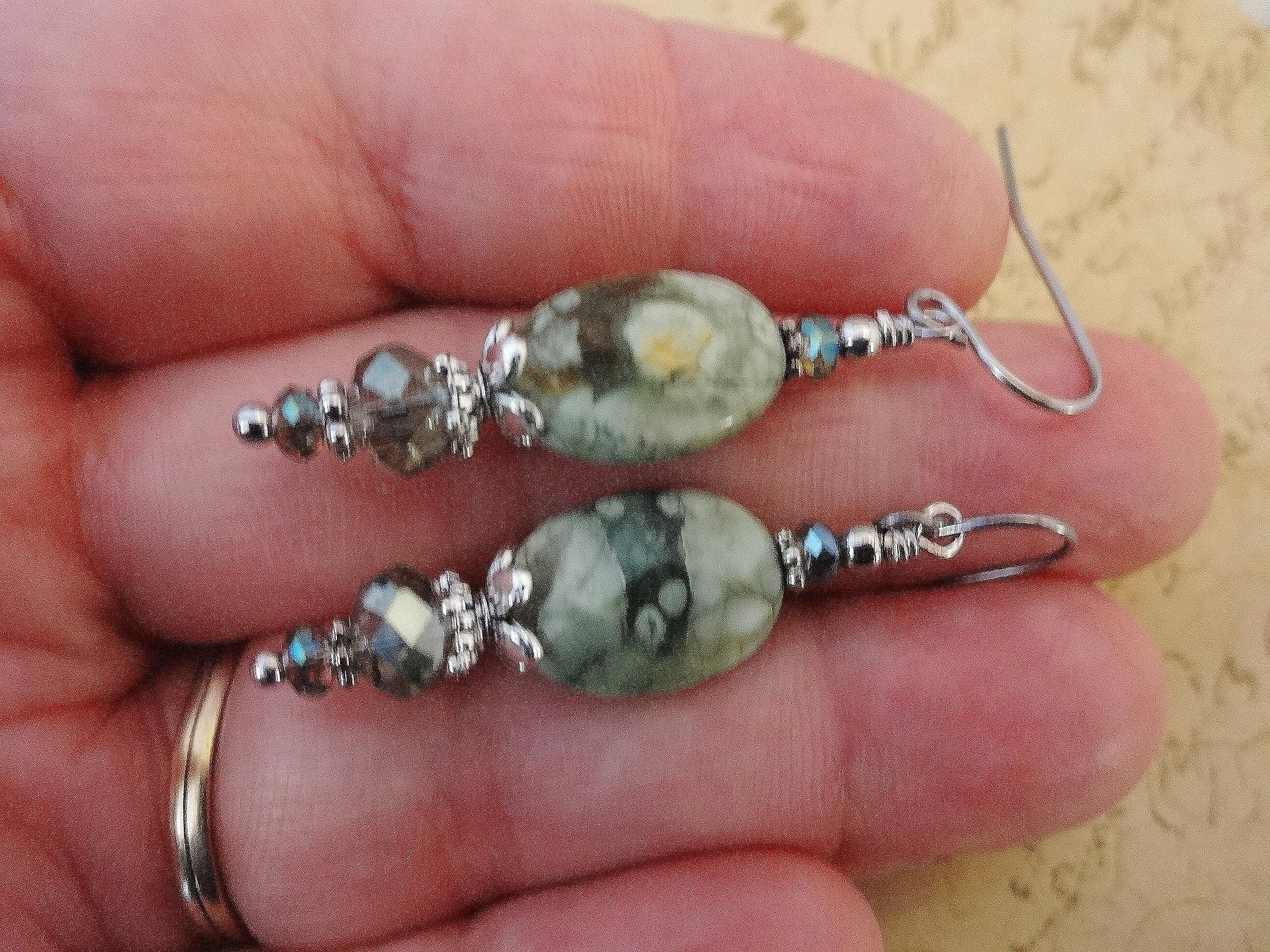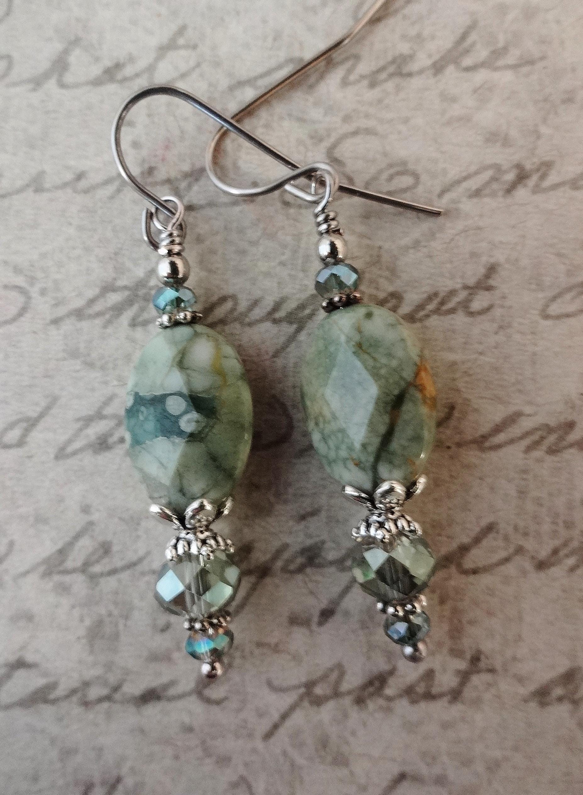 Green Rhyolite Gemstone Earrings: Green Stone and Crystal Boho Jewelry, Rainforest Jasper Earrings, Boho Earrings, Gift for Her