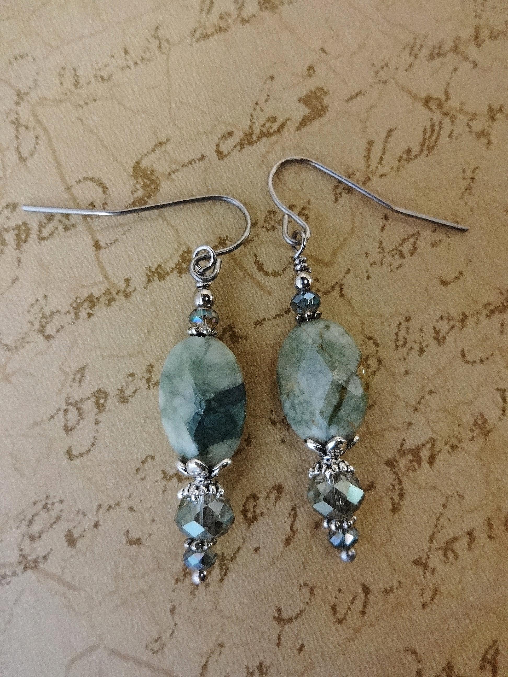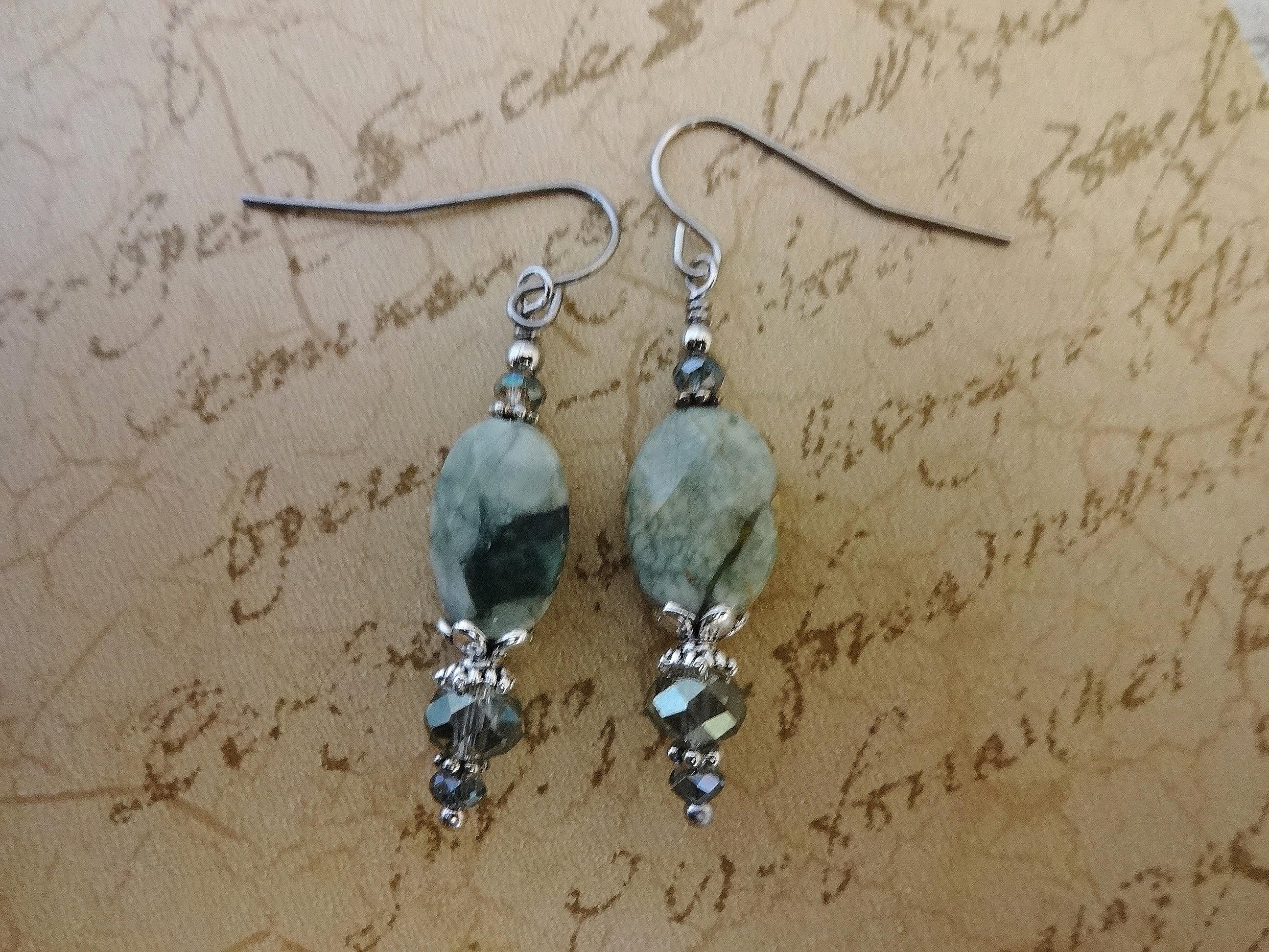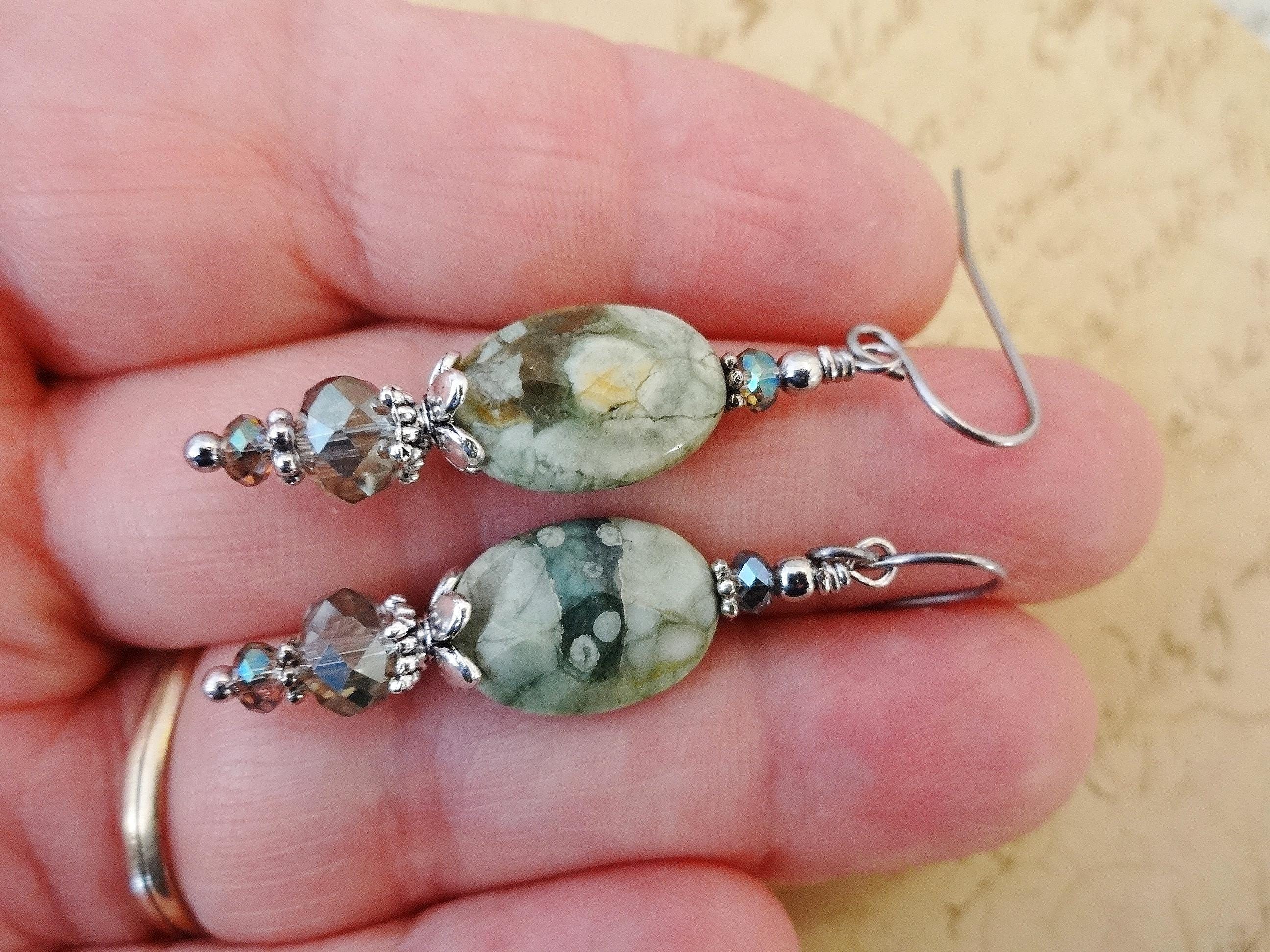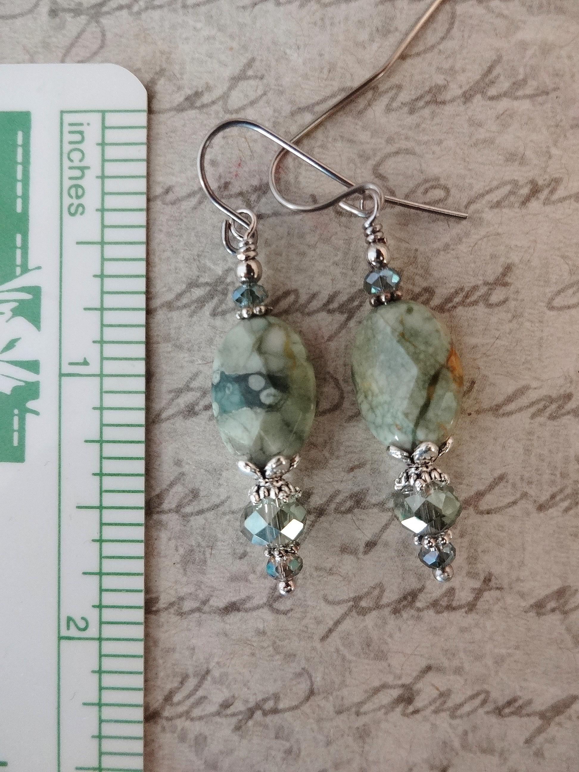 Green Rhyolite Gemstone Earrings: Green Stone and Crystal Boho Jewelry, Rainforest Jasper Earrings, Boho Earrings, Gift for Her