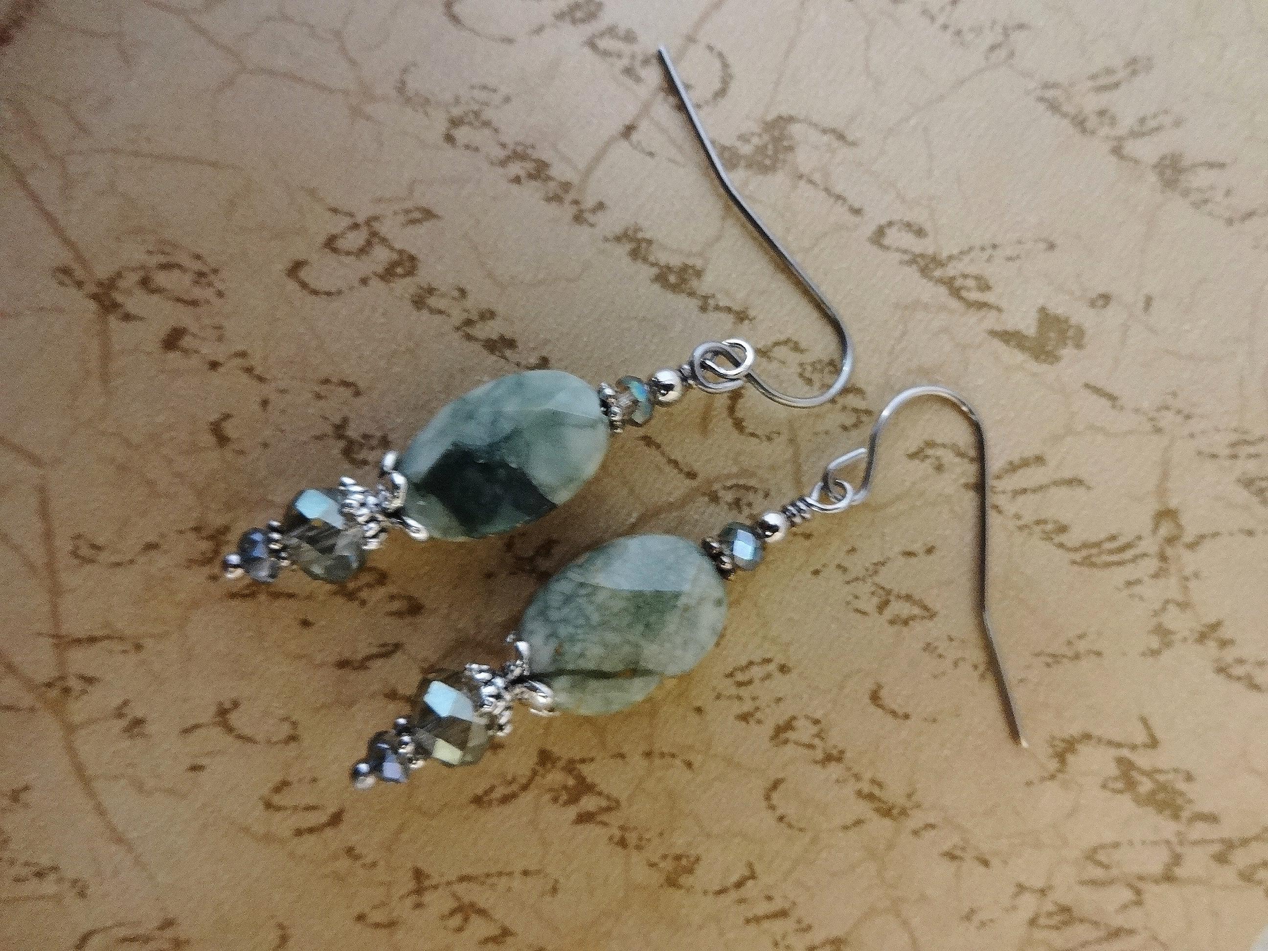 These earrings feature large, faceted Ryolite ovals and crystal rondelles. Below the stones are two sizes of green luster Czech Firepolish rondelles that I've strung on silver wire. Silver plated pewter spacer beads and bead caps separate the beads and add to the vintage feel of the earrings. One more small crystal sits on the very top of the stack with a Sterling Silver bead above it.