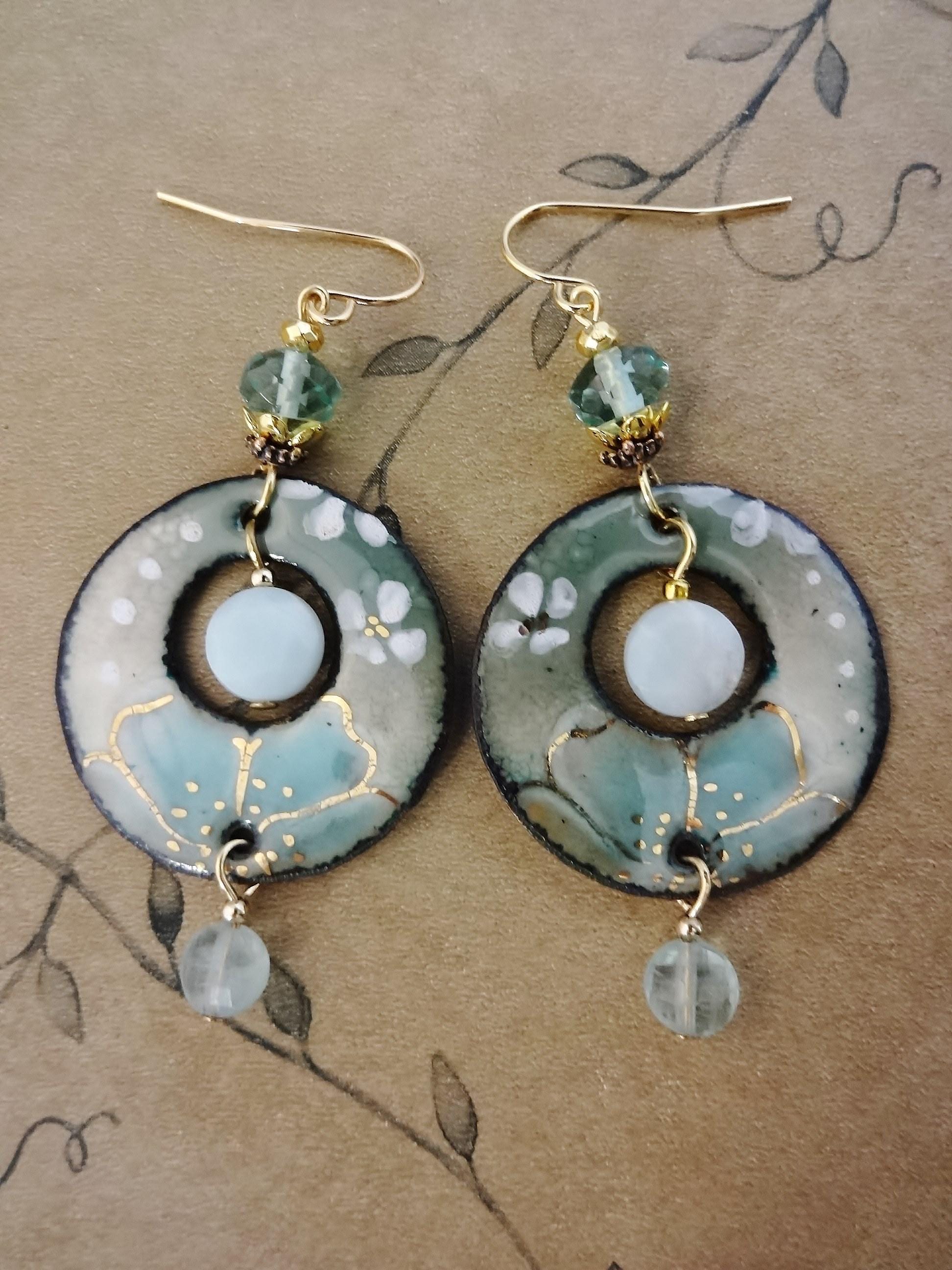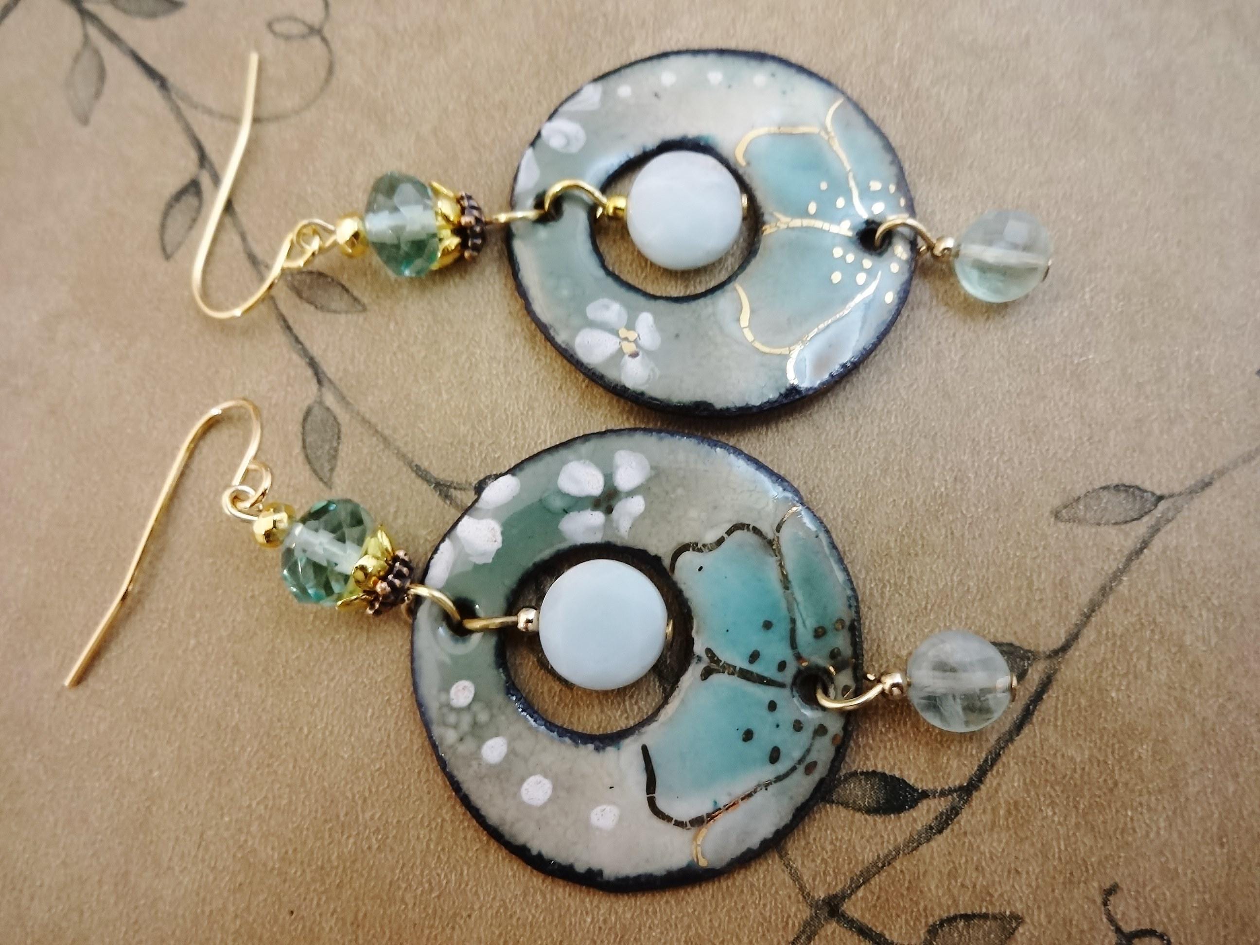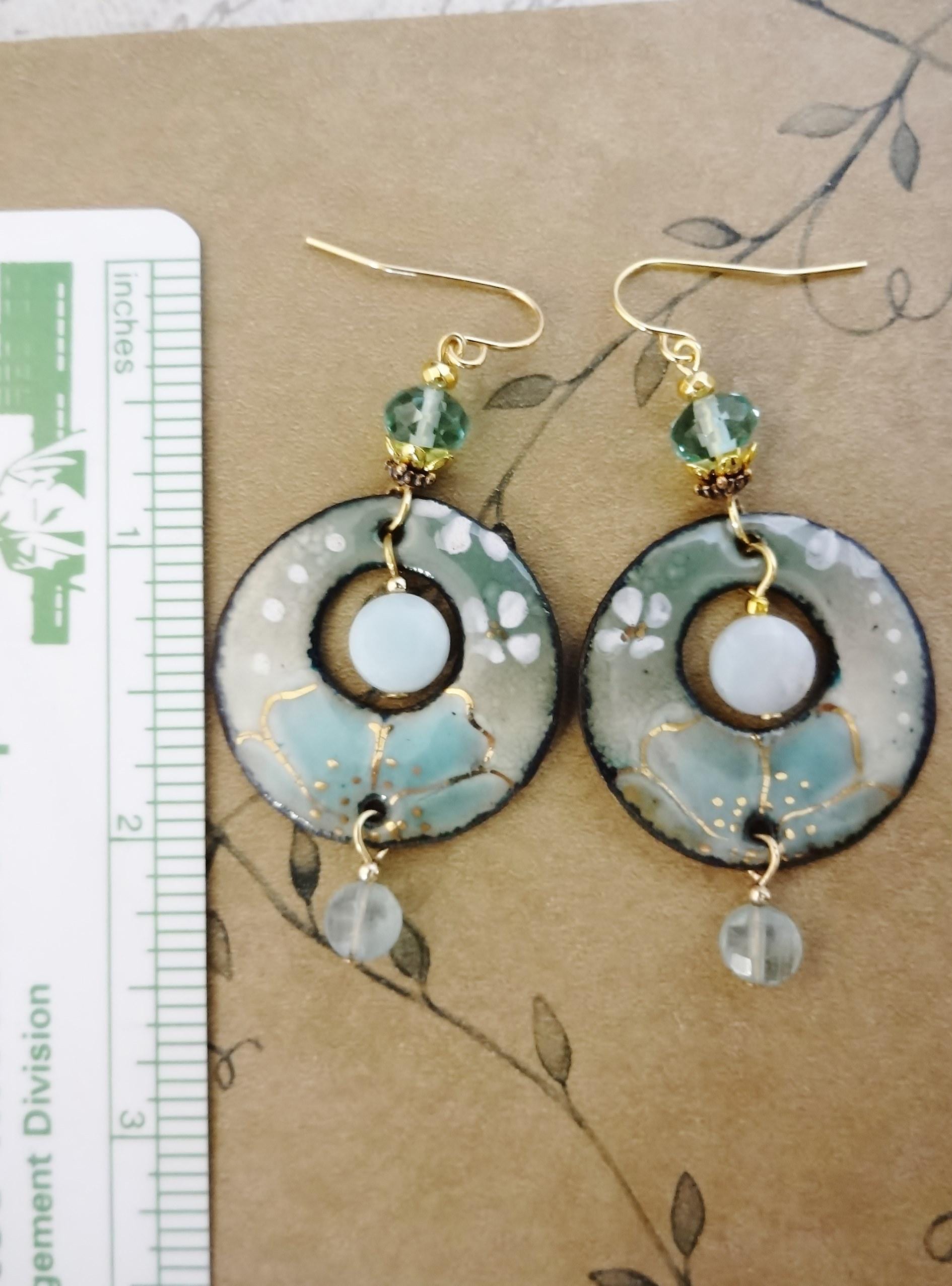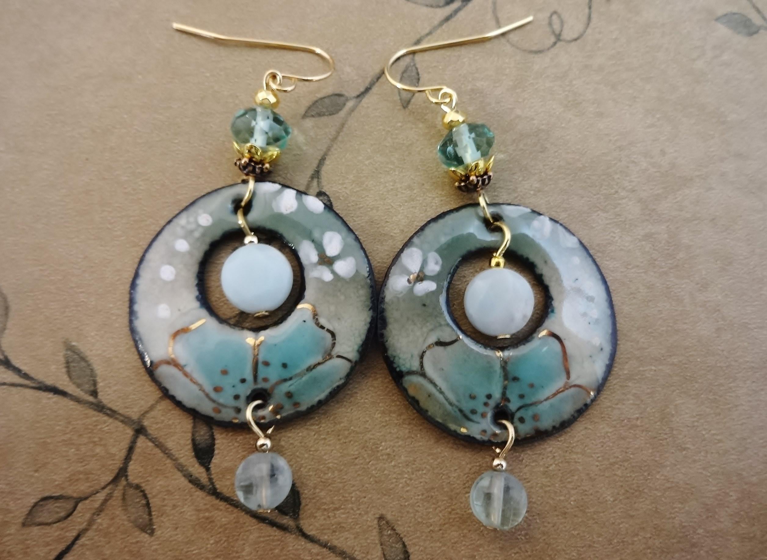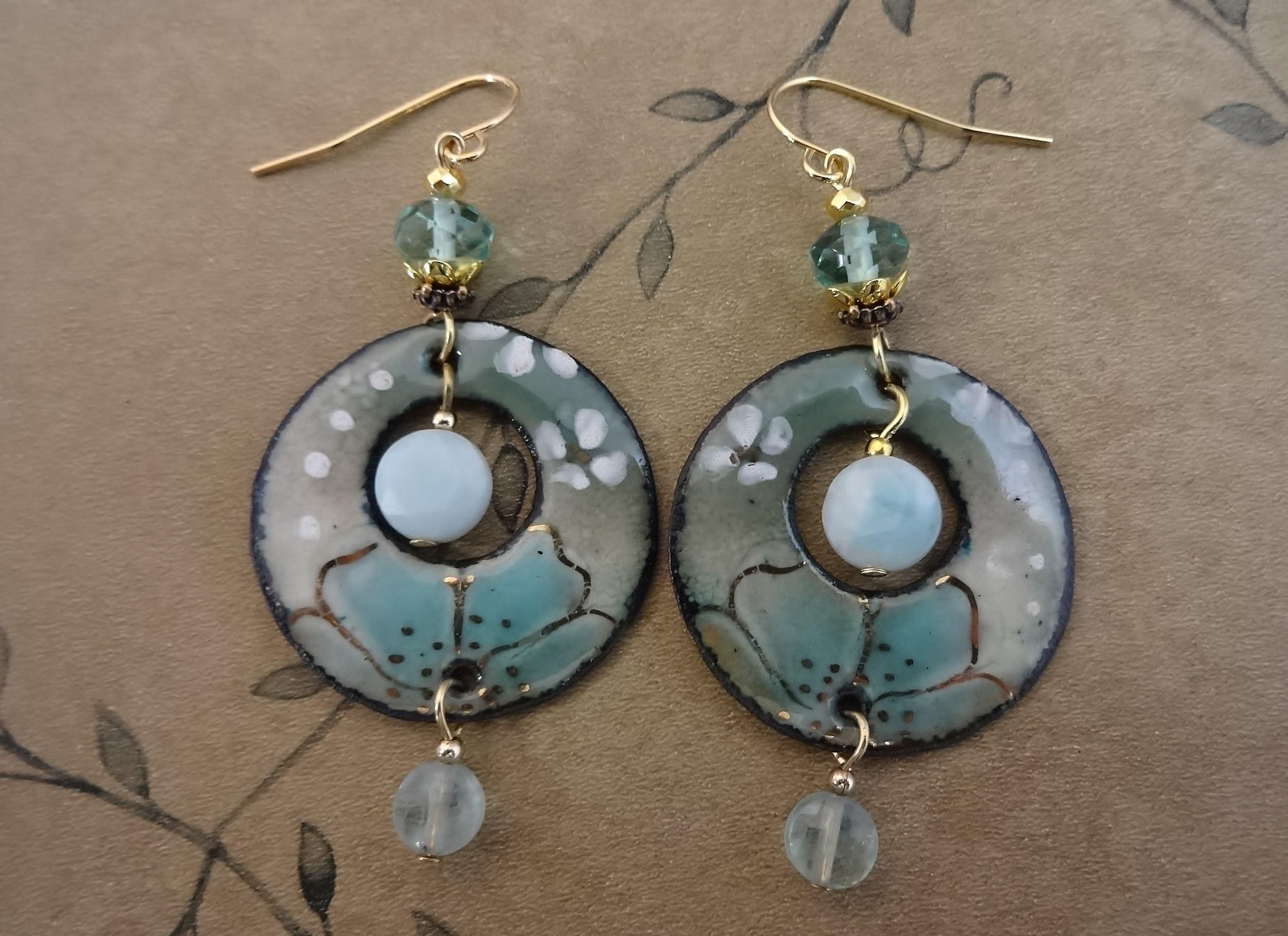 The enamel features aqua flowers outlined in gold on a pale green background with white dots on the top. Dangling in the center of the circles are Amazonite faceted coins, with Fluorite coins dangling from the bottom. At the top are beautiful, faceted Fluorite rondelles seated in gold-plated pewter bead caps with a gold-plated faceted bead on top.