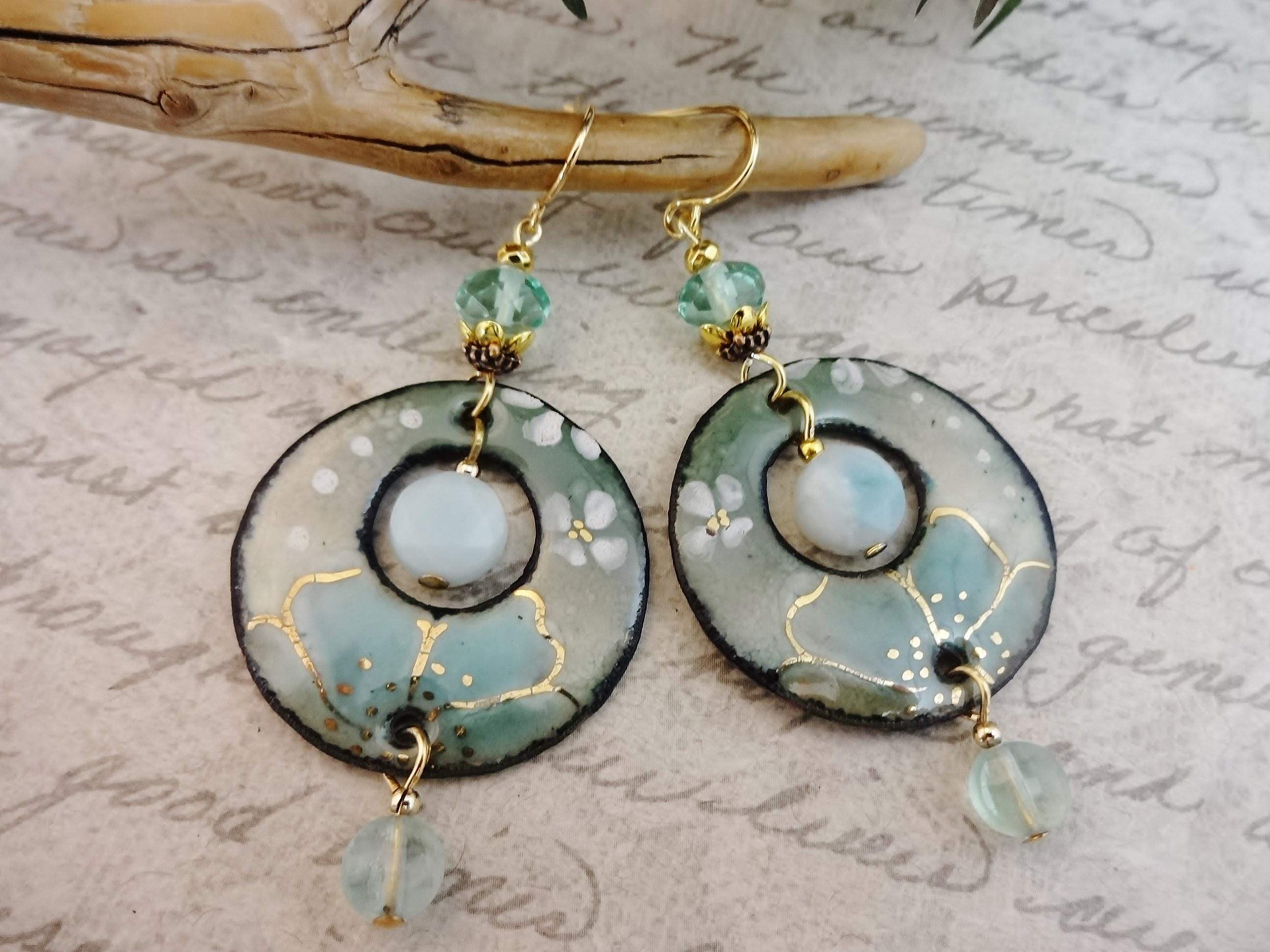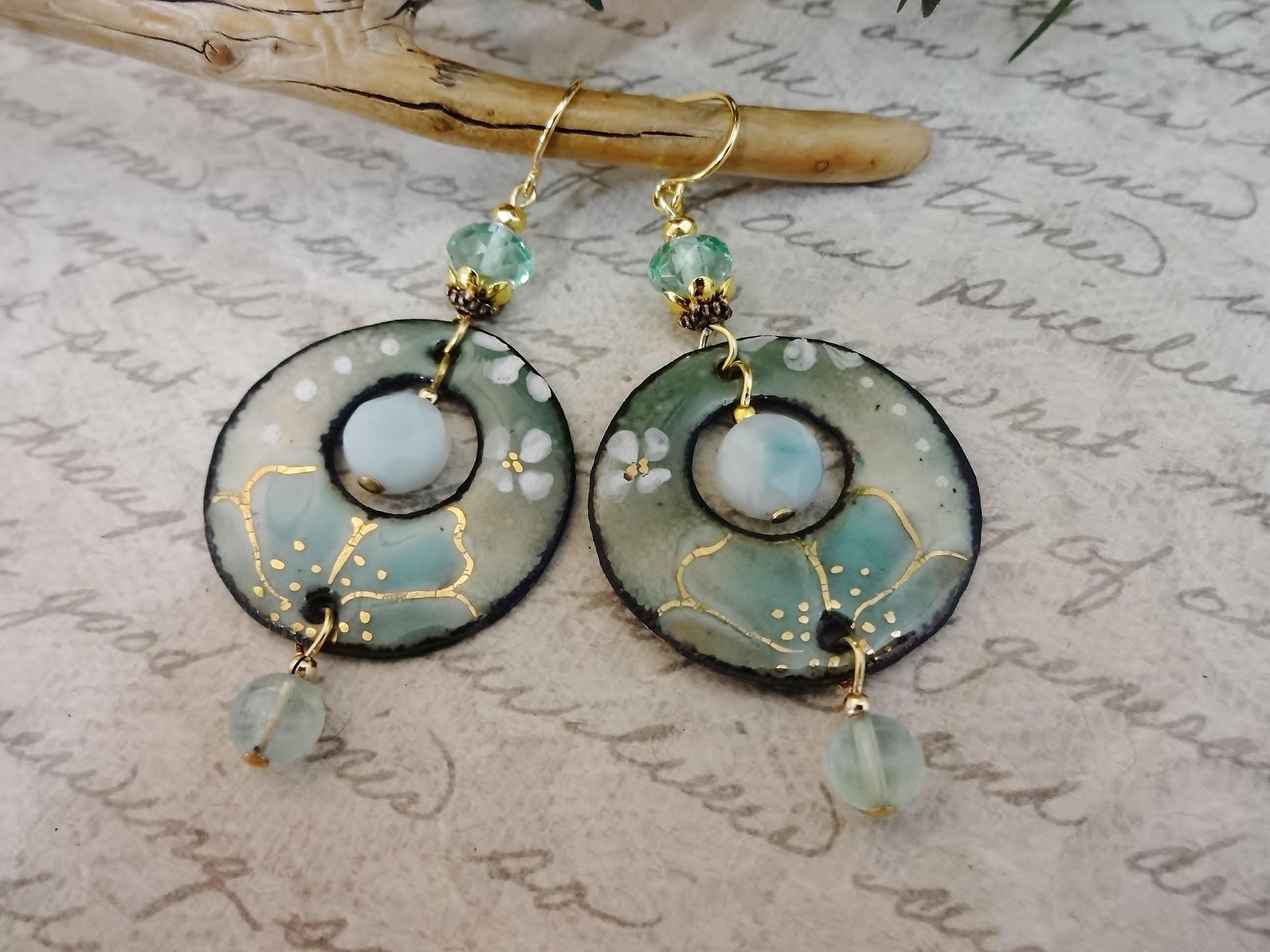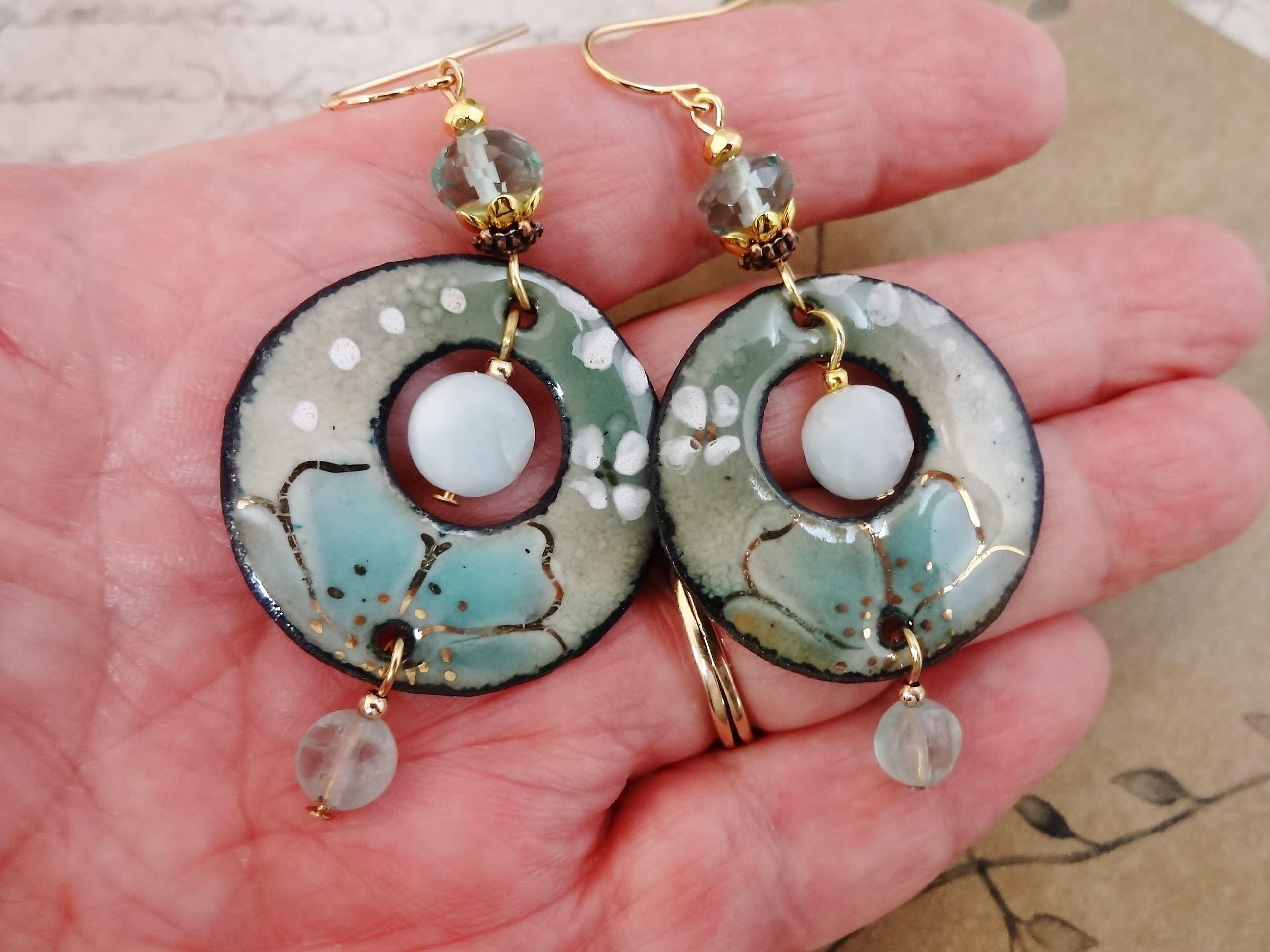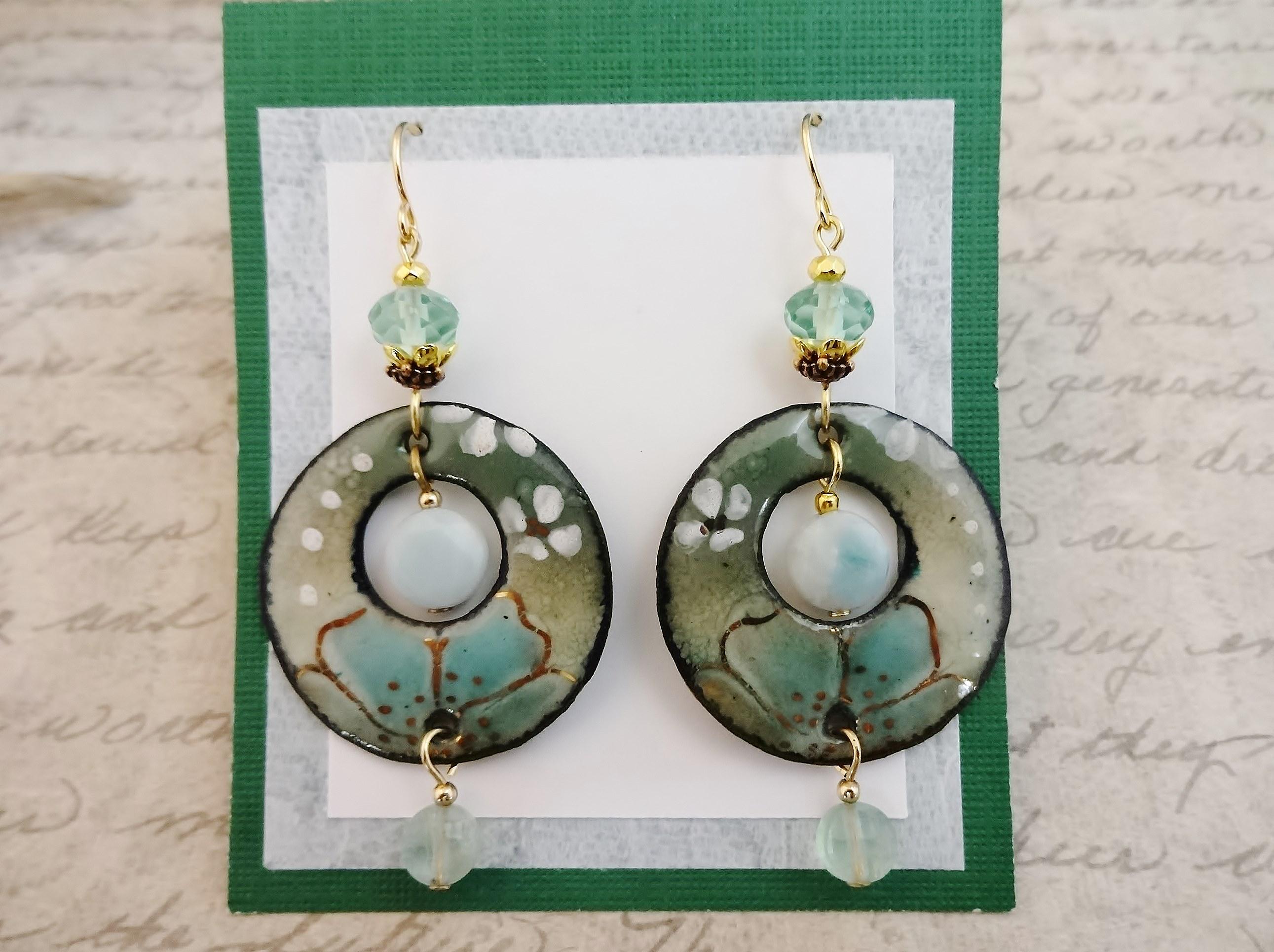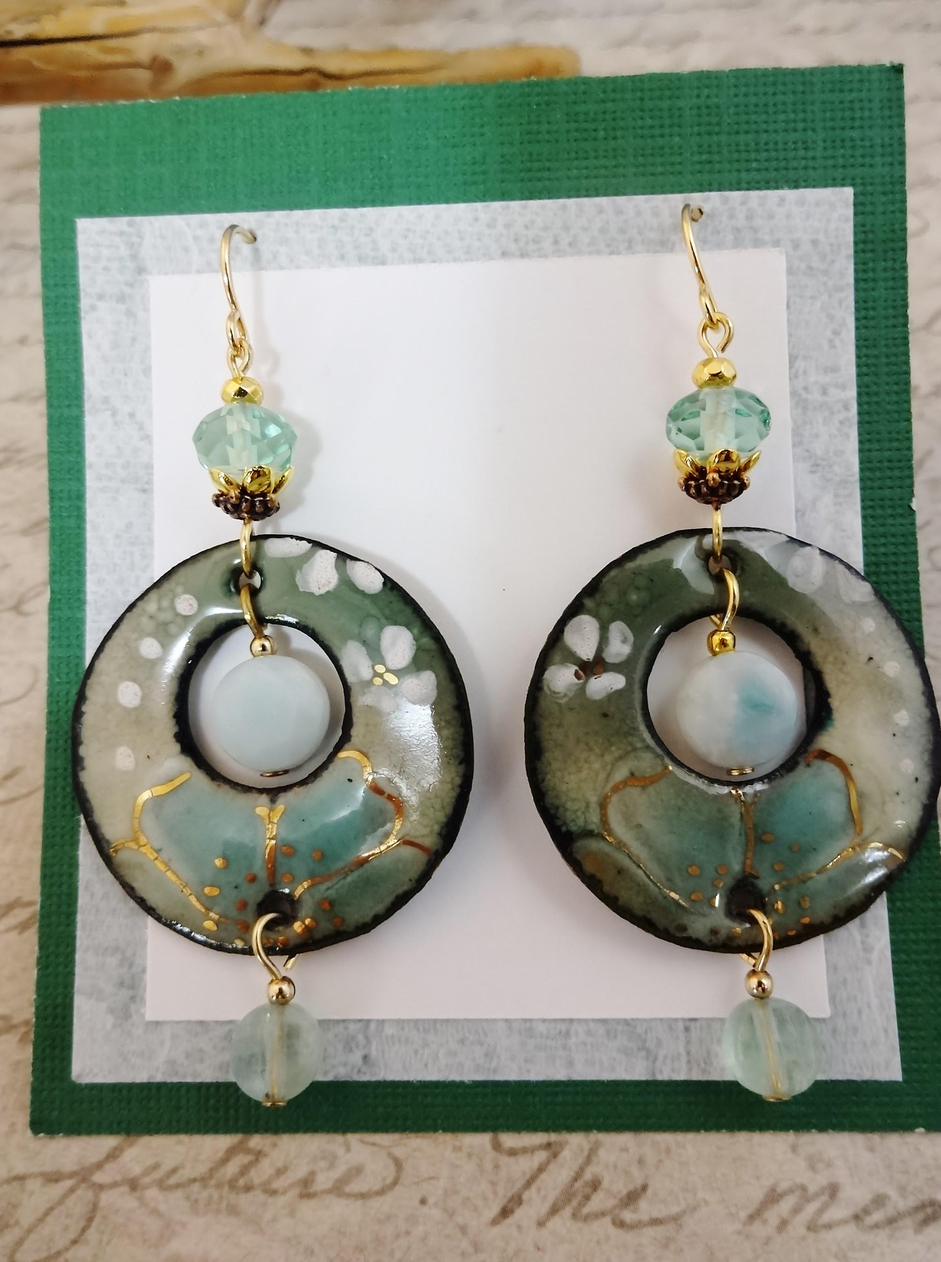 Handmade Enamel Earrings: Gold Accented Green Flowers, Fluorite and Amazonite, Artisan Handmade Earrings, Gift for Her, Real Gold Accented Enamel