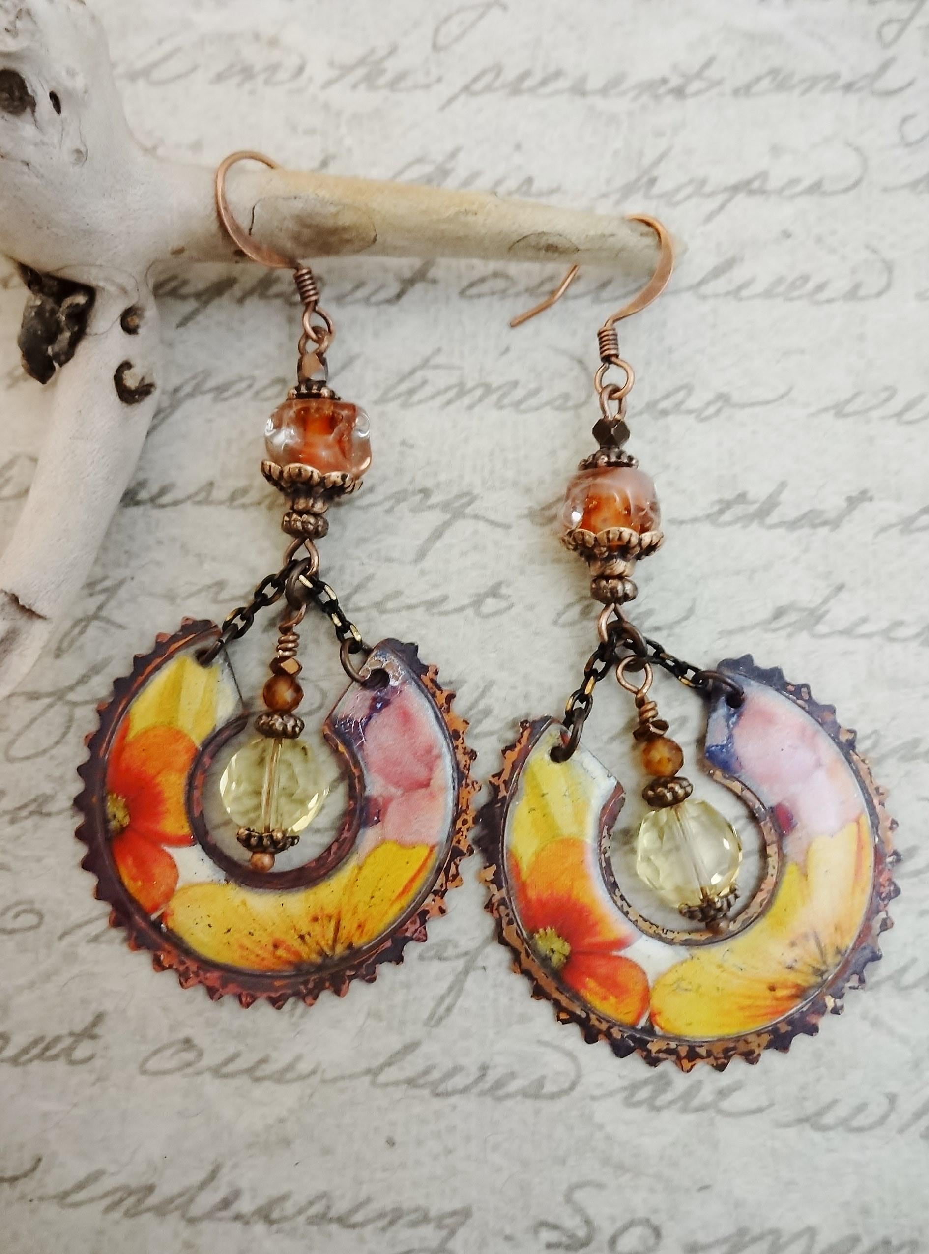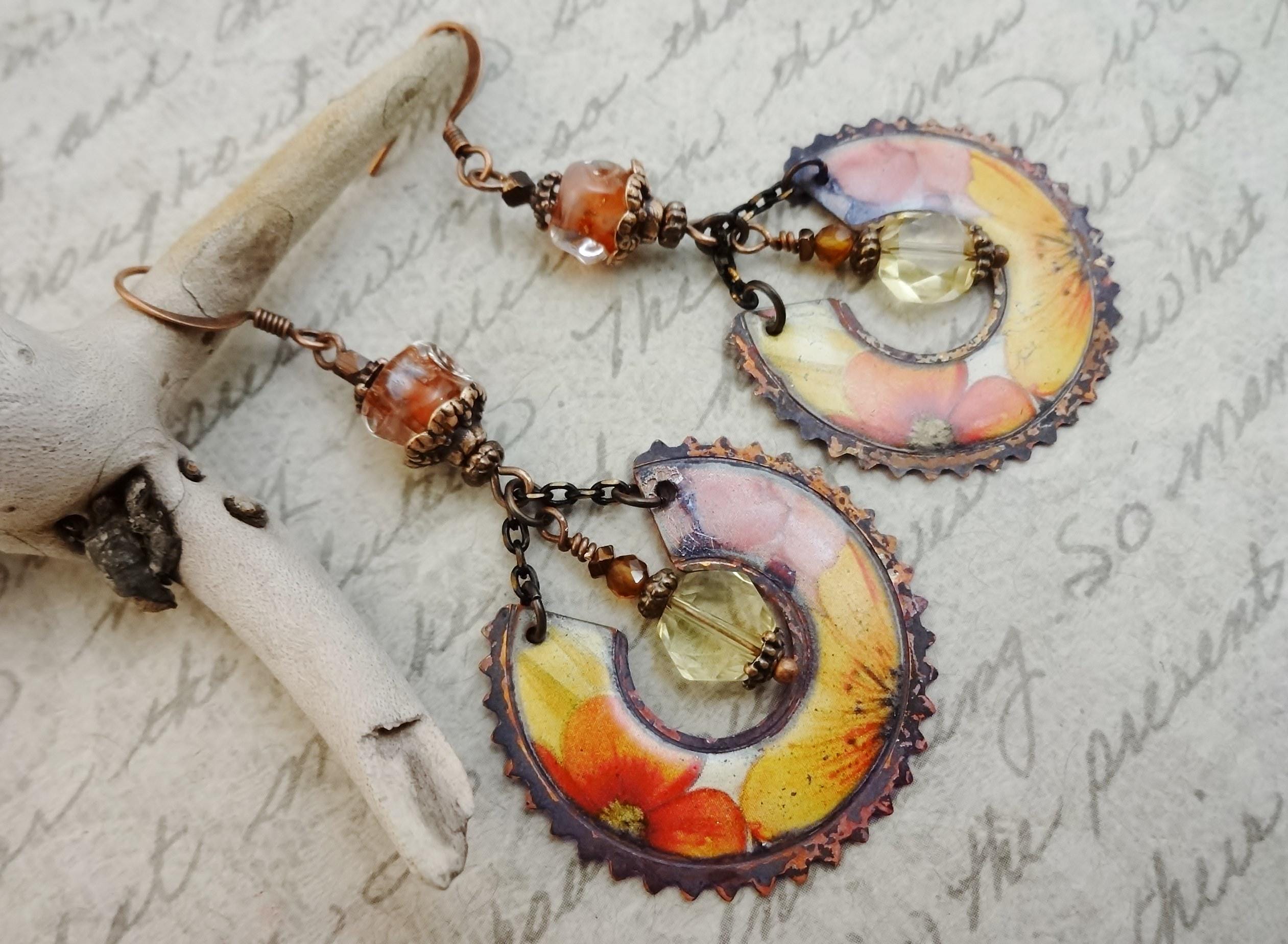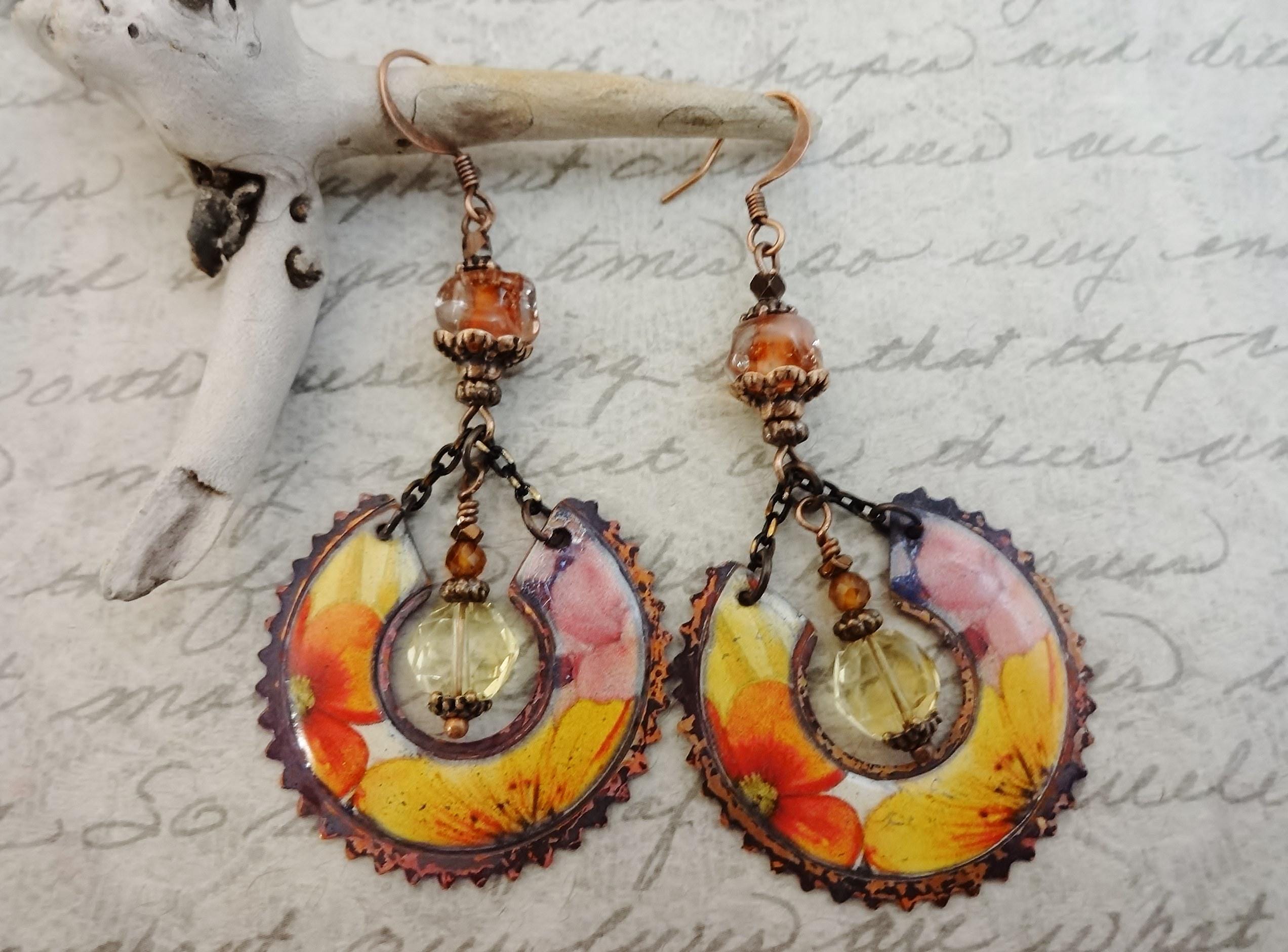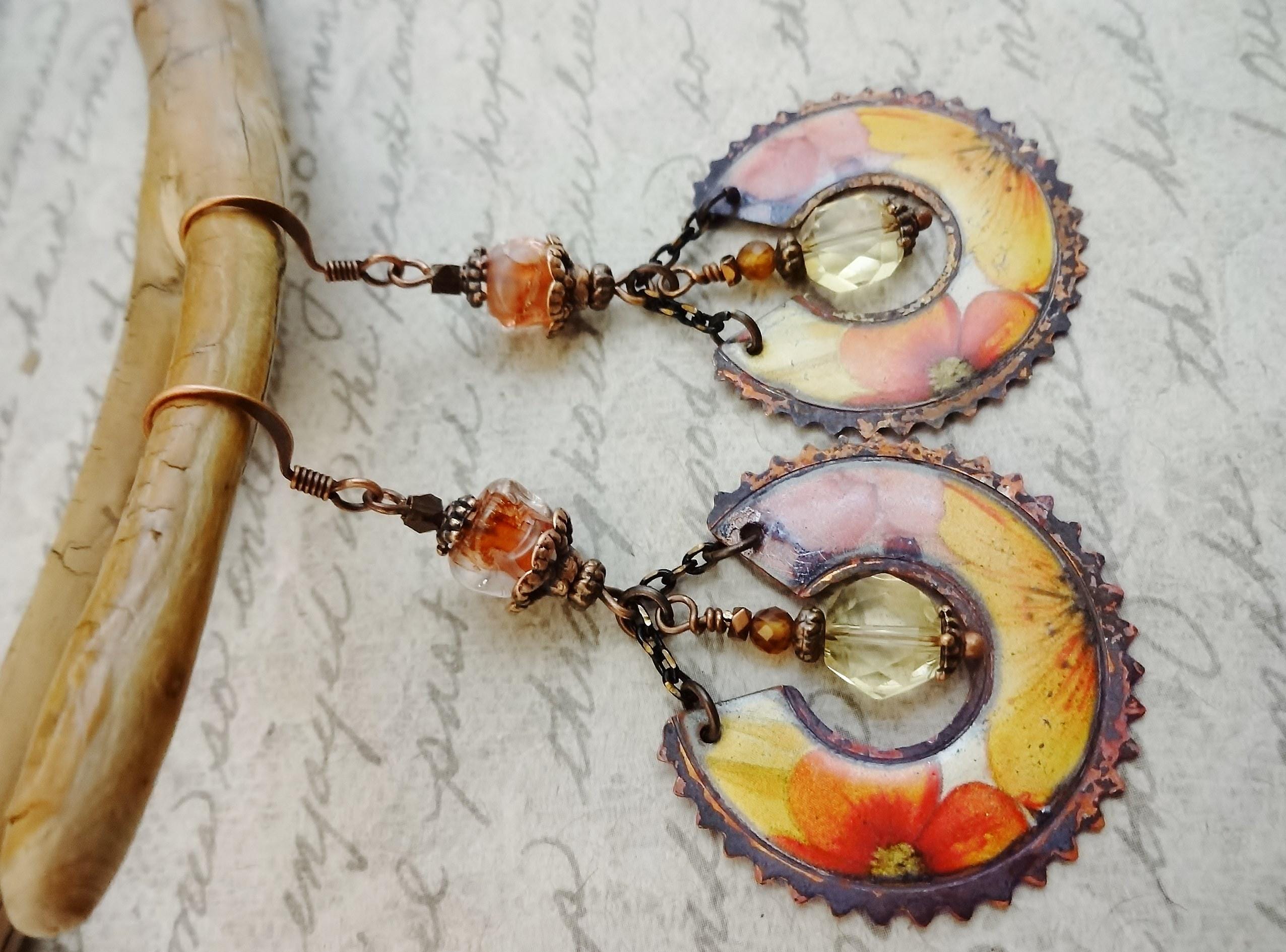 These enamel charms were made by Kimalie from Tendance Perles, a talented French artisan. The image is of yellow and orange flowers with dashes of pink complemented by the rustic raw copper edges. Strikingly beautiful!
