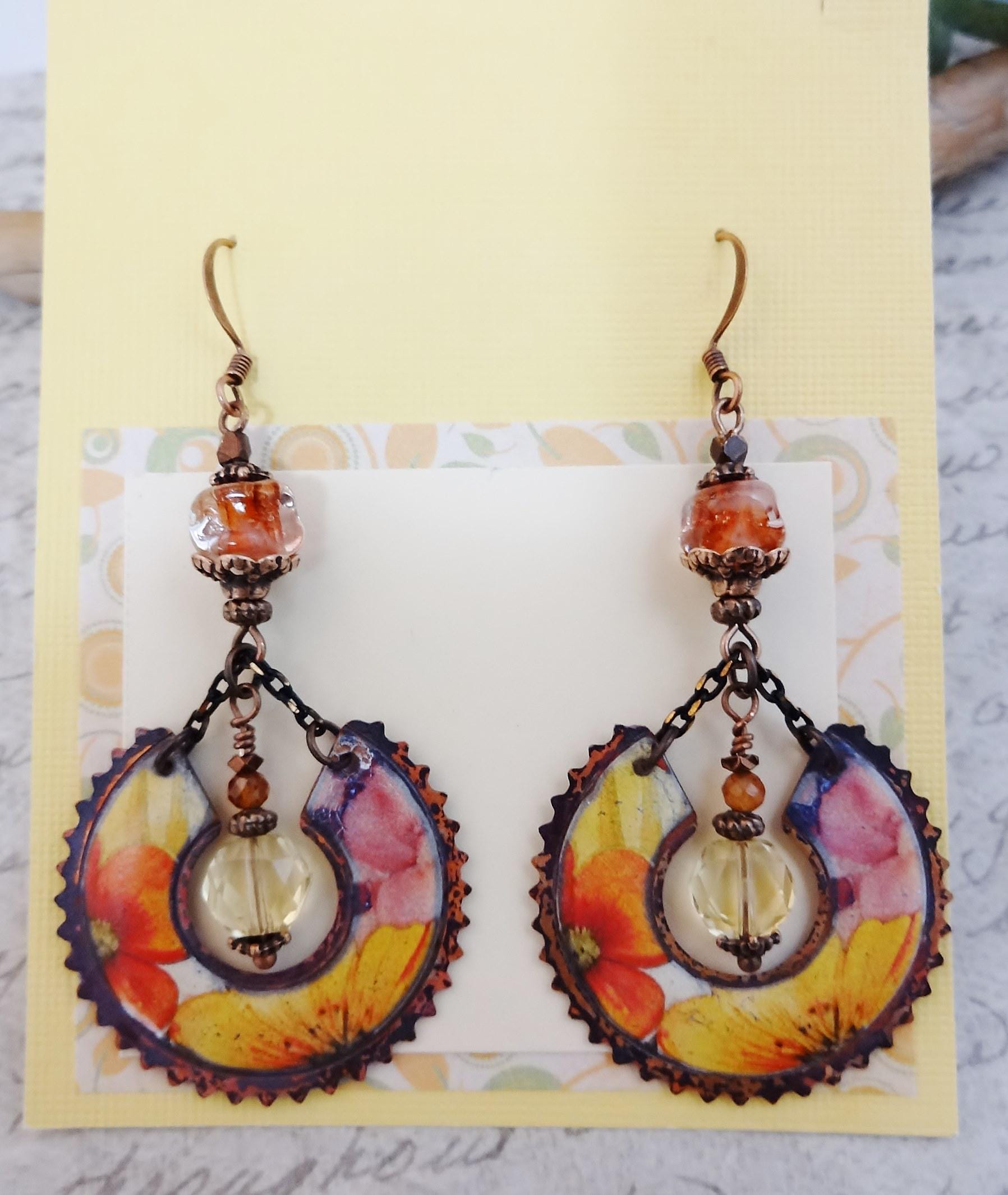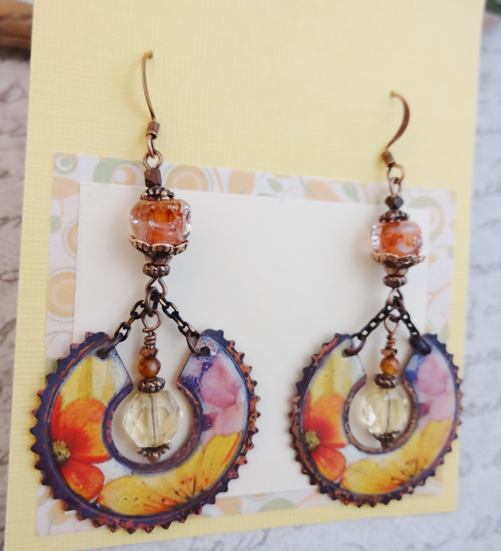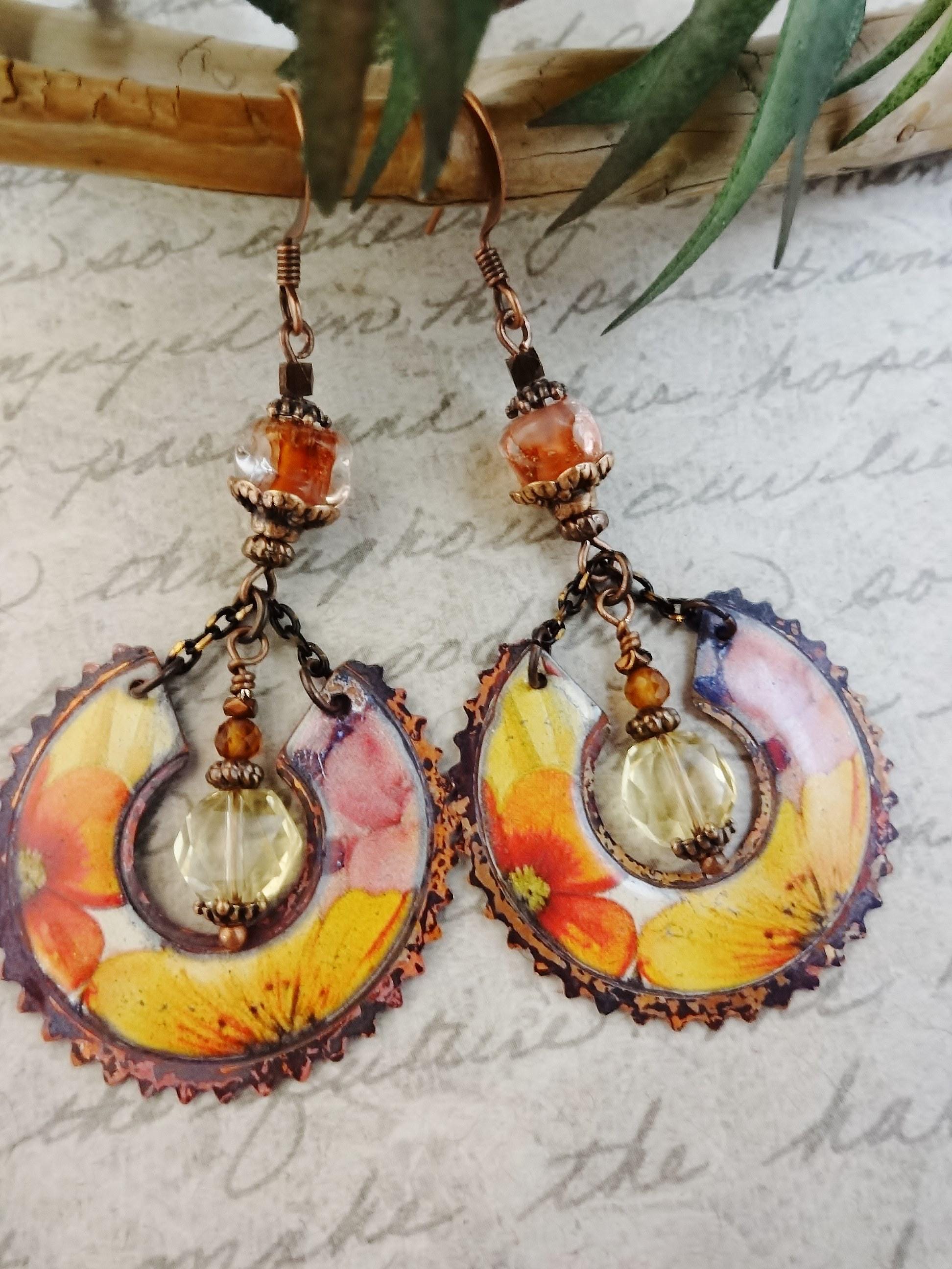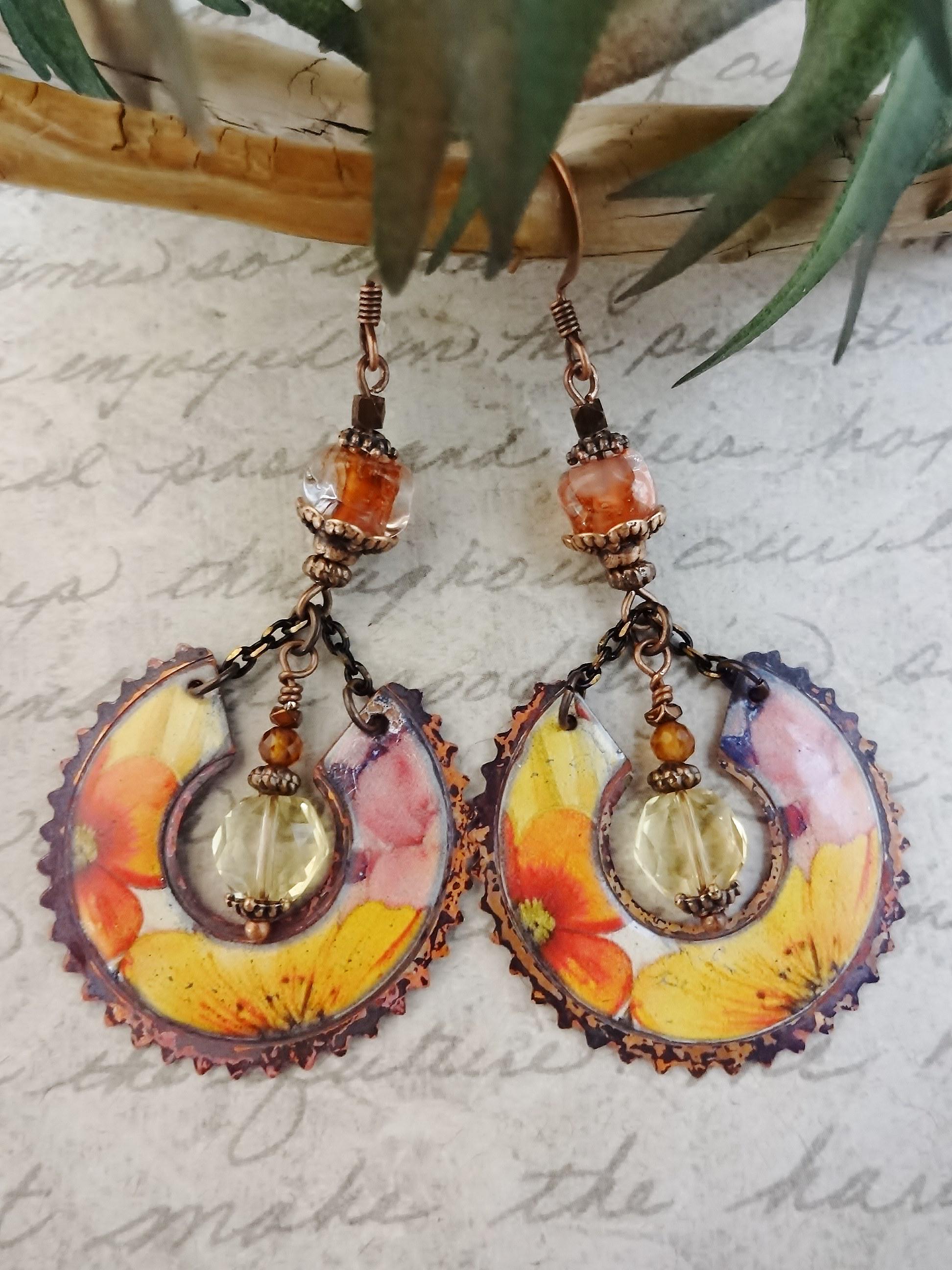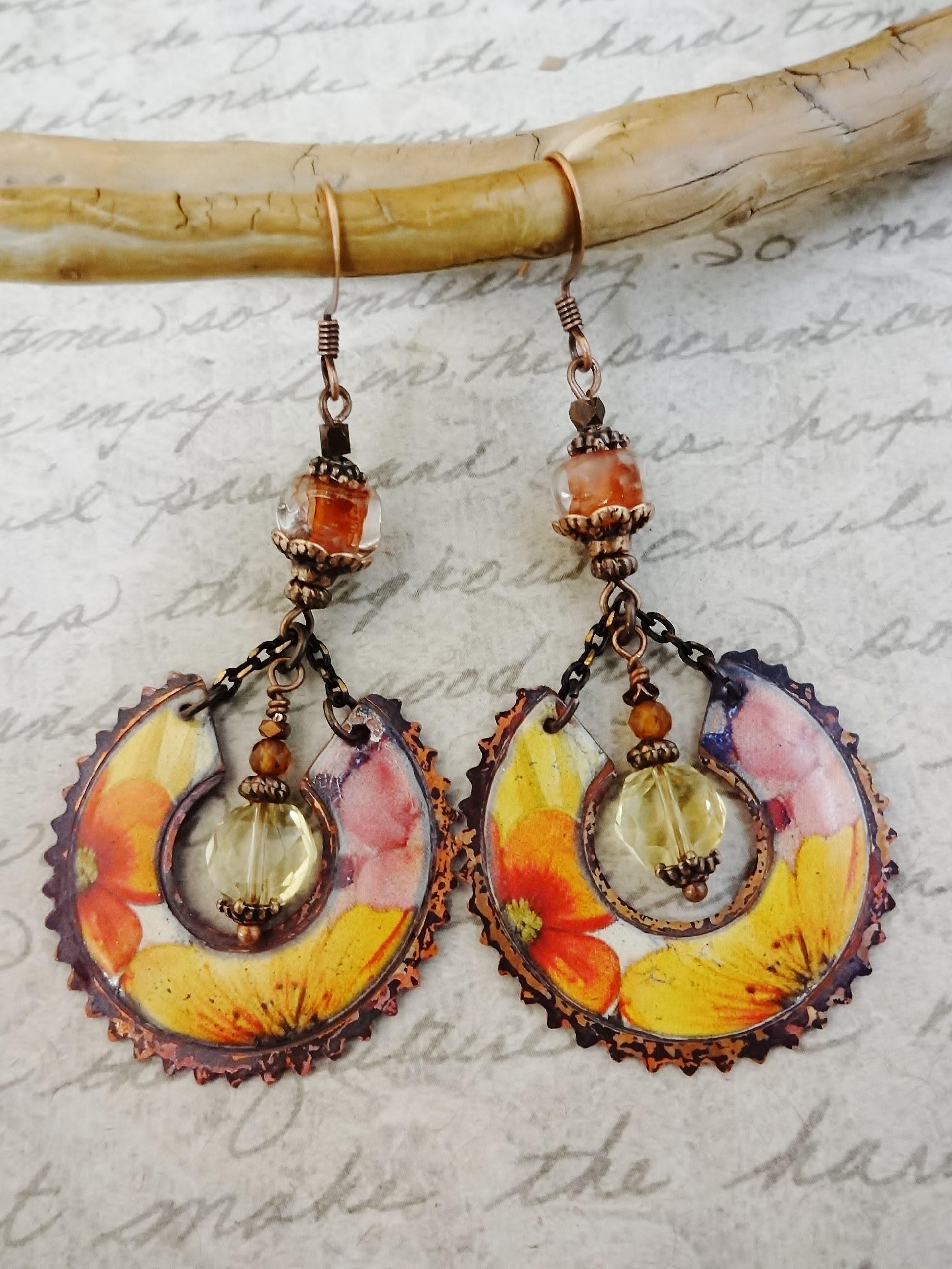 These enamel charms were made by Kimalie from Tendance Perles, a talented French artisan. The image is of yellow and orange flowers with dashes of pink complemented by the rustic raw copper edges. Strikingly beautiful!