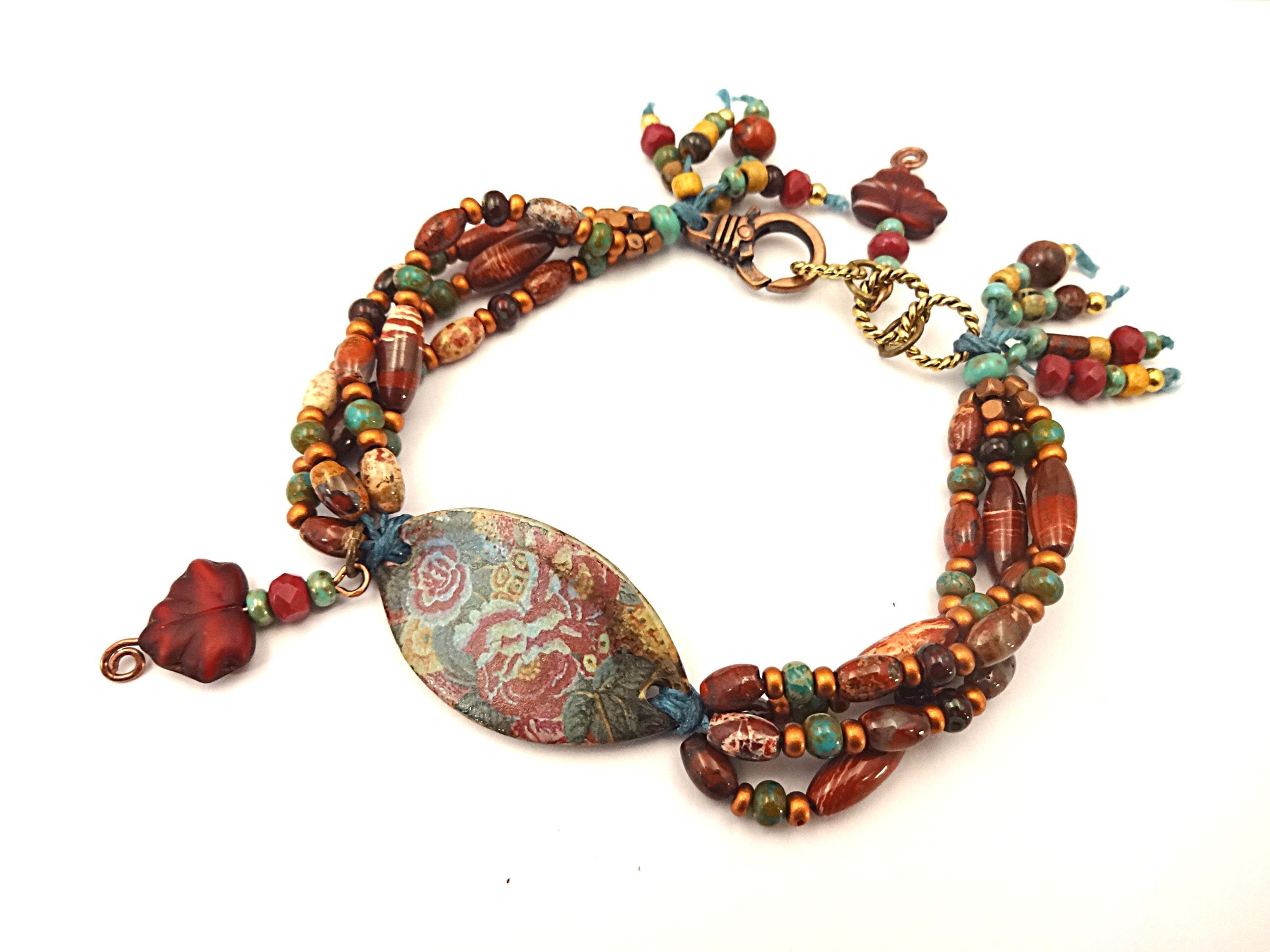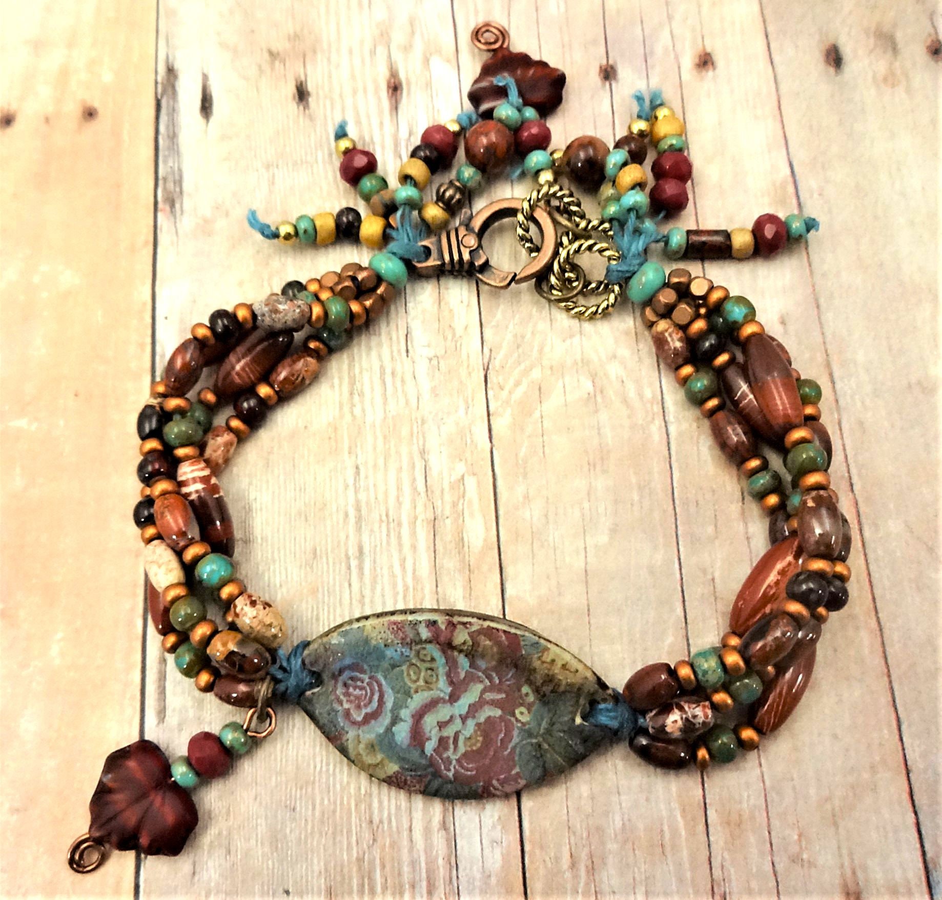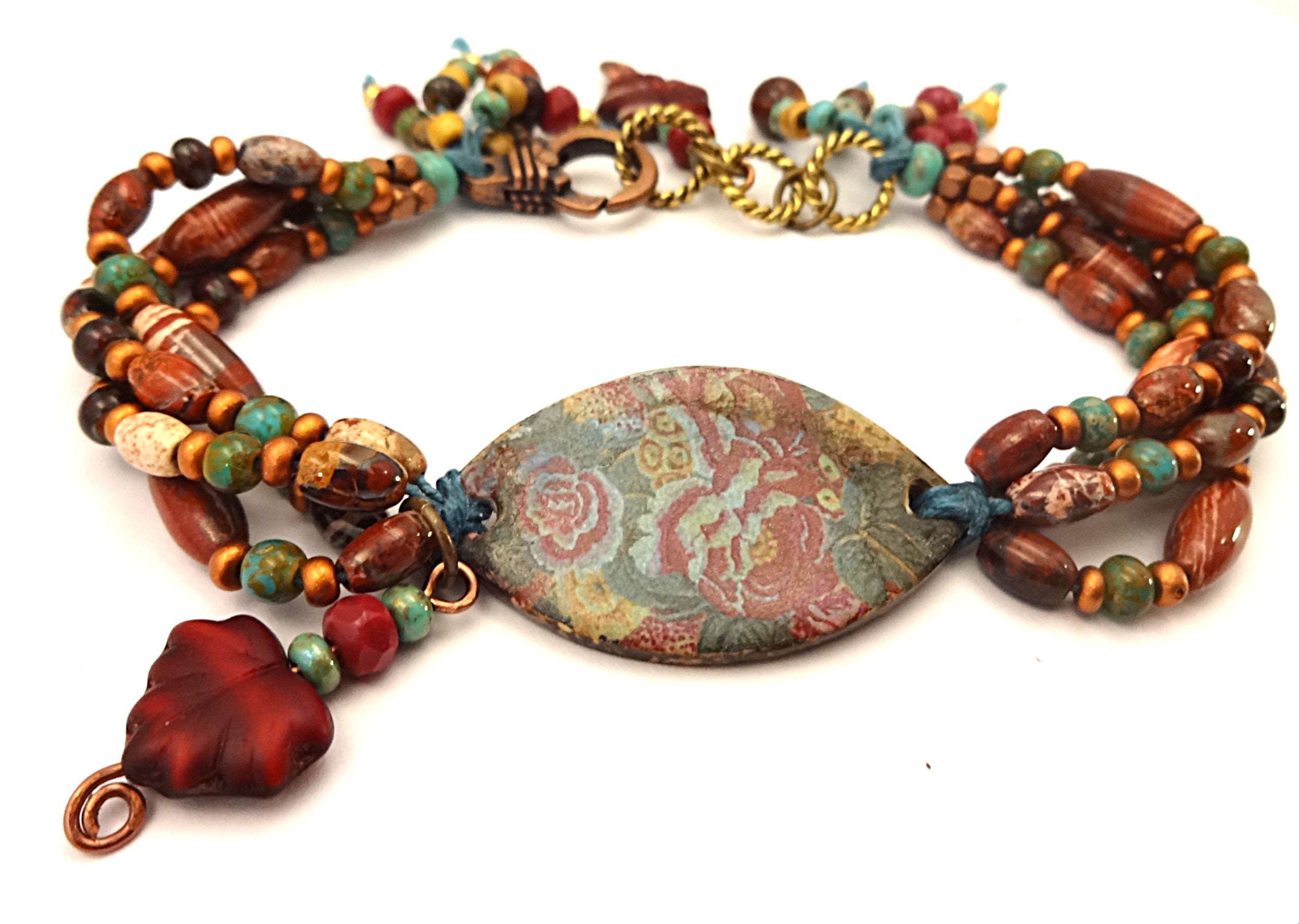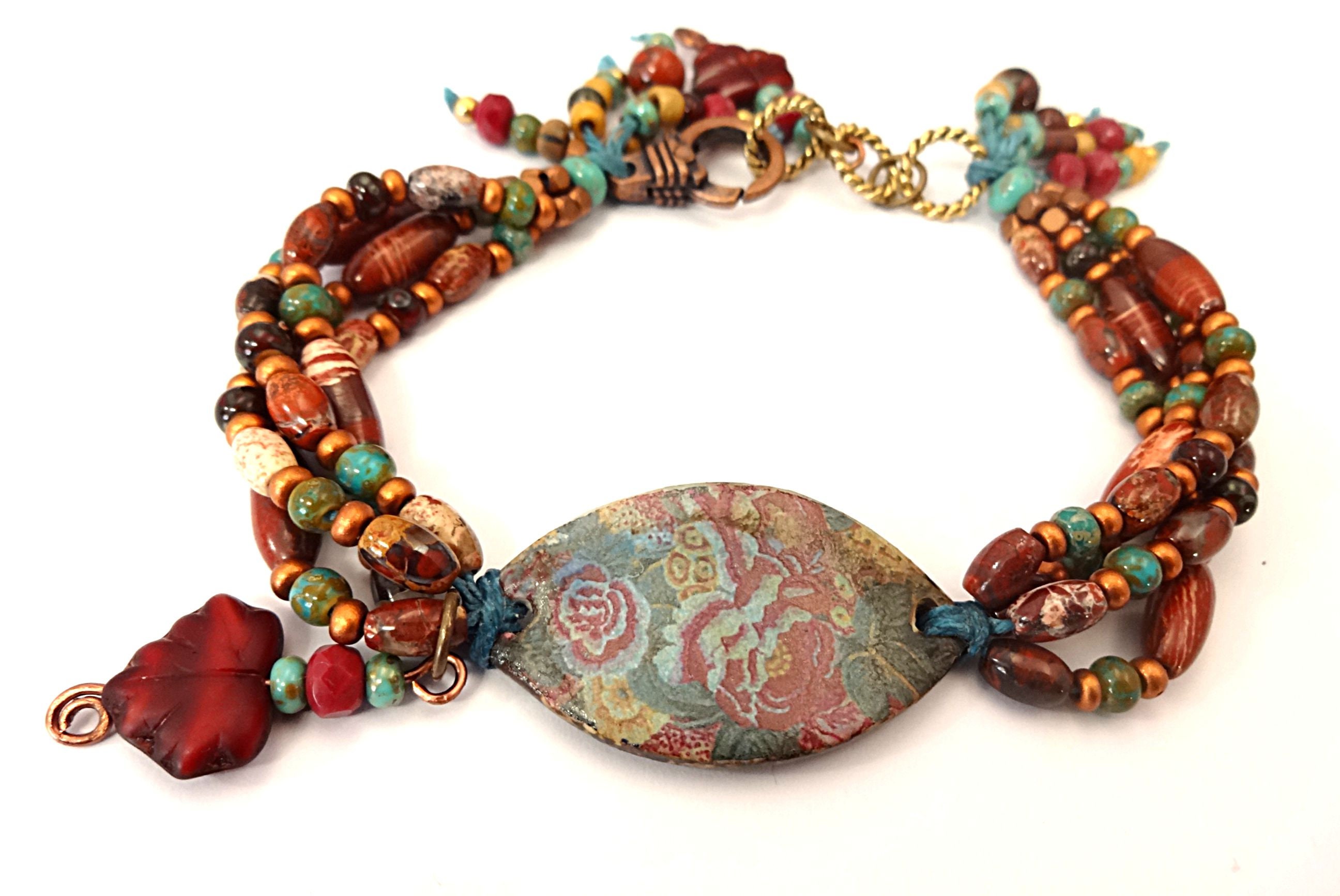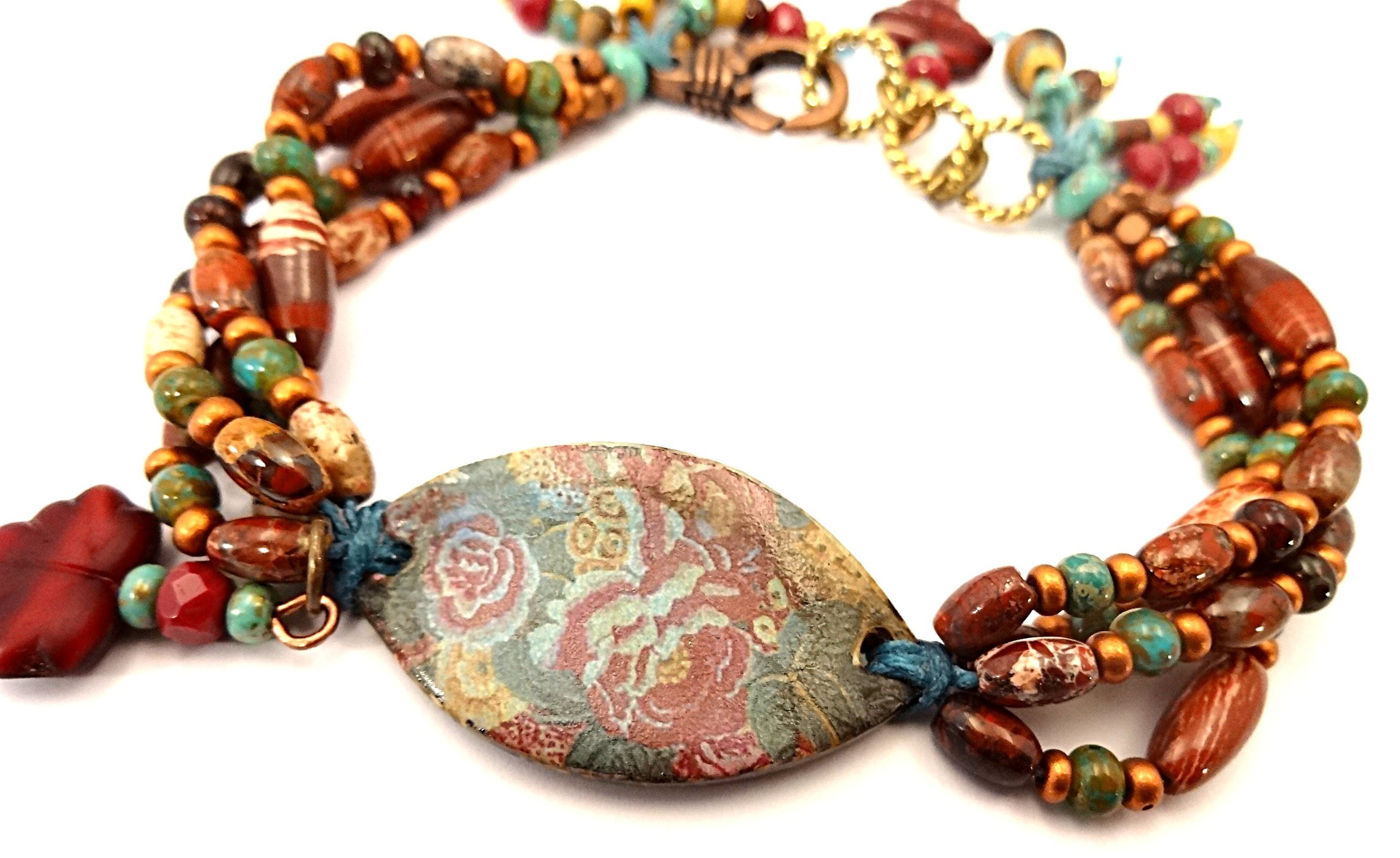 The centerpiece is a ceramic oval with red roses in a faded antique design made by Grubbi Ceramics here on Etsy. Love the vintage essence of her creations. This bracelet fell into place when I paired the ceramic piece with the dark red jaspers and turquoise picasso glass.