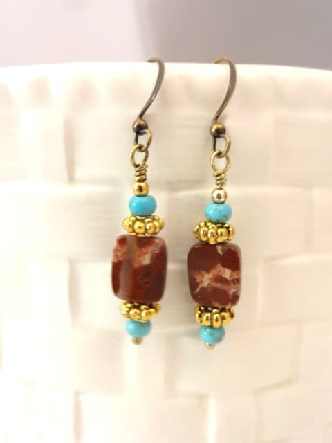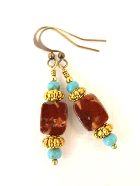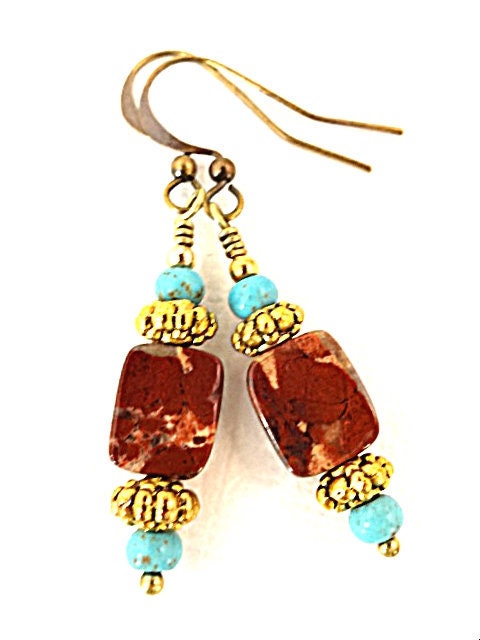 These earrings feature flat rectangles of Poppy Jasper, also known as Brecciated Jasper. They are dark maroon with streaks of lighter red. Fancy gold rondelles separate the rectangles from small Turquoise rondelles. These are real Turquoise, though they have been stablized.