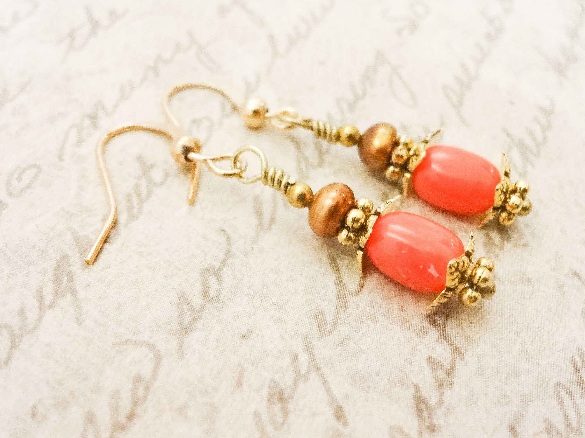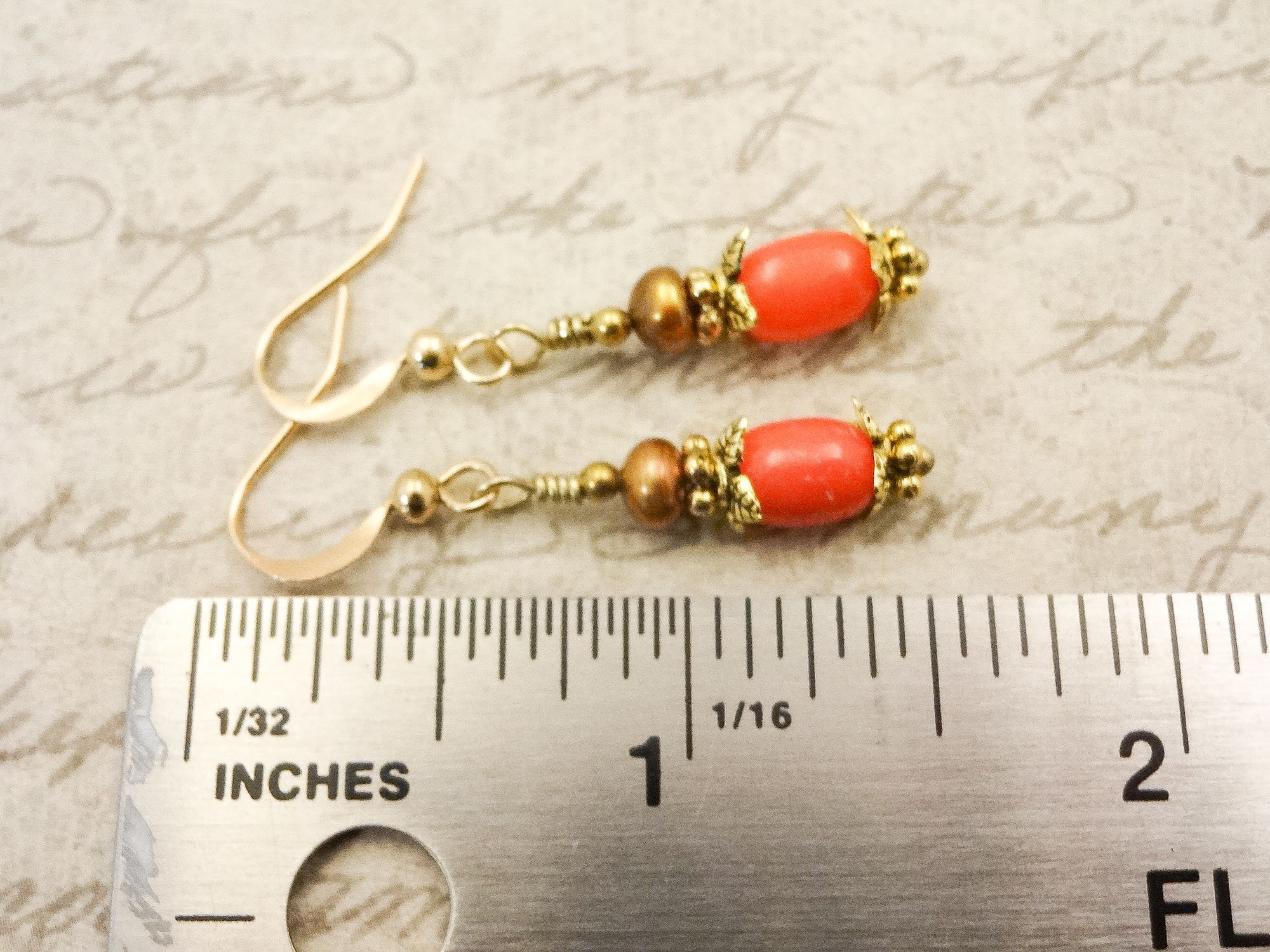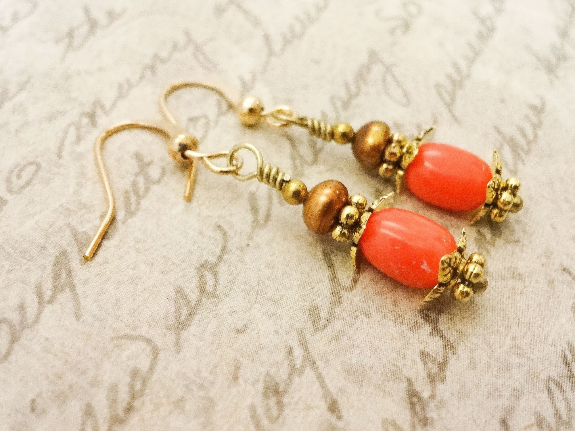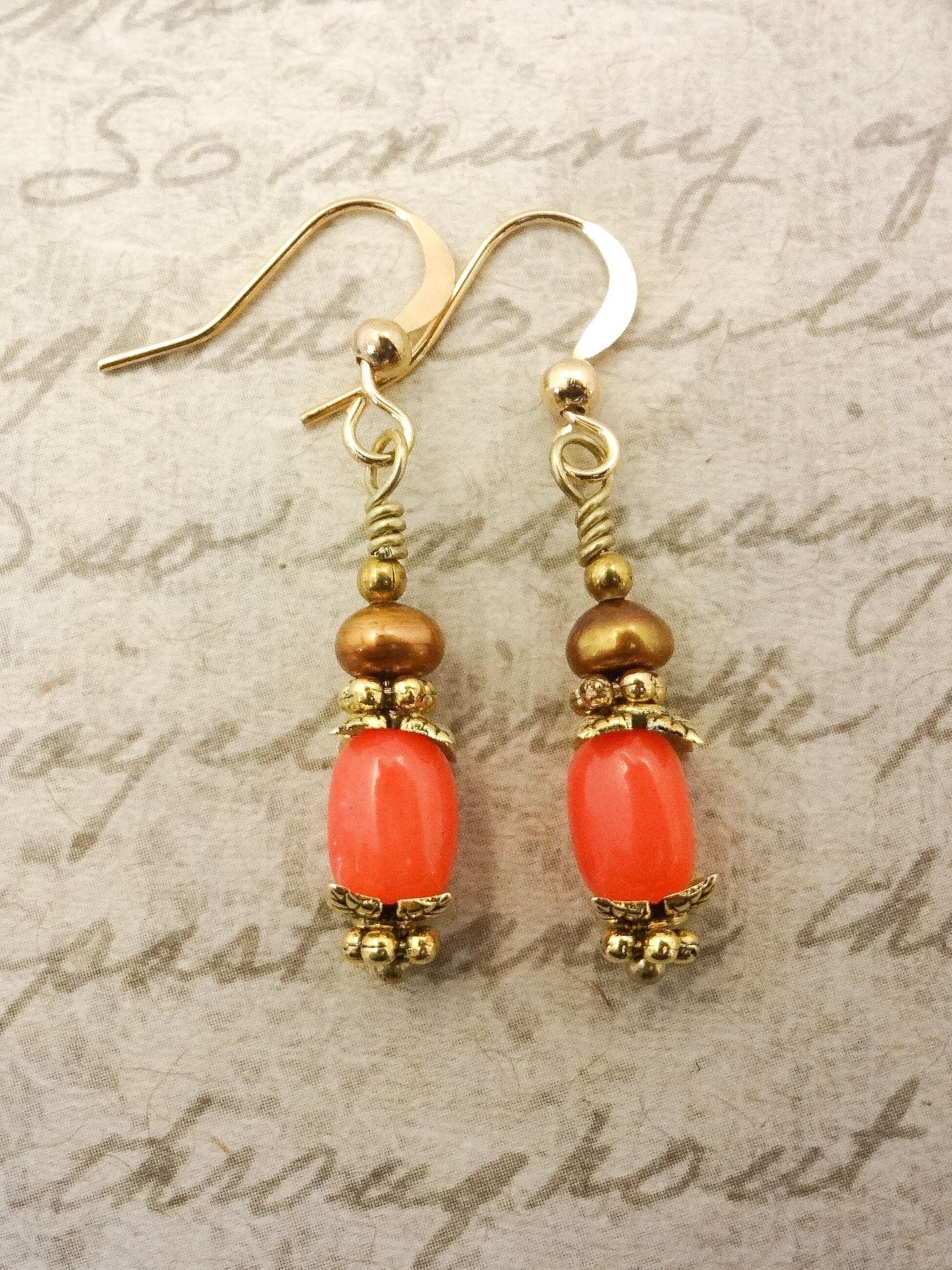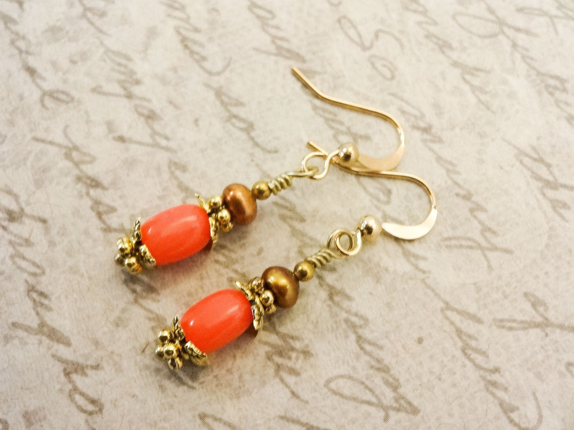 These earrings feature peachy Coral in a rounded barrel shape with darker gold freshwater pearls on top. Leaf-shaped gold bead caps give these simple earrings distinction.