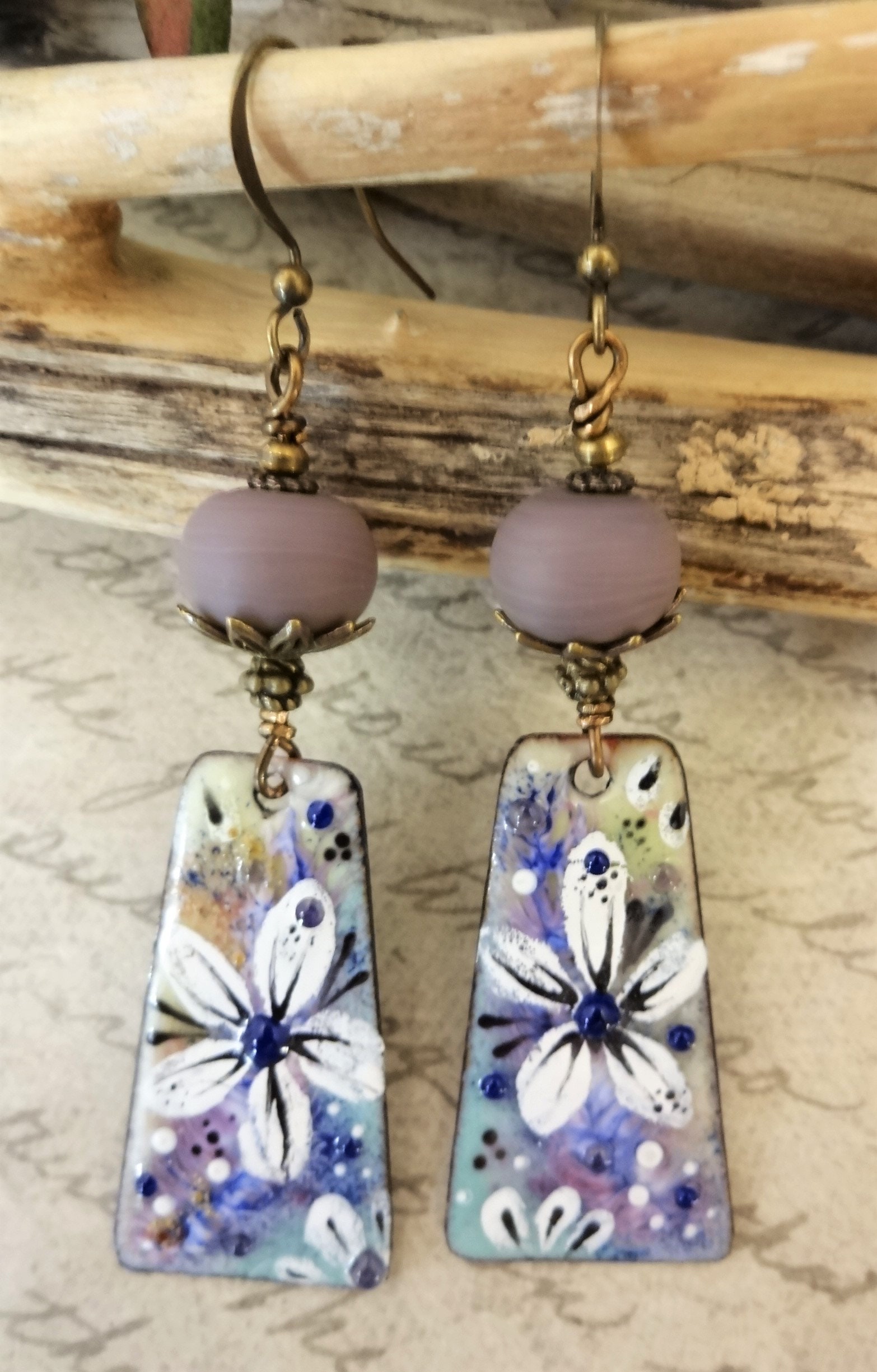 These enamel charms are gorgeous - it's hard to photograph enamel and give a good representation of the depth and beauty of the designs. These are exquisite - and I believe in letting the enamels shine - so my additions are few - matte glass lampworked beads in a dark lavender and antique brass metals - bead caps, spacer beads, wire and ear wires.
